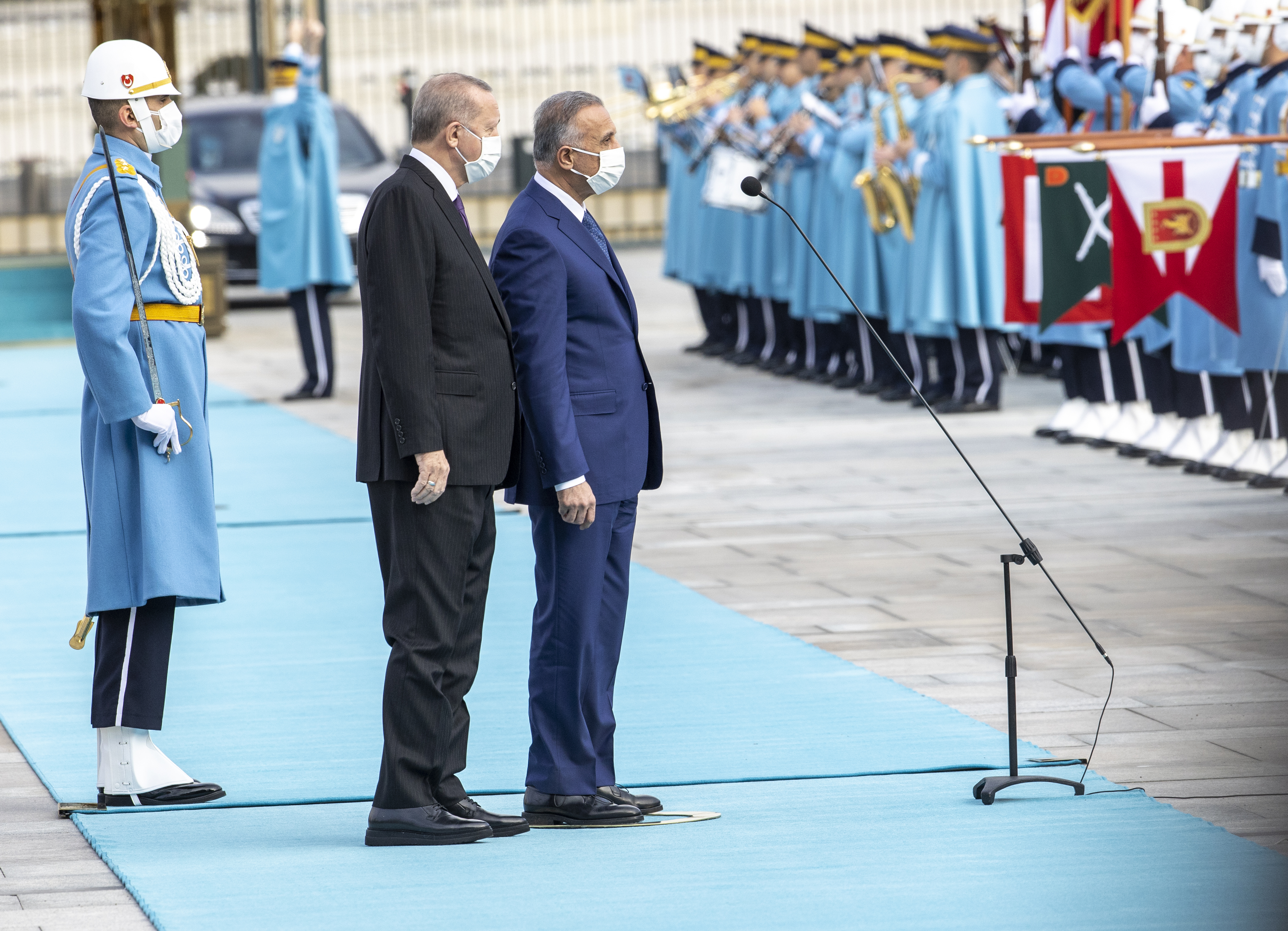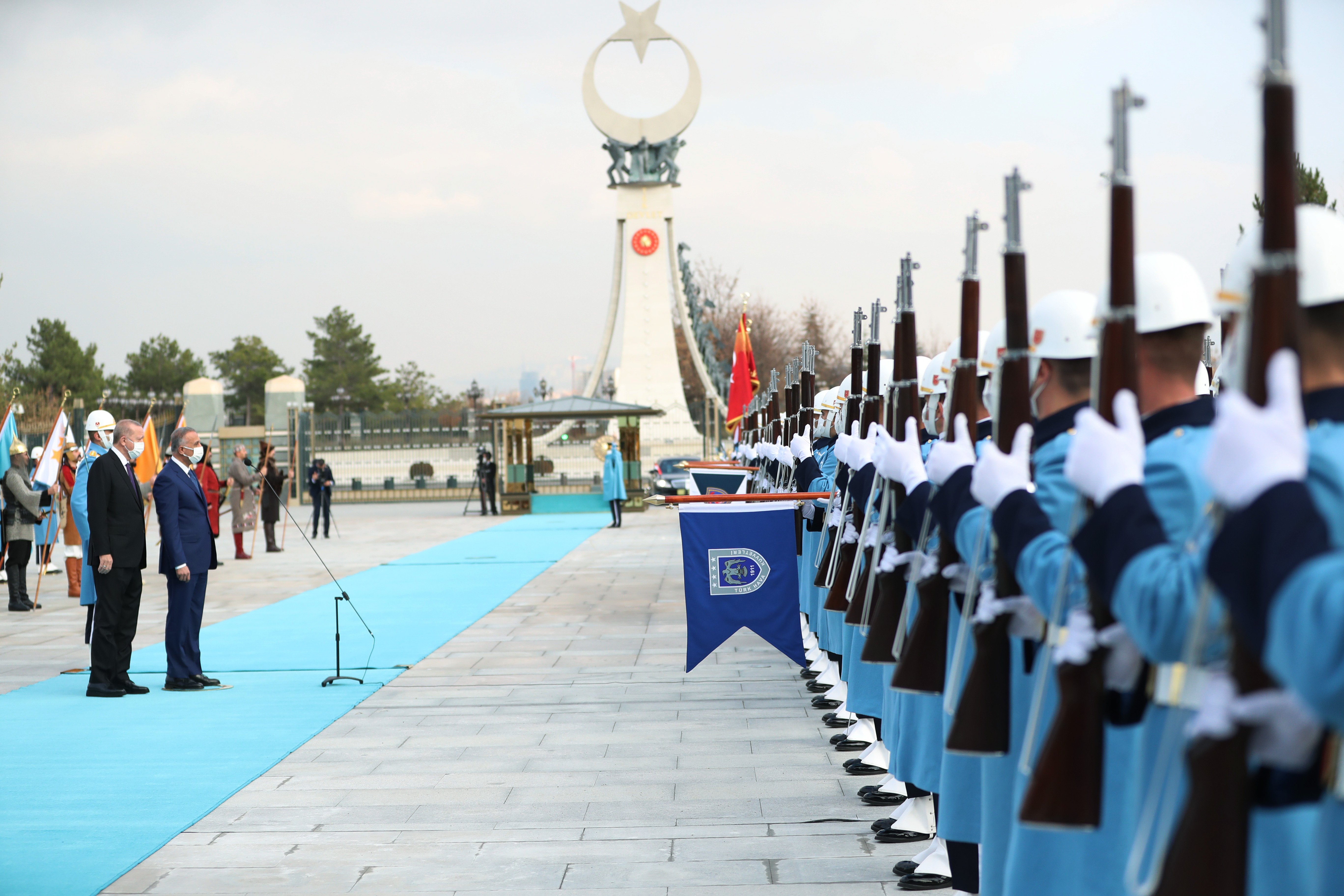 Cumhurbaşkanı Erdoğan ve Irak Başbakanı Kazımi'nin tören alanındaki yerlerini almalarının ardından, 21 pare top atışı eşliğinde iki ülkenin milli marşları çalındı.