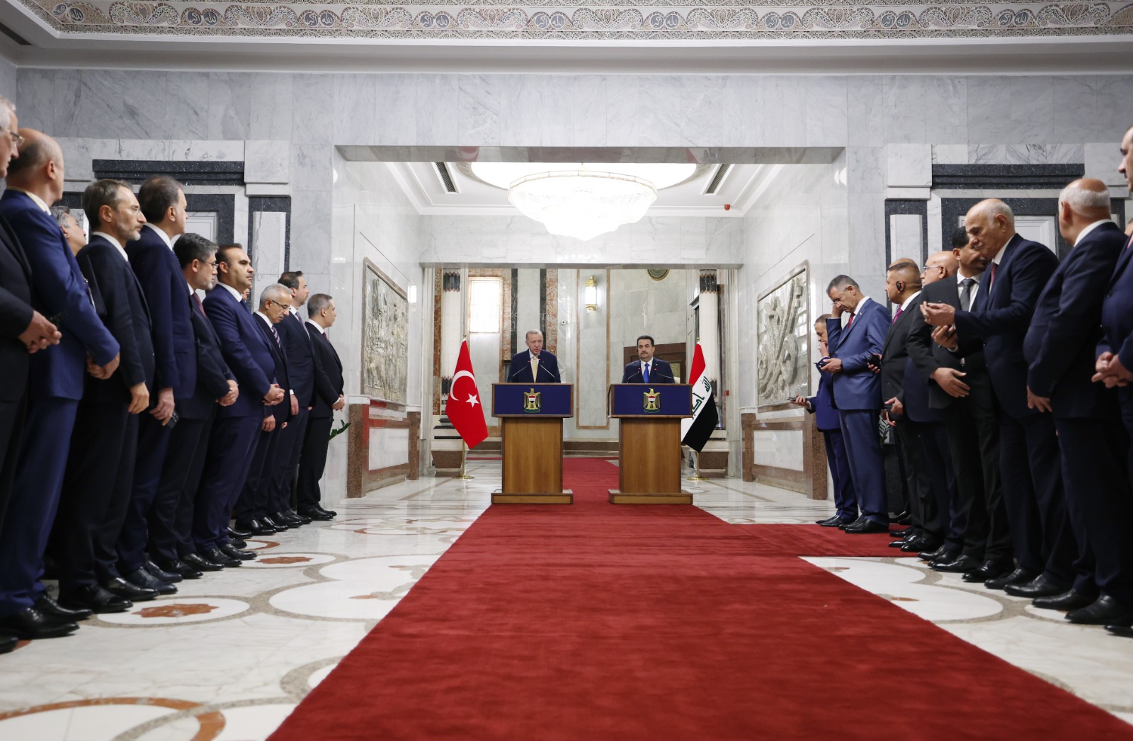 Cumhurbaşkanı Recep Tayyip Erdoğan, Bağdat'taki resmi programları kapsamında, baş başa ve heyetler arası görüşmelerin ardından Irak Başbakanı Muhammed Şiya es-Sudani ile Bağdat'taki Hükûmet Sarayı'nda düzenlenen ortak basın toplantısında konuştu.