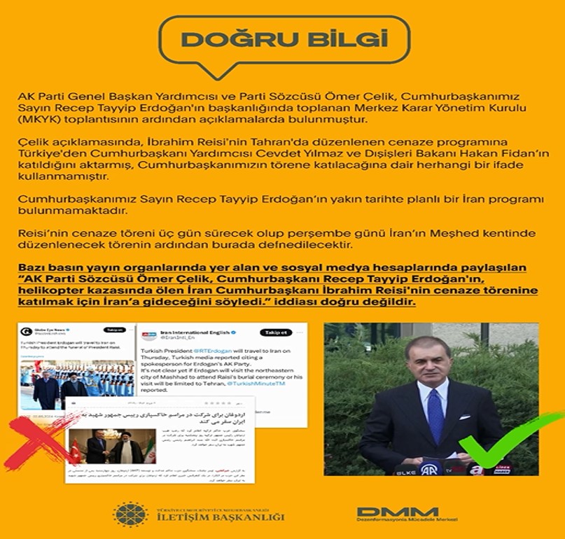 Bazı basın yayın organlarında yer alan ve sosyal medya hesaplarında paylaşılan “AK Parti Sözcüsü Ömer Çelik, Cumhurbaşkanı Recep Tayyip Erdoğan'ın, helikopter kazasında ölen İran Cumhurbaşkanı İbrahim Reisi'nin cenaze törenine katılmak için İran’a gideceğini söyledi.” iddiası doğru değildir.