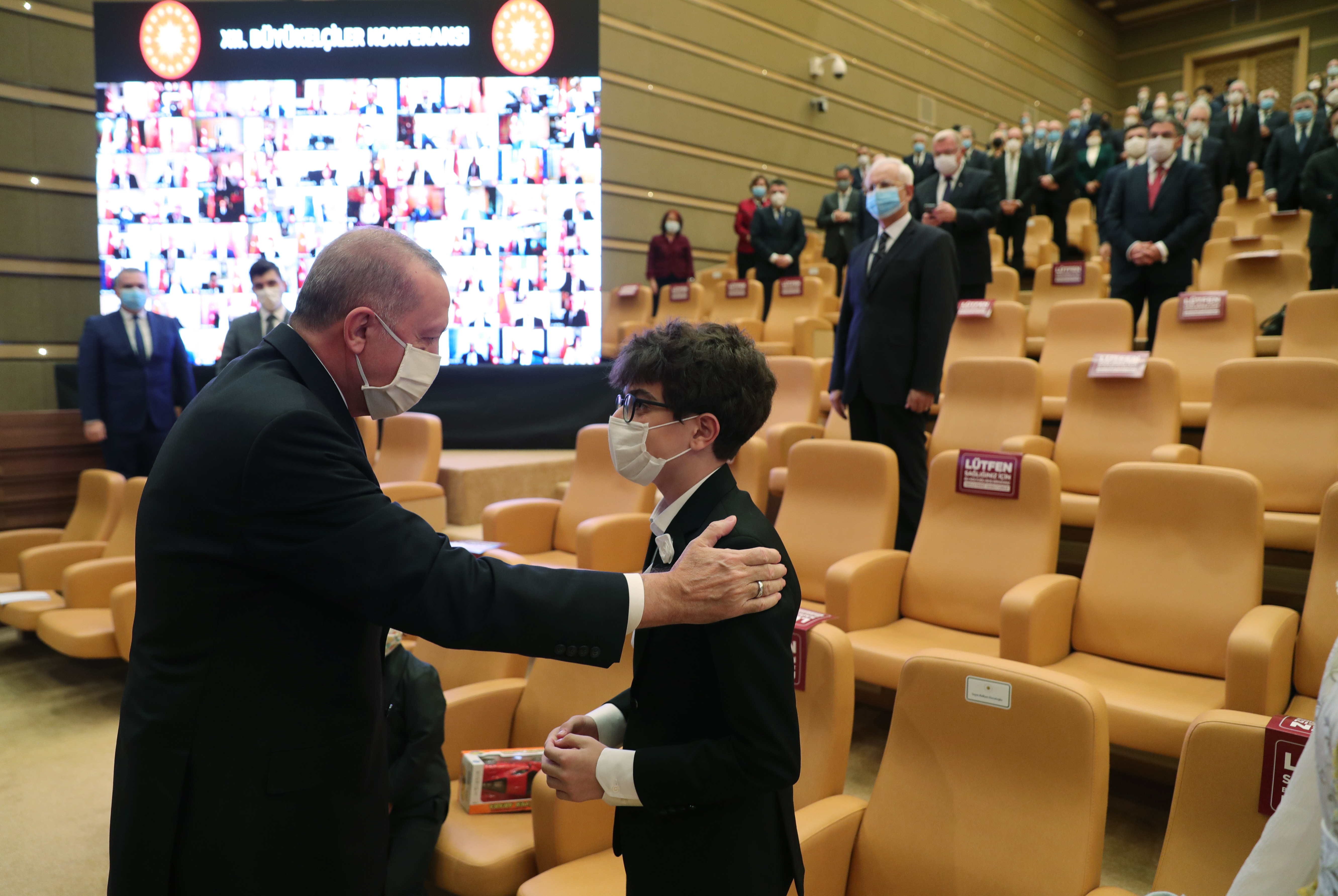 Büyükelçileri gayretleri ve emekleri için tebrik eden Cumhurbaşkanı Erdoğan, "Bu toplantımız ilk çevrimiçi büyükelçiler konferansı olmasının yanı sıra bu çapta yerli yazılımla gerçekleştirilen ilk resmi programdır. Cumhurbaşkanlığı Dijital Dönüşüm Ofisimizi, bu teknolojik altyapıyı ülkemize kazandıran Türk mühendislerini de ayrıca kutluyorum. Toplantımızın ülkemiz, milletimiz ve hariciye teşkilatımız için hayırlara vesile olmasını Rabbimden niyaz ediyorum." diye konuştu.