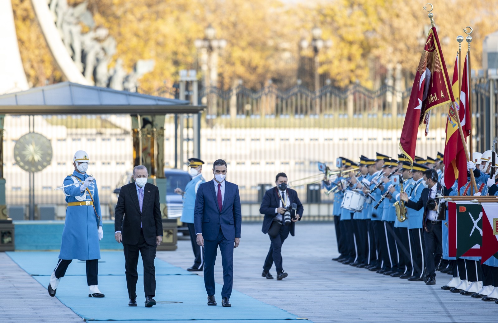 Cumhurbaşkanı Erdoğan, Pedro Sanchez'i Cumhurbaşkanlığı Külliyesi'nin ana giriş kapısında karşıladı. Cumhurbaşkanı Erdoğan ve İspanya Başbakanı Sanchez'in tören alanındaki yerlerini almalarının ardından, 21 pare top atışı eşliğinde iki ülkenin milli marşları çalındı.