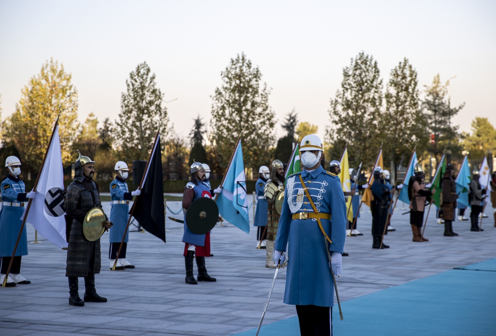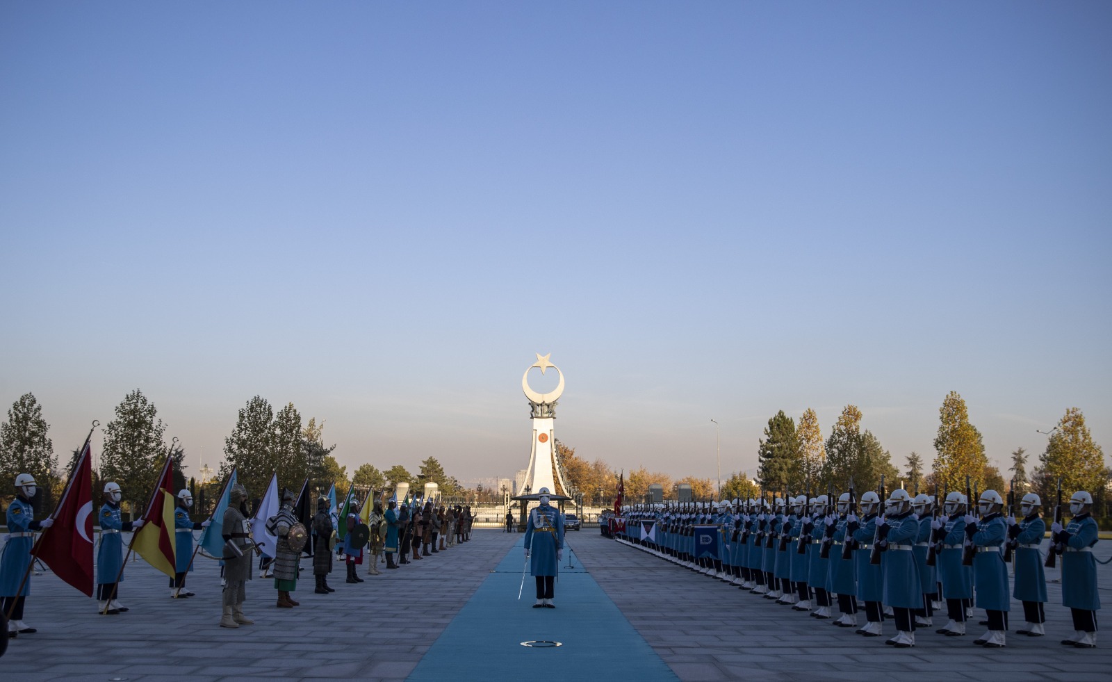 Konuk Hükümet Başkanı Sanchez'in bulunduğu makam aracını Cumhurbaşkanlığı Külliyesi'nin önündeki caddede karşılayan süvariler, Sanchez'e protokol kapısına kadar eşlik etti.