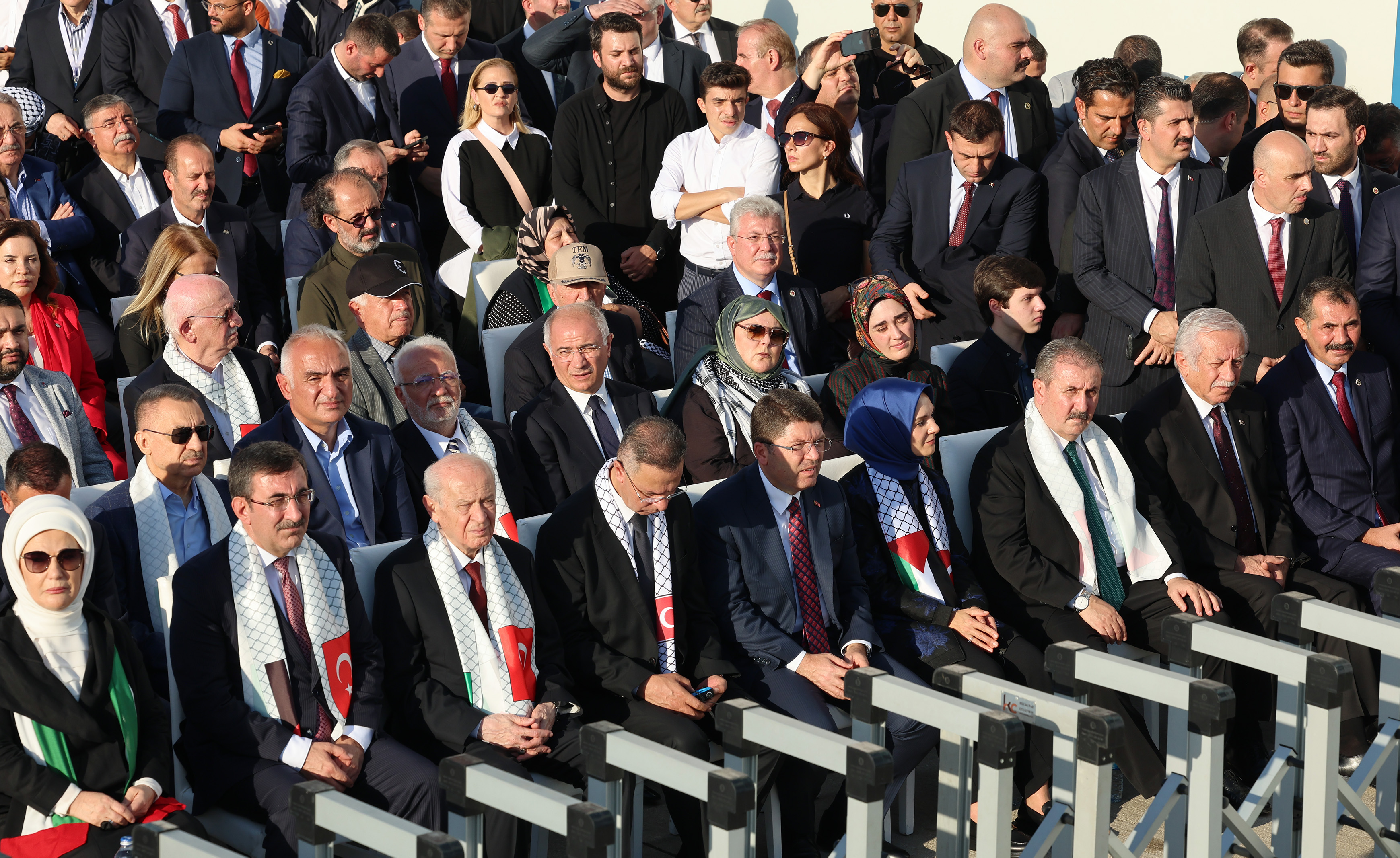 Mitinge katılan TBMM Başkanı Numan Kurtulmuş, Cumhurbaşkanı Yardımcısı Cevdet Yılmaz, MHP Genel Başkanı Devlet Bahçeli, BBP Genel Başkanı Mustafa Destici, HÜDA PAR Genel Başkanı Zekeriya Yapıcıoğlu, DSP Genel Başkanı Önder Aksakal ve Anavatan Partisi Genel Başkanı İbrahim Çelebi ile KKTC Cumhurbaşkanı Ersin Tatar, Birleşik Arap Emirlikleri Federal Ulusal Meclis Başkanı Saqr Ghobash ve Filistin'in Ankara Büyükelçisi Faed Mustafa, tek tek platforma çıkarak katılımcıları selamladı.