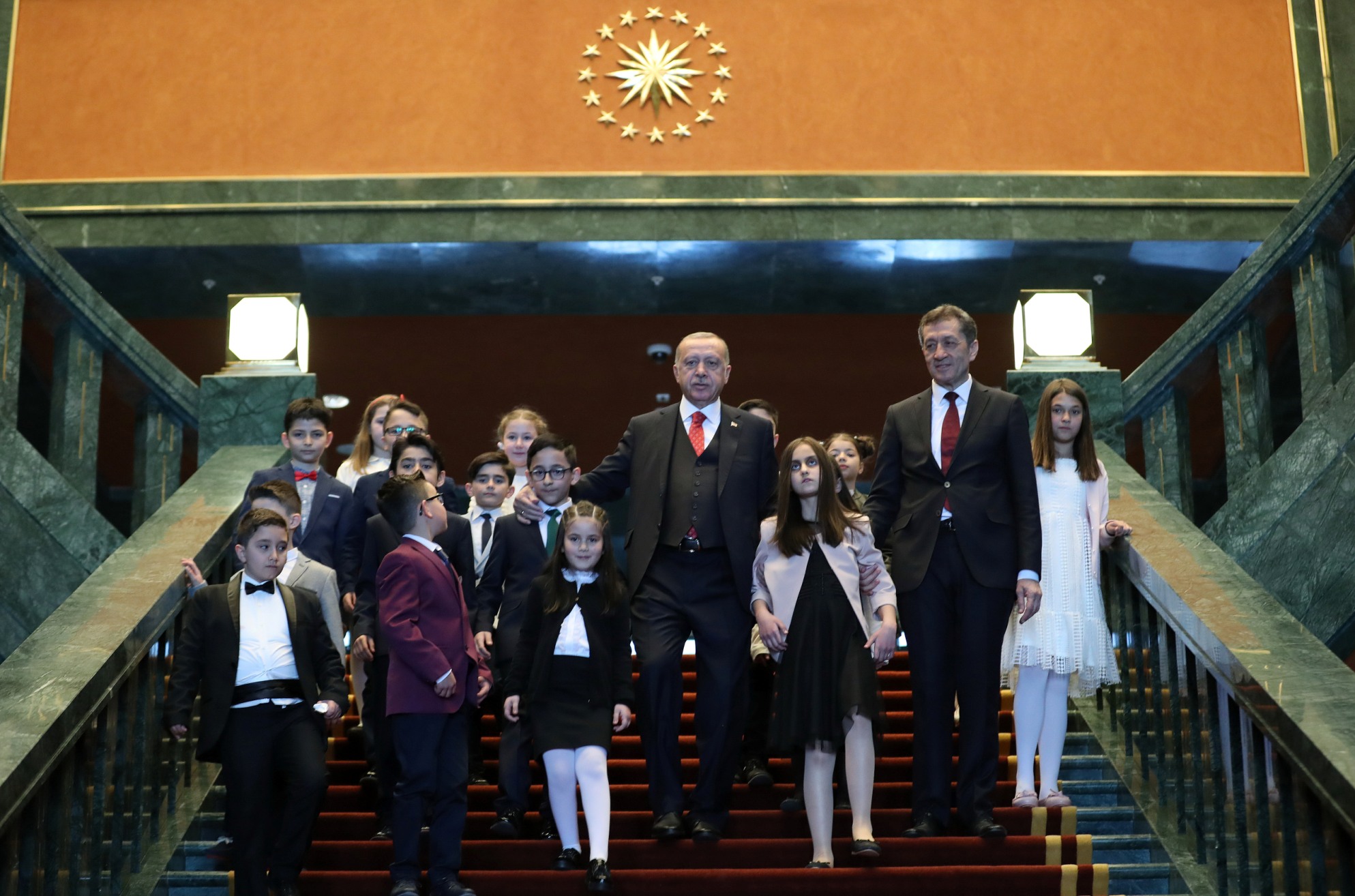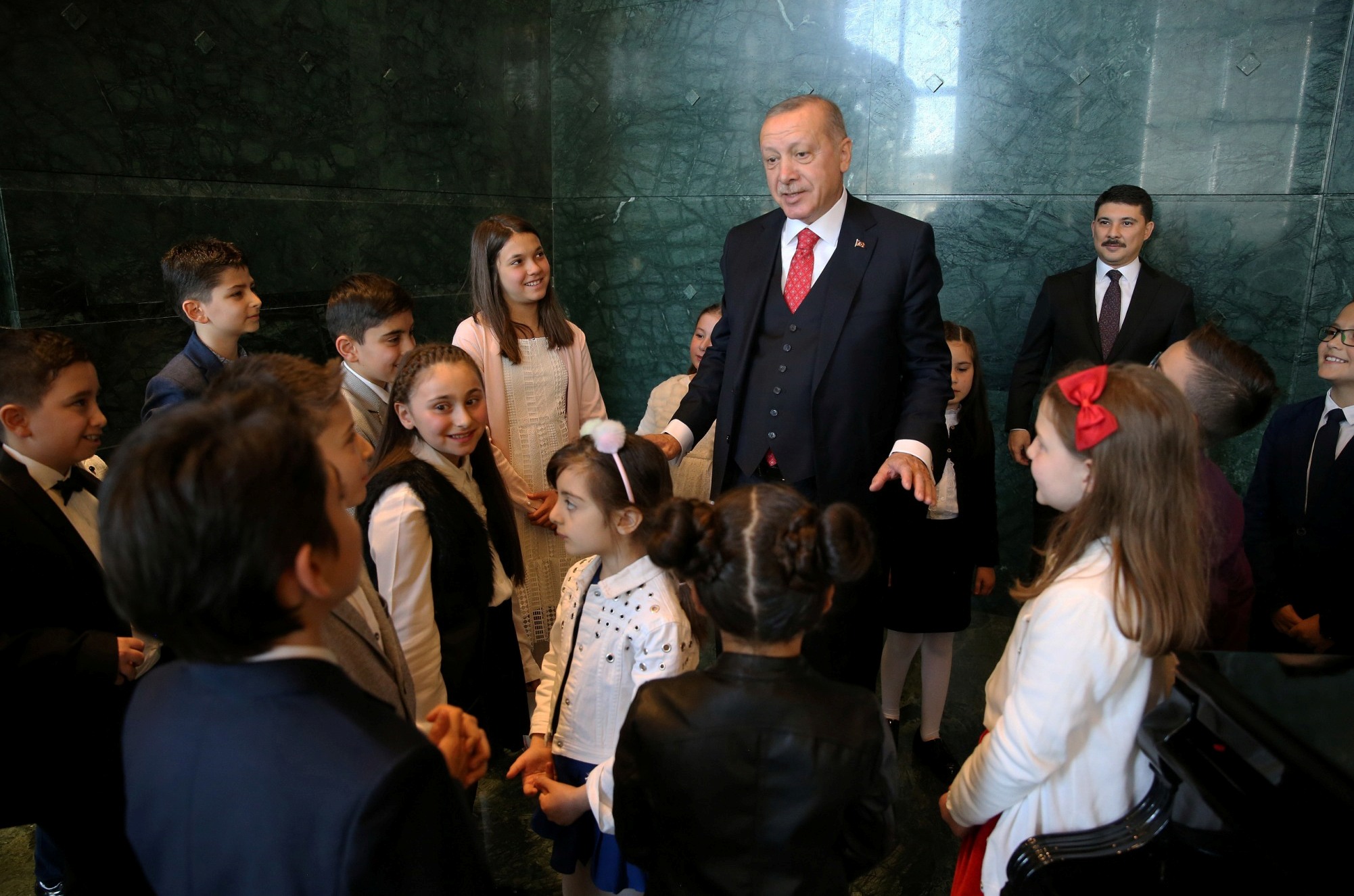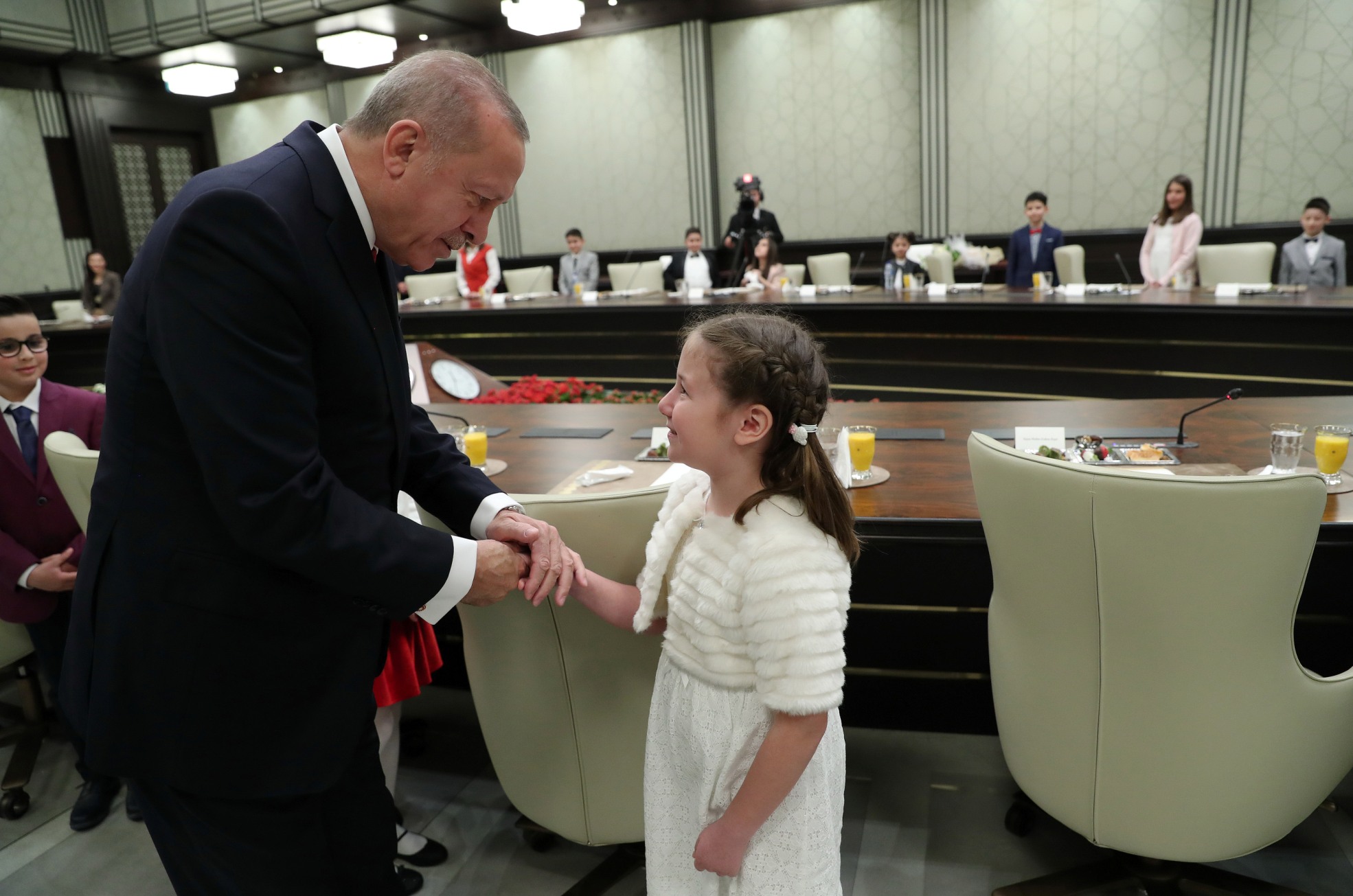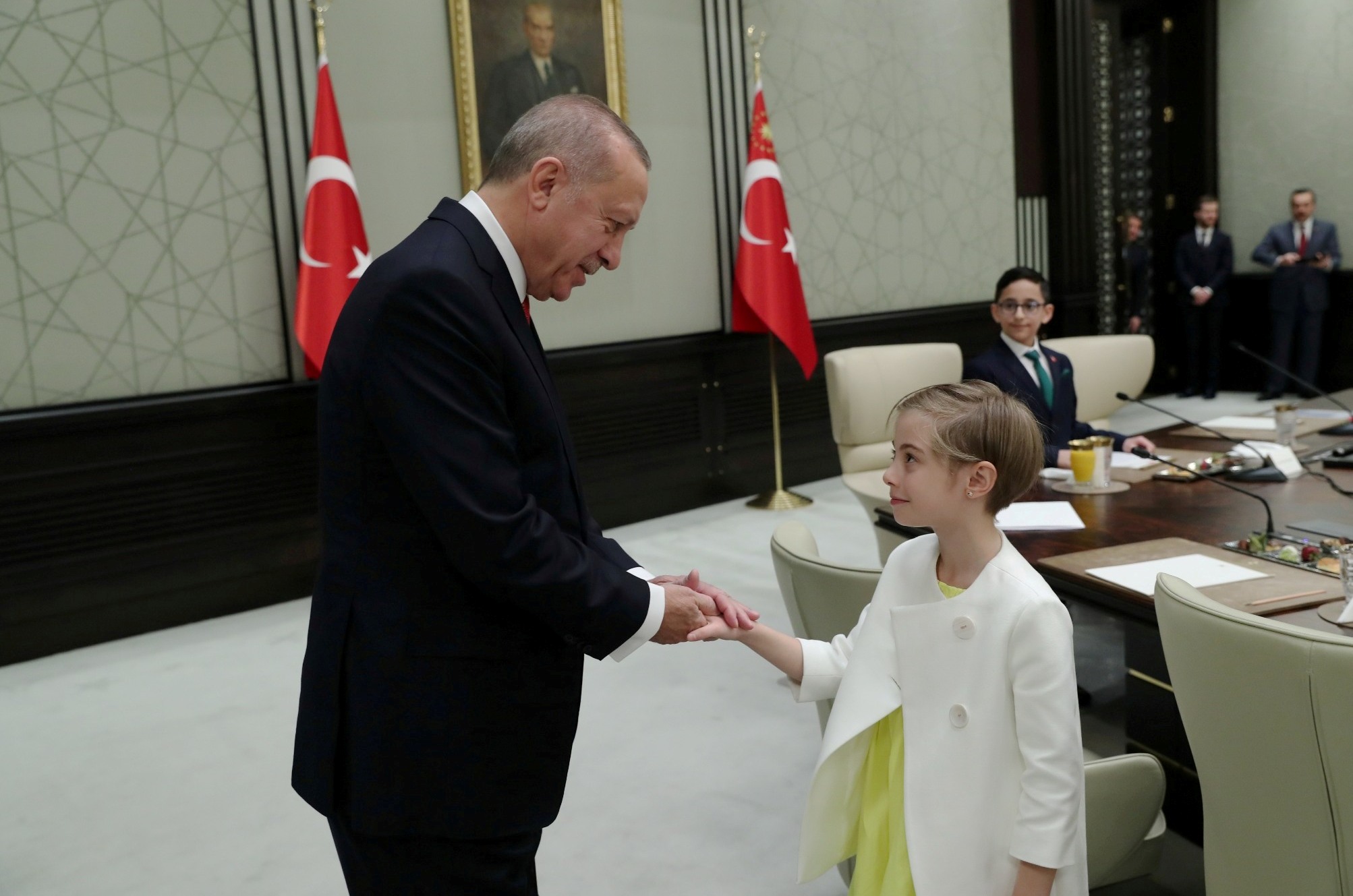 Salona gelişinde çocuklarla tek tek tokalaşan Erdoğan, yerine geçen Mamak Kuvayı Milliye Ortaokulu 6'ncı sınıf öğrencisi 12 yaşındaki Ozan Sözeyataroğlu ve diğer çocukları "Hoş geldiniz" diyerek karşıladı.