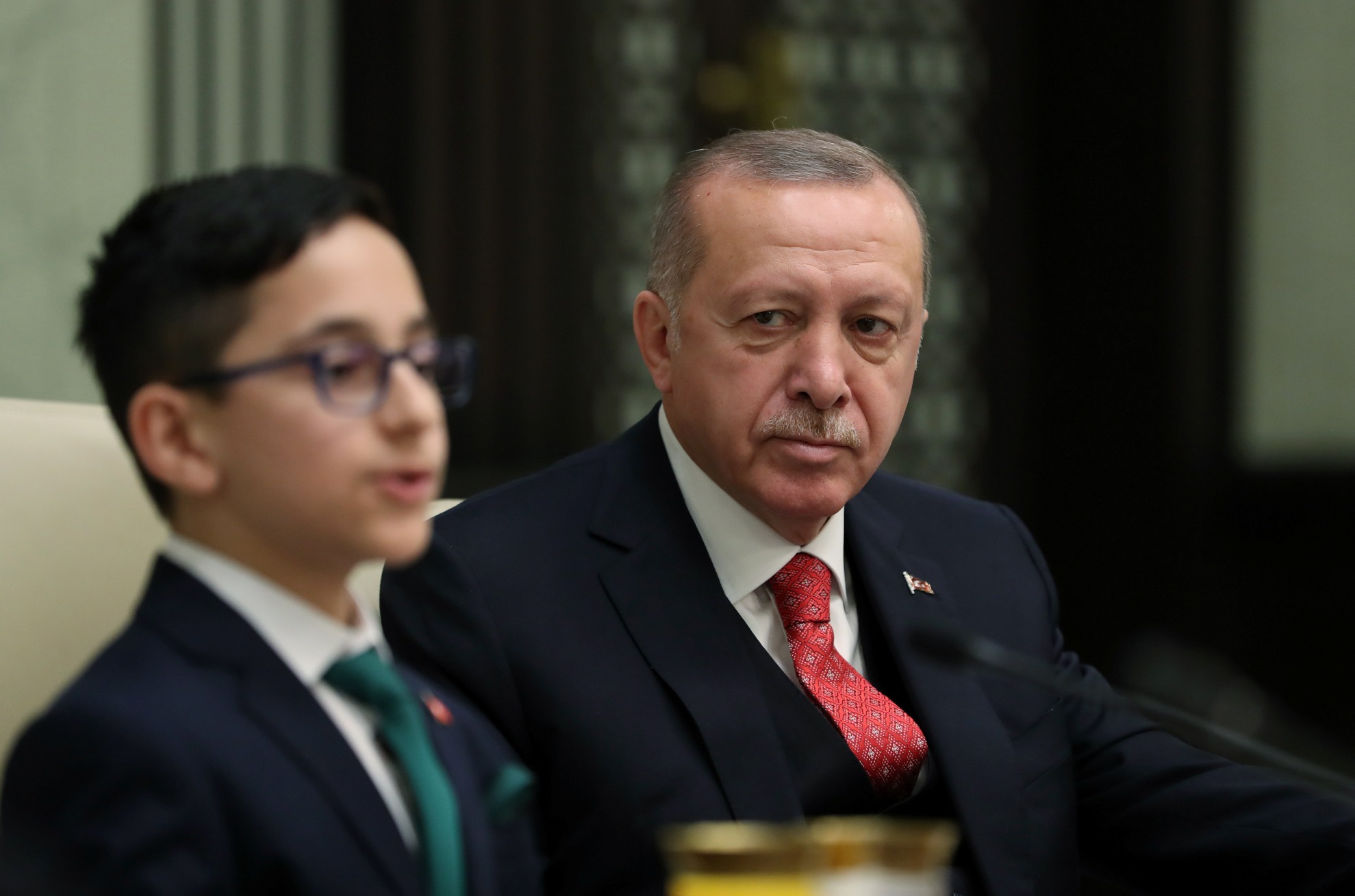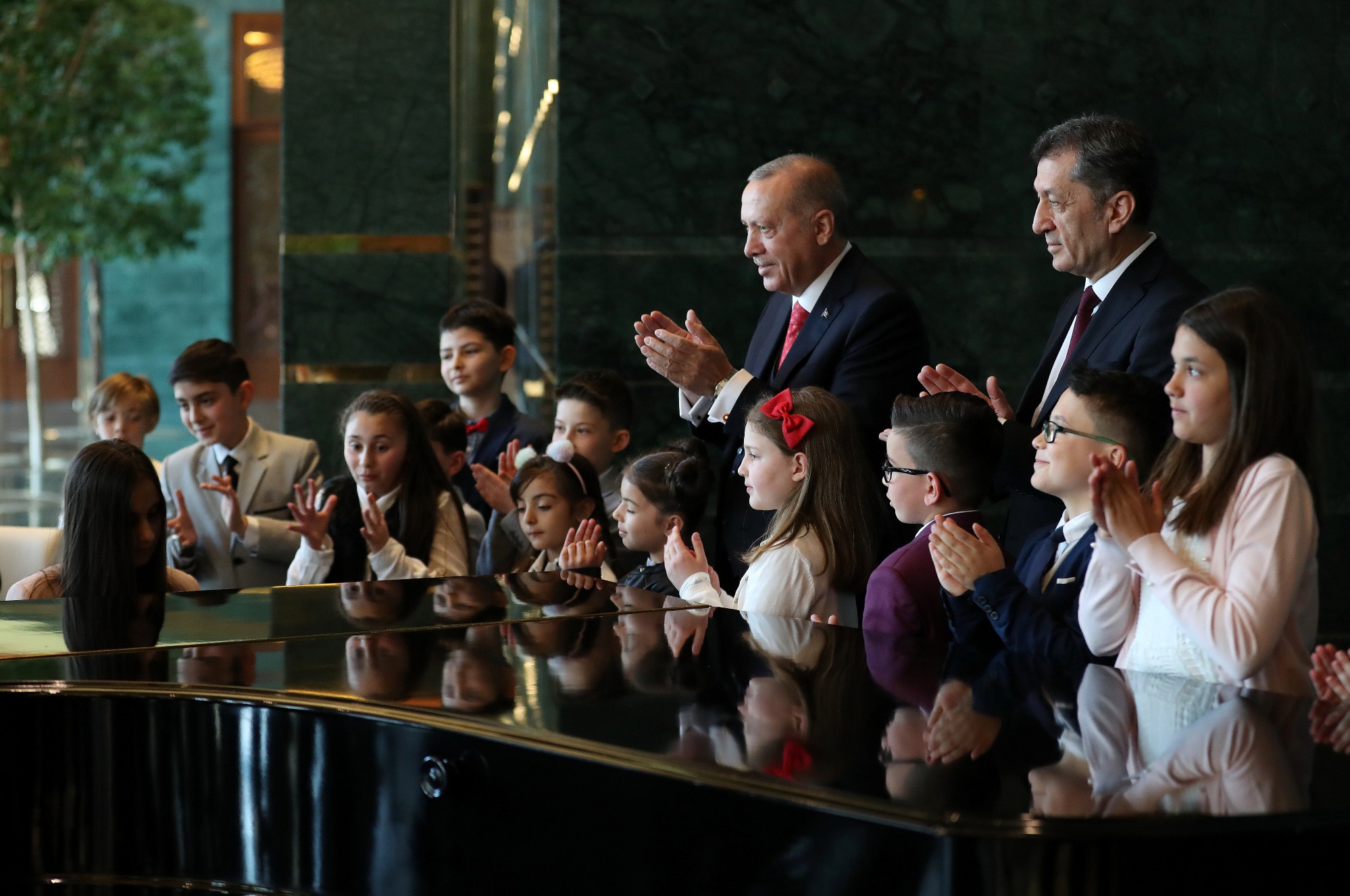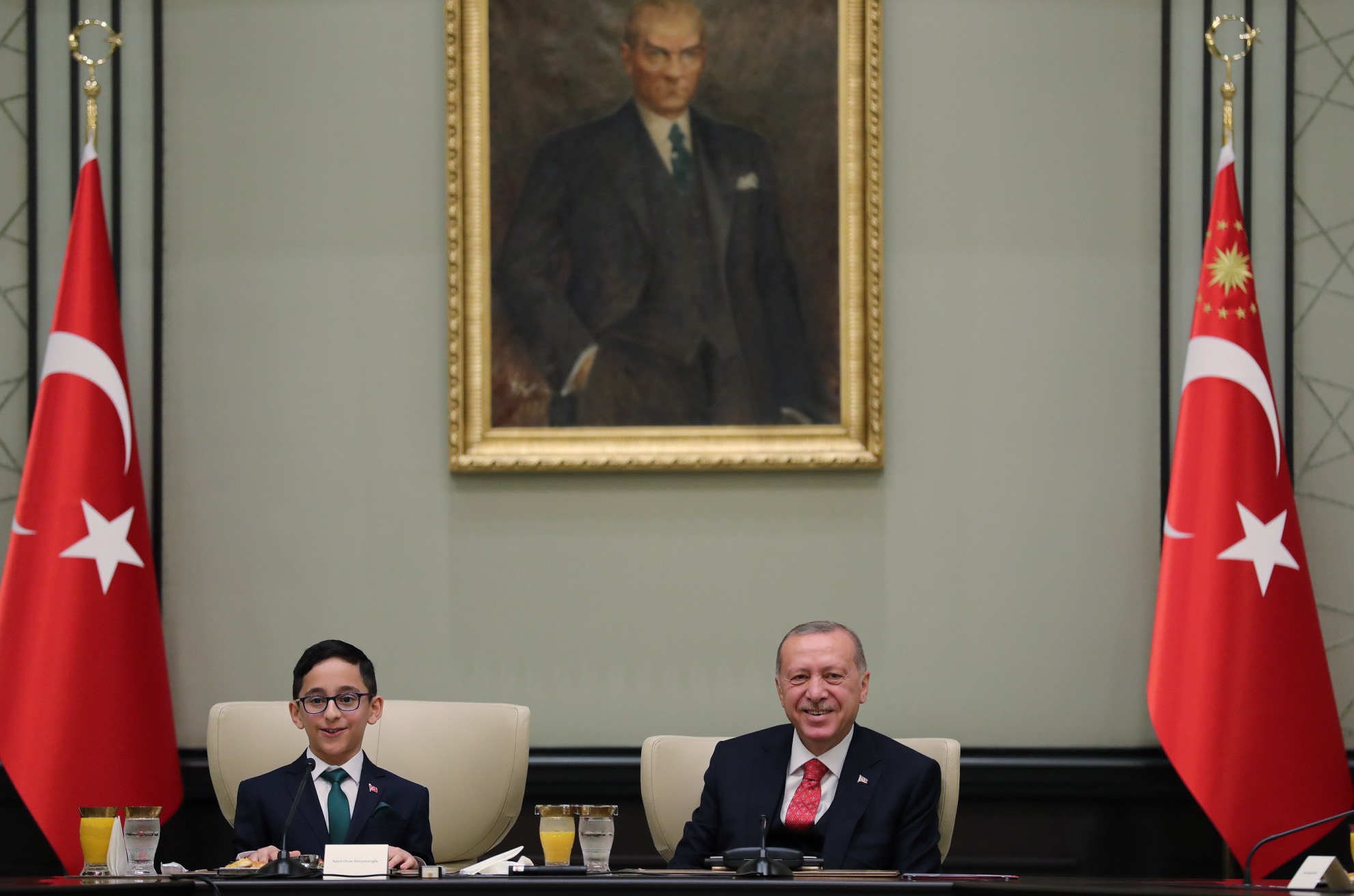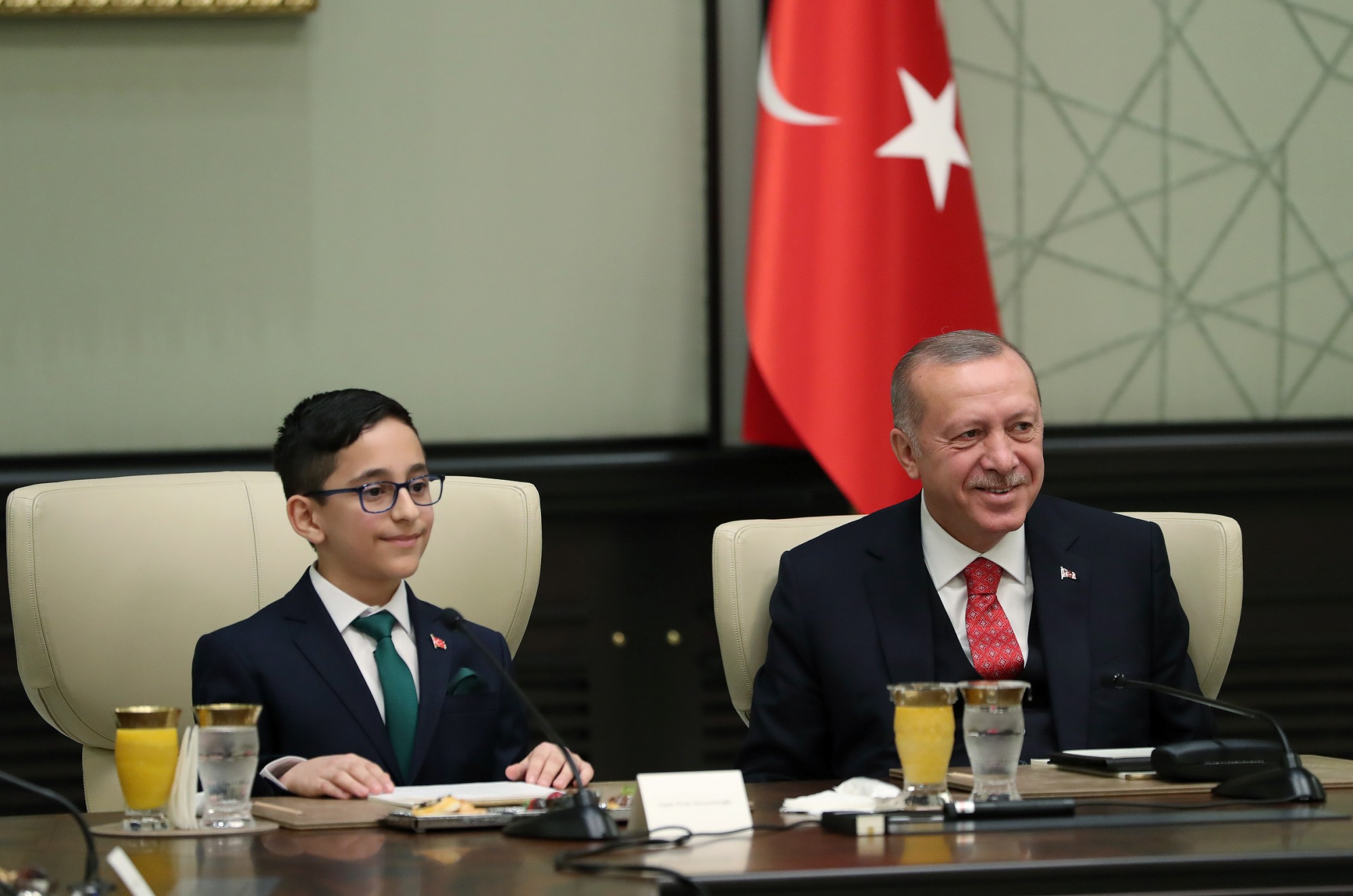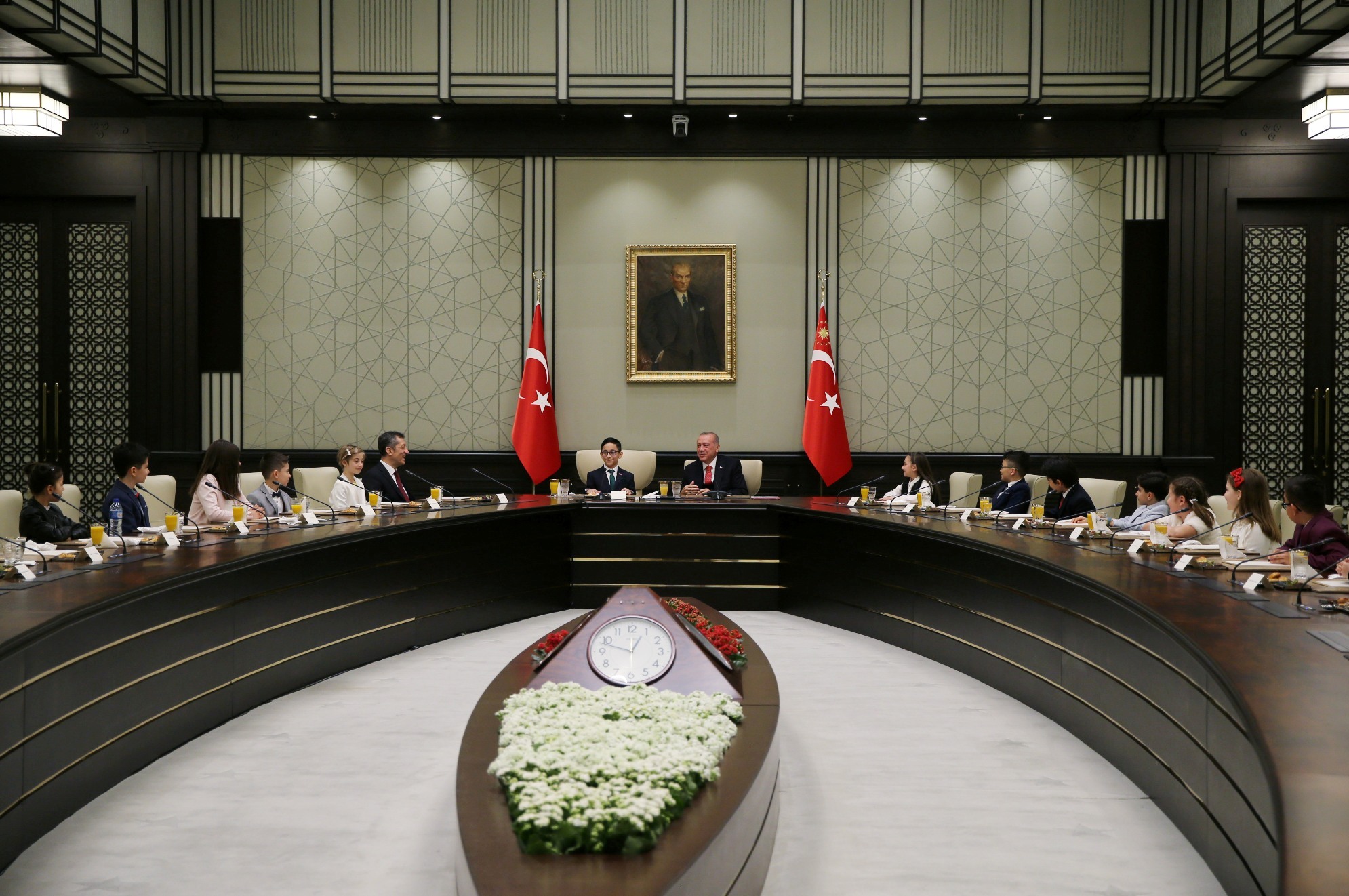 Salona gelişinde çocuklarla tek tek tokalaşan Erdoğan, yerine geçen Mamak Kuvayı Milliye Ortaokulu 6'ncı sınıf öğrencisi 12 yaşındaki Ozan Sözeyataroğlu ve diğer çocukları "Hoş geldiniz" diyerek karşıladı.