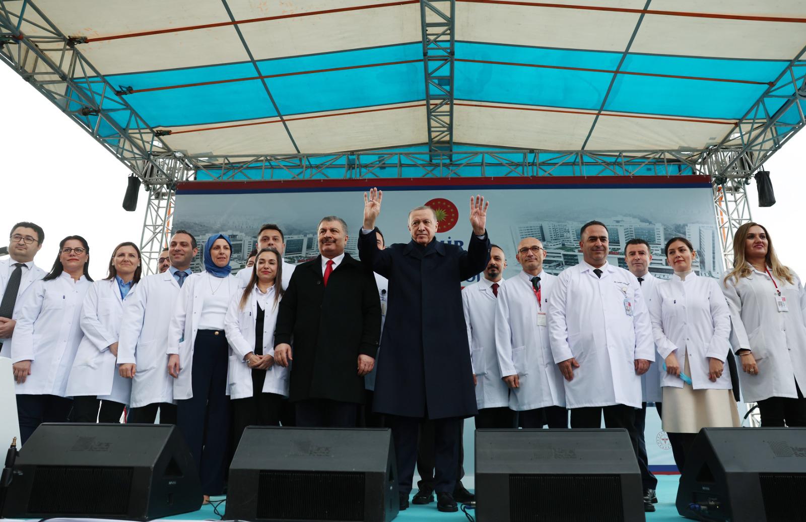 Cumhurbaşkanı Erdoğan, hitabının ardından İzmir Bayraklı Şehir Hastanesi ve bağlantı yollarının açılışını, sağlık çalışanlarıyla beraber kurdele keserek yaptı. Cumhurbaşkanı Erdoğan, kurdele keserken "Şu eserleri görüyorsunuz değil mi? Bunlar er işidir. Her kişi değil ancak er kişiler bunu yapar. 2 bini aşkın yatakla inşallah İzmir'e hizmet verecek." ifadelerini kullandı. Makasların, günün hatırasına kurdeleyi kesenlerde kalmasını isteyen Cumhurbaşkanı Erdoğan, "Bizim neşterimiz de bu." dedi. Daha sonra hastanede incelemelerde bulunan Cumhurbaşkanı Erdoğan, yetkililerden bilgi aldı.