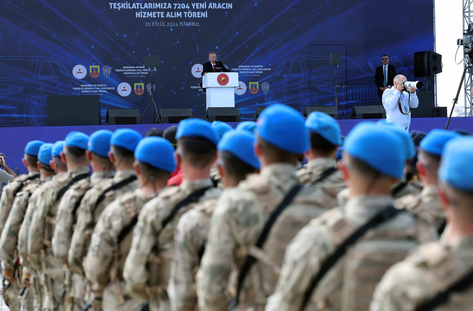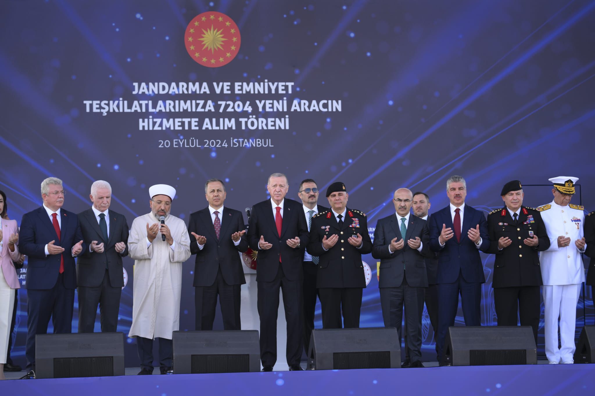 "İşte bugün jandarma ve emniyet teşkilatlarımıza 7204 yeni aracın hizmete alım törenini gerçekleştiriyoruz. Böylesi anlamlı bir tören vesilesiyle sizlerle beraber olmaktan duyduğum bahtiyarlığı hassaten vurgulamak isterim. Emniyet Genel Müdürlüğümüzün ve Jandarma Genel Komutanlığımızın envanterinde bulunan ve ekonomik ömrünü tamamlayan taşıtlarımızı artık yeniliyoruz. Trafik ve asayiş hizmetleri için alınan ve hizmete sunulan bu araçlarımızın 5001 tanesini emniyet teşkilatımız kullanacak, 2203 adedini ise jandarma teşkilatımız kullanacak. Toplamda 7204 adet yeni taşıt, emniyet ve jandarma birimlerimizin emrinde olacak. Bu araçlar, asayiş, terör ve uyuşturucuyla mücadele başta olmak üzere güvenlik faaliyetlerimizin daha etkin yürütülmesini kolaylaştıracaktır."