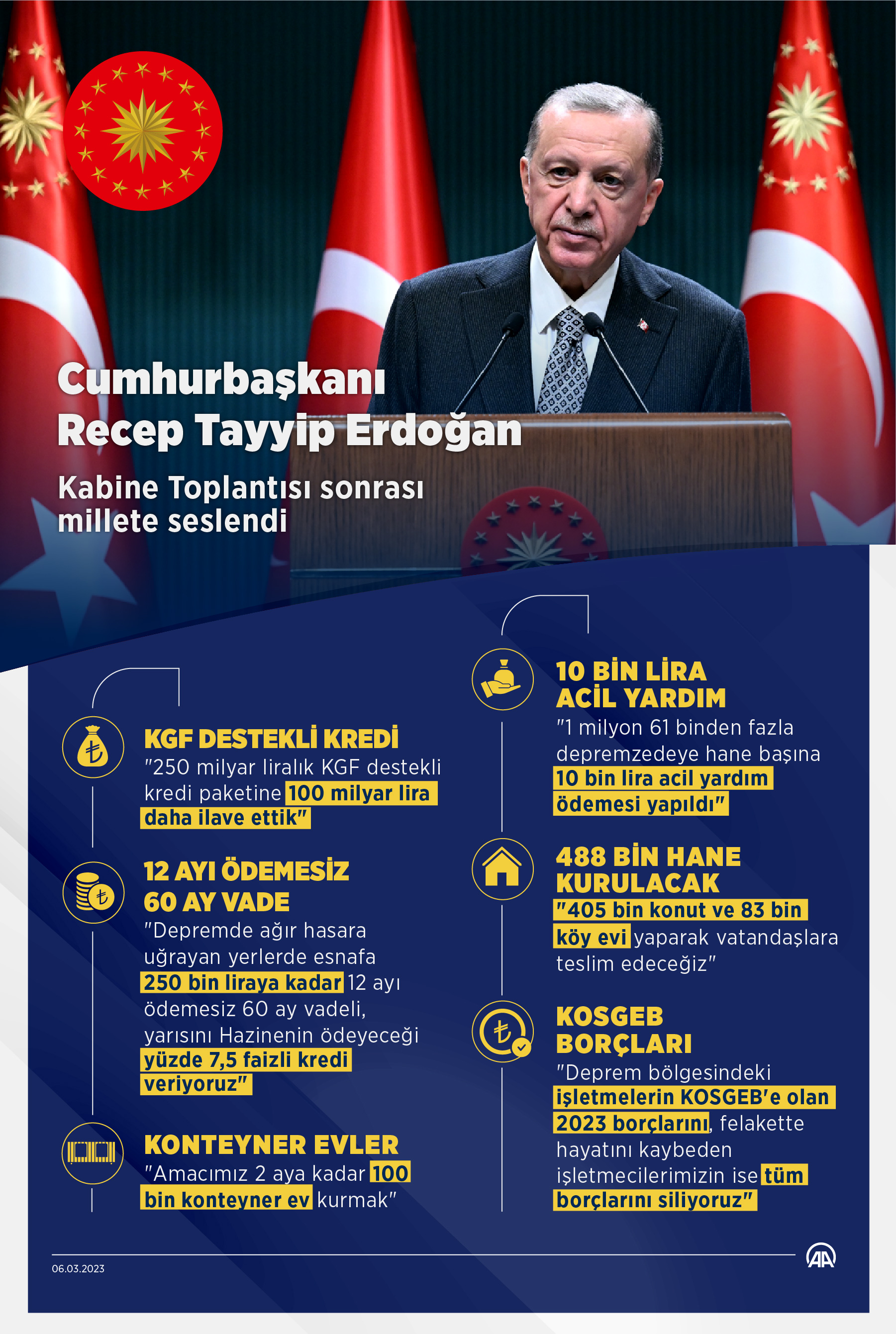 "Cazibe merkezleri destekleme programını tüm deprem bölgesi ilçelerimize teşmil ederek hepsinin de altıncı bölge desteklerinden yararlanabilmesini temin ediyoruz. Kalkınma ajanslarımızın tüm kaynaklarını afet bölgesi şehirlerine aktararak projelerin finansmanındaki devlet katkısını en üst seviyeye çıkartıyoruz. Bireysel ve KOBİ kredilerinin ödemelerindeki ertelemeler yanında daha önce açıkladığımız 250 milyar liralık KGF destekli kredi paketine 100 milyar lira daha ilave ettik. Depremde ağır hasara uğrayan yerlerde dükkânlarını hemen faaliyete geçirmek isteyen esnaf ve sanatkârlarımıza 250 bin liraya kadar 12 ay ödemesiz, 60 ay vadeli, yarısını da Hazinenin ödeyeceği yüzde 7,5 faizli kredi veriyoruz. Kısa çalışma ödeneği ve nakdî ücret desteği uygulamalarını da bölgedeki istihdamı güçlendirmek için devreye alıyoruz. Toplum yararına çalışma programıyla bölgeye sağladığımız istihdamı, özellikle ihtiyaç sahibi ailelere öncelik vererek 50 bin kişiye çıkartıyoruz.