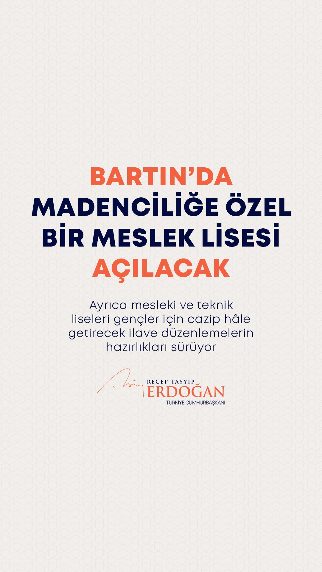 "Daha önce 159 bin olan meslekî eğitim merkezlerindeki kayıt sayısı, şu anda 910 bine yükselmiş durumdadır. Kasım ayında yılsonu hedefimize ulaşacağımız ve sonrasında da hedefi geçeceğimiz anlaşılıyor. Ayrıca meslekî ve teknik liseli gençlerimiz için cazip hale getirecek ilave düzenlemelerin hazırlıkları içindeyiz. Bartın'daki benzeri kazaların önüne geçmek için atacağımız adımlar arasında bölgede, madenciliğe özel bir meslek lisesi açma projesi de bulunuyor. Yaşanan kaza ile ilgili iş güvenliğinden teknik eksiklere kadar her konu inceleniyor, araştırılıyor. Ortaya çıkacak sonuçlara göre gerekenin yapılacağından kimsenin şüphesi olmasın. Amasra'dan alınan dersler ışığında ülkemizdeki tüm madenlerin durumları baştan sona gözden geçirilmektedir."