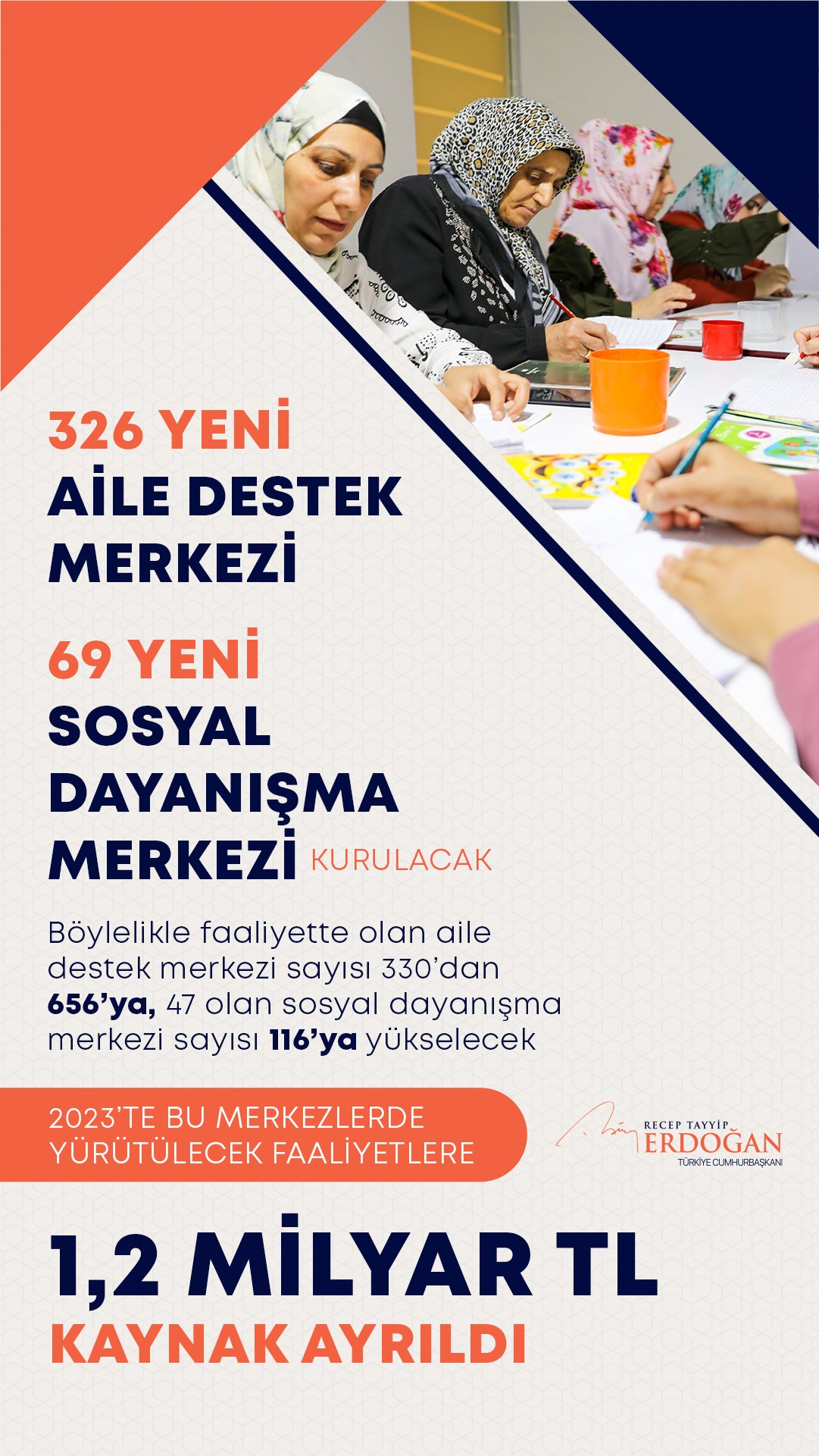 Aileye yönelik hizmetleri genişletme amacı taşıyan yeni bir adımın müjdesini paylaşan Cumhurbaşkanı Erdoğan, sosyal yardımlaşma ve dayanışma vakıfları vasıtasıyla kadınlara ve çocuklara yönelik çalışmalar için kurulan aile destek merkezleri ve sosyal dayanışma merkezleri olduğunu hatırlattı.