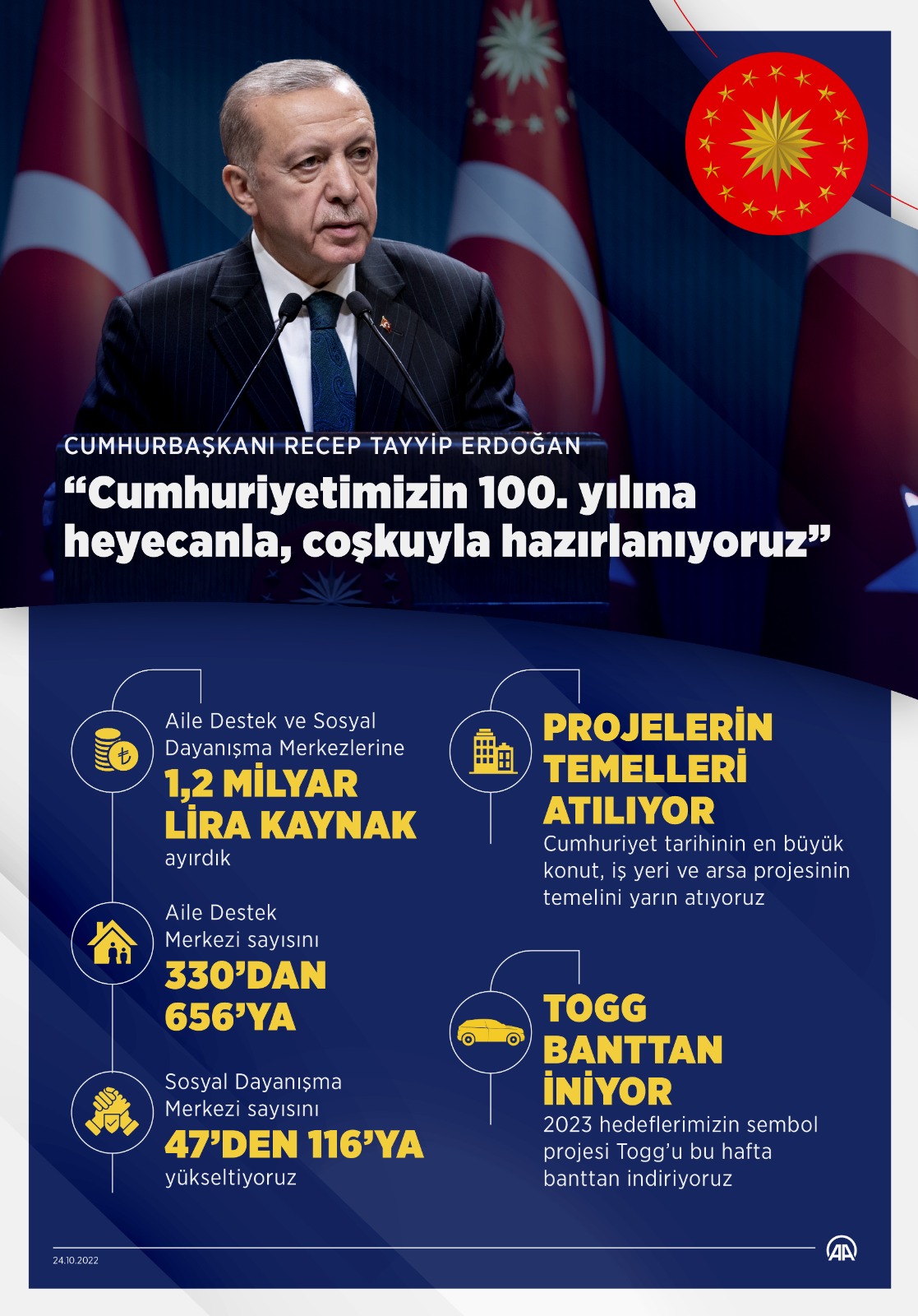 Cumhurbaşkanı Erdoğan, gelecek yıl vasıl olacakları Cumhuriyetin 100. yılına büyük bir heyecanla, şevkle, coşkuyla hazırlandıklarını belirterek, sözlerini şöyle sürdürdü: