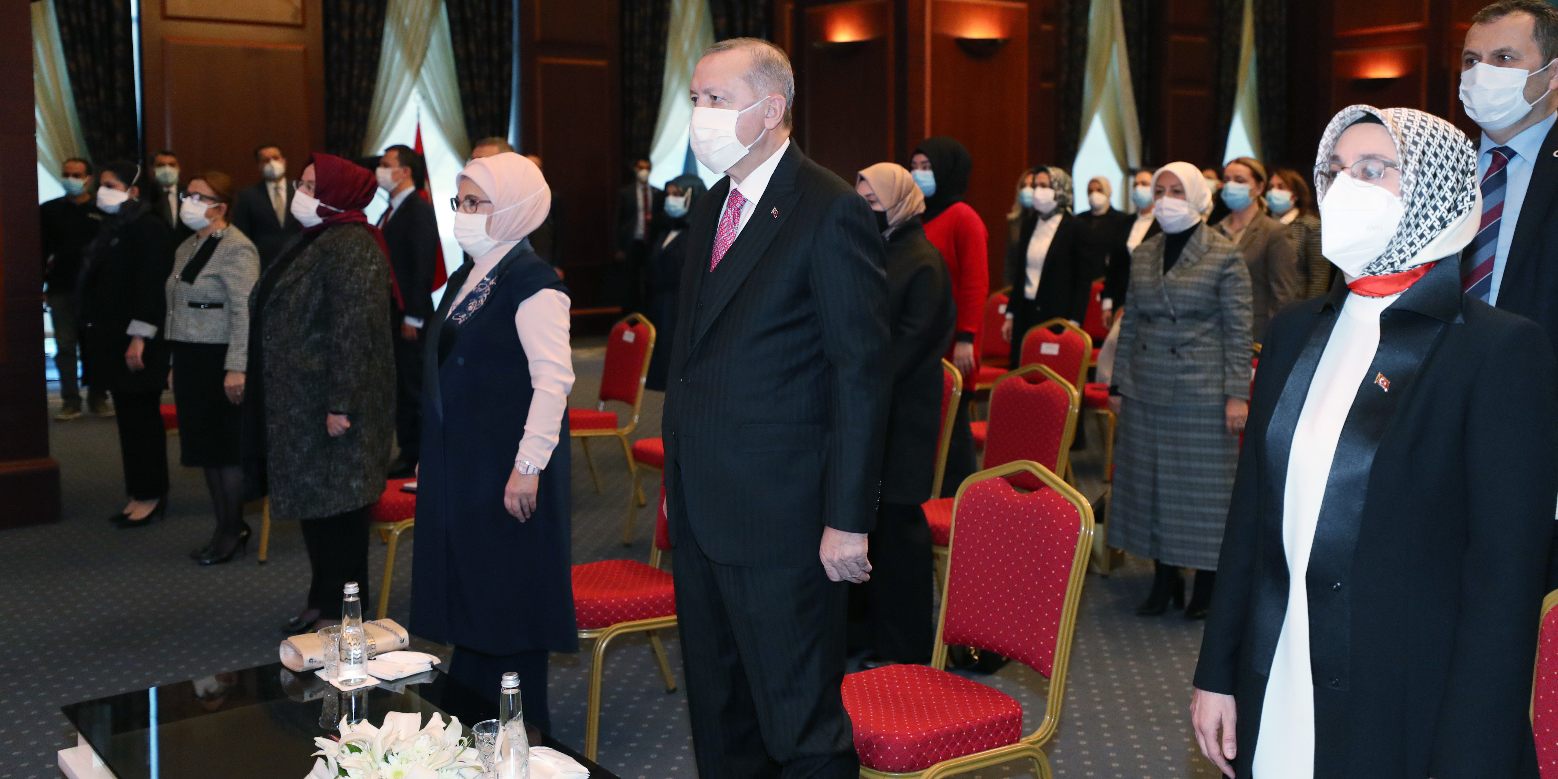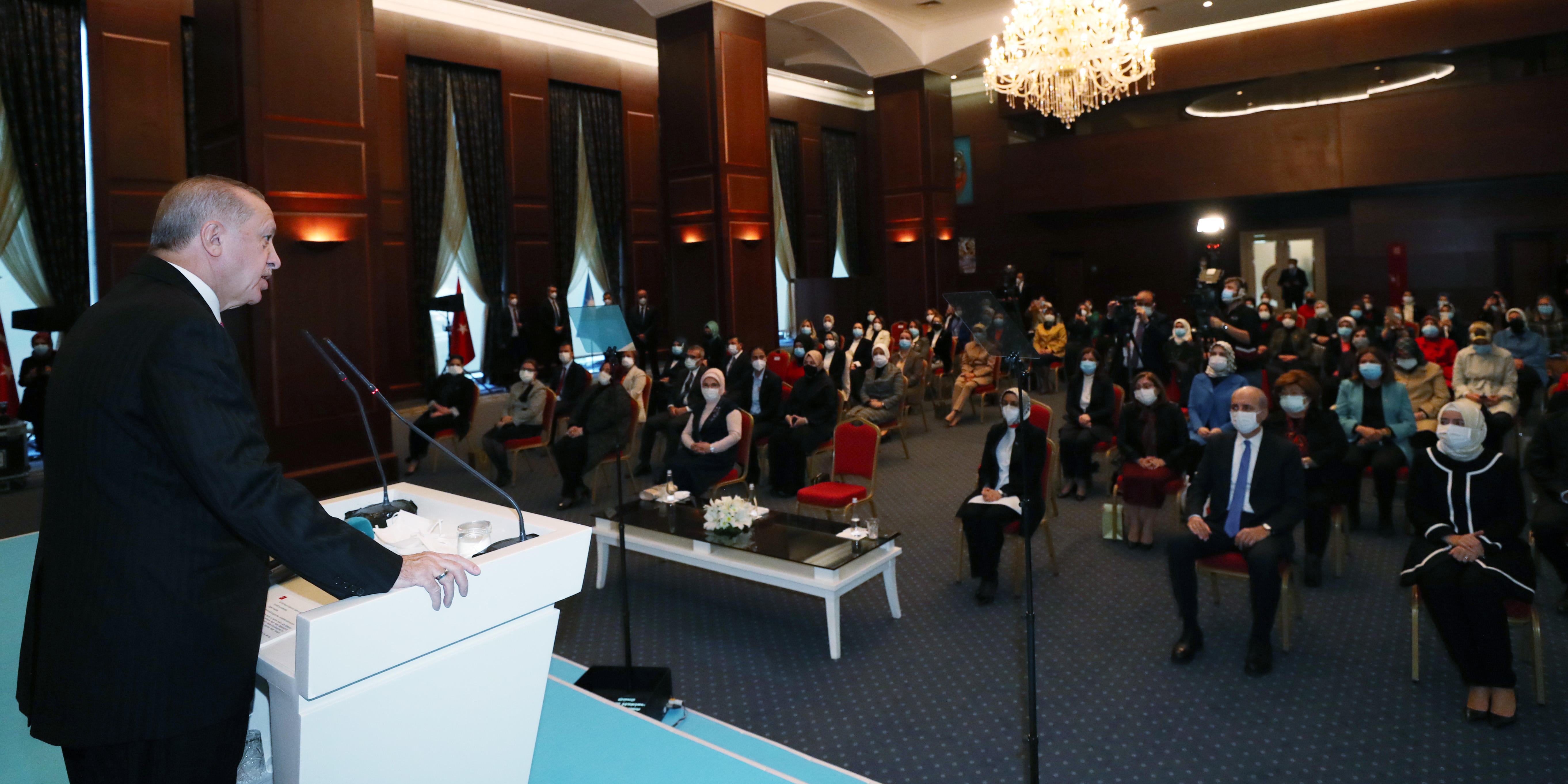Cumhurbaşkanı Erdoğan, Türk kadınının seçme ve seçilme hakkına Avrupa'daki hemcinslerinden çok daha önce kavuşması, bunun bir zorlama ile değil kendi tabii mecrasında gerçekleşmiş olmasının çok önemli olduğunu vurgulayarak, "Bugün de yapmamız gereken budur. Kadının, erkeğin, çocuğun asli unsurları olduğu aile kurumumuzu güçlendirmek için yapacağımız çalışmalarda hiçbir yere değil, kendi medeniyet ve tarih değerlerimize bakacağız. Dün, kadın ve erkek birlikte tarlayı sürüyor, hayvanları besliyor, bahçeyi ekiyor, evini inşa ediyor, hayatın tüm zorluklarını birlikte göğüslüyor, tüm nimetlerinden birlikte faydalanıyordu. İnancımızla ve kültürümüzle ilgisi olmayan birtakım yanlış uygulamaları ve adetleri aile kurumunu yıkmak için kullanmaya kalkanların sinsi oyunlarına gelmeyeceğiz." diye konuştu.