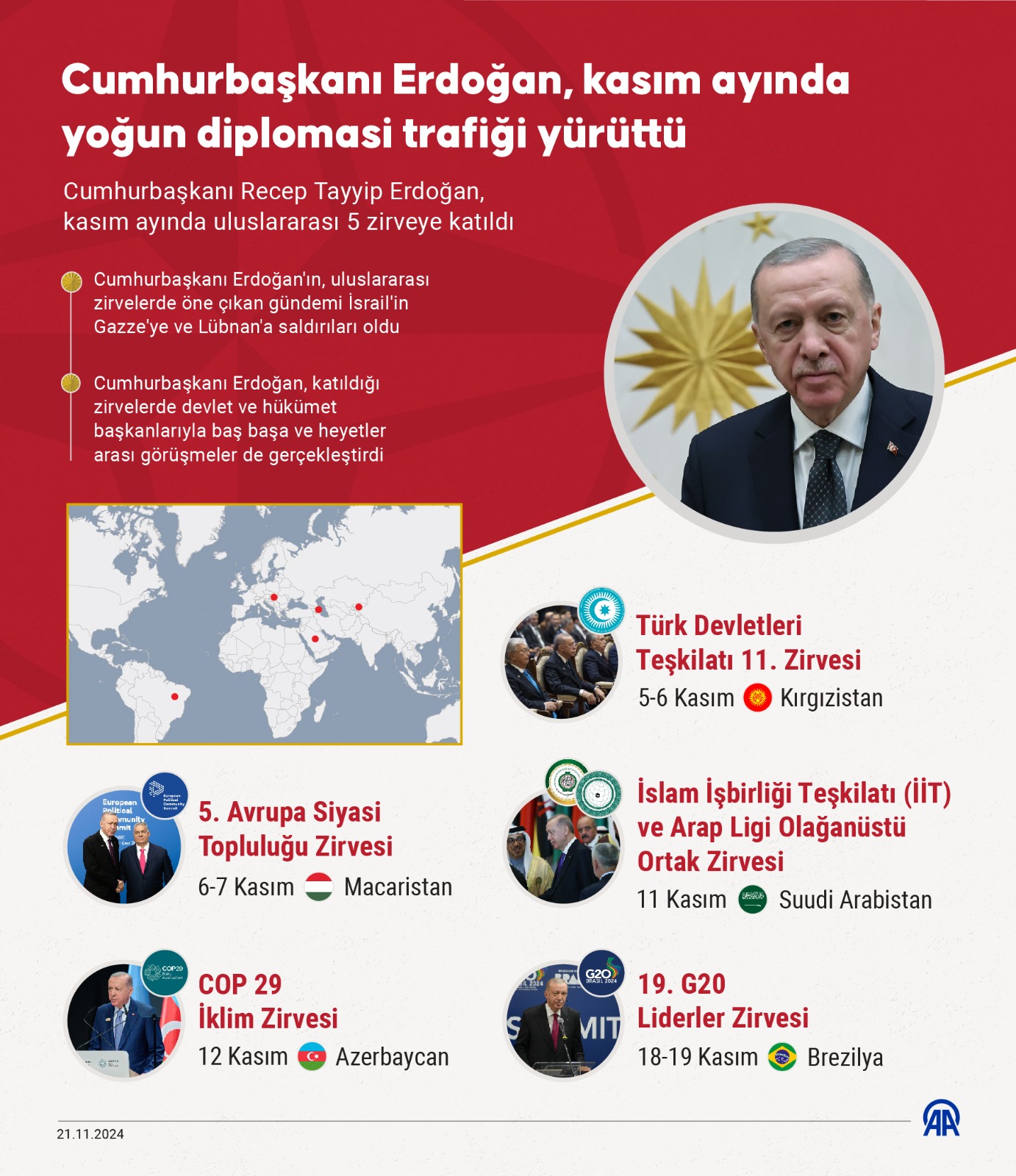 Cumhurbaşkanı Recep Tayyip Erdoğan, kasım ayında uluslararası 5 zirveye katılarak, yoğun diplomasi trafiği yürüttü.