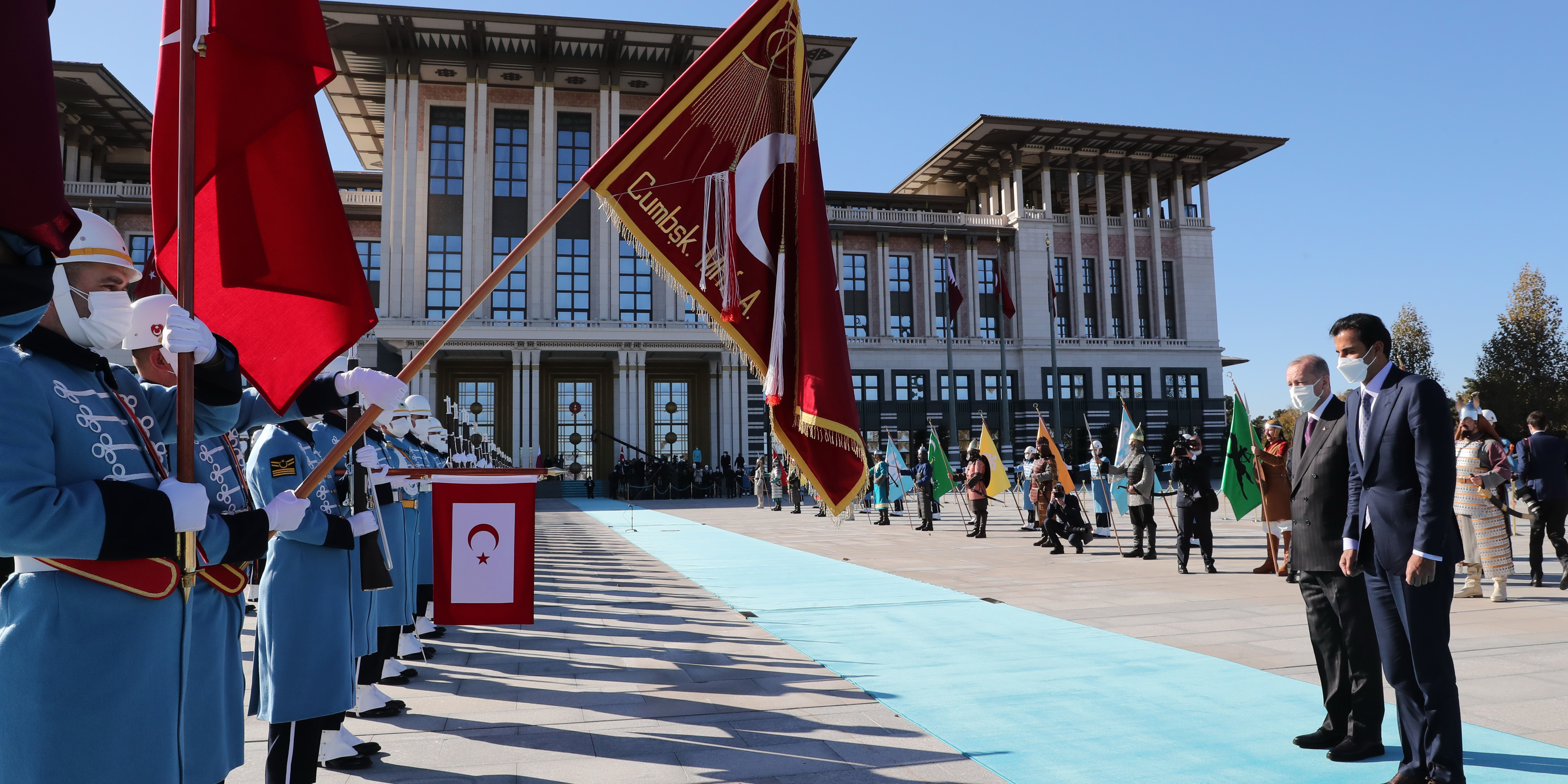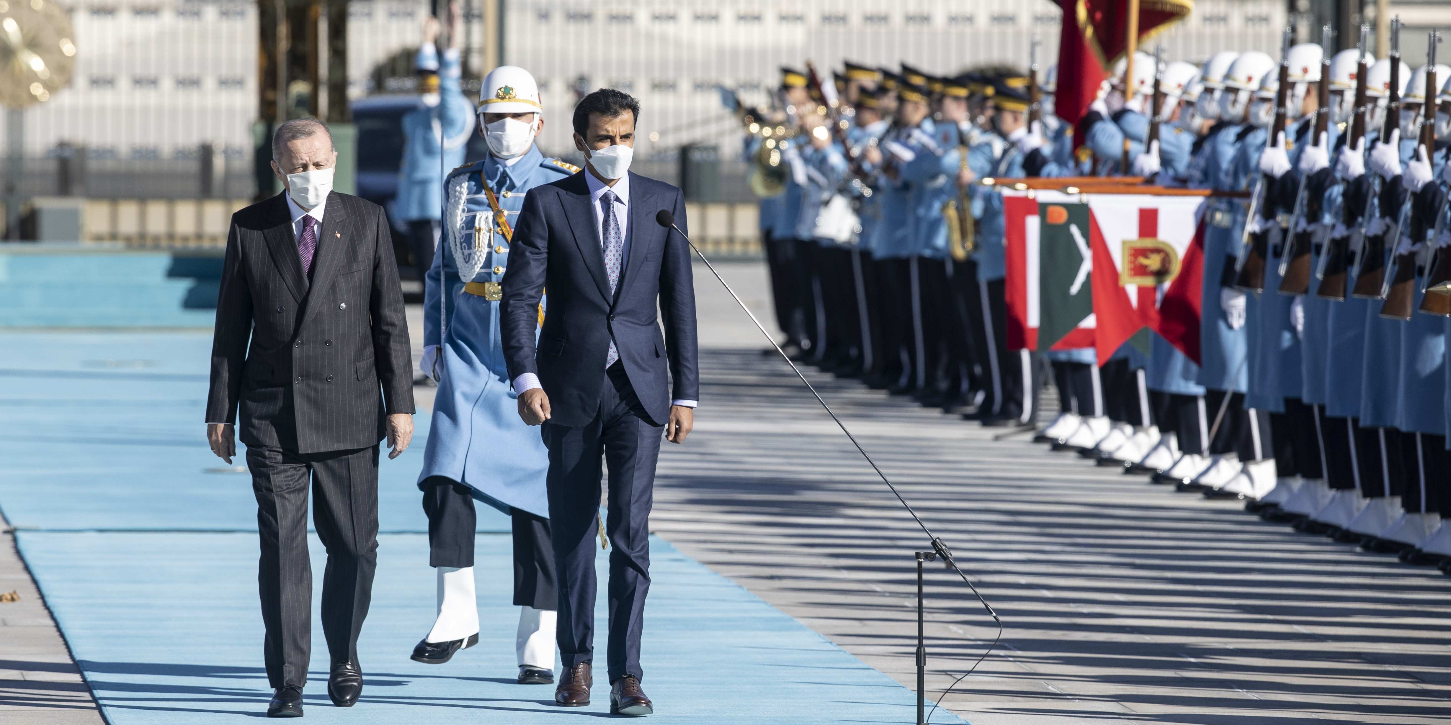 Cumhurbaşkanı Erdoğan ve Katar Emiri Şeyh Temim'in tören alanındaki yerlerini almalarının ardından, iki ülke milli marşları çalındı, 21 pare top atışı yapıldı.