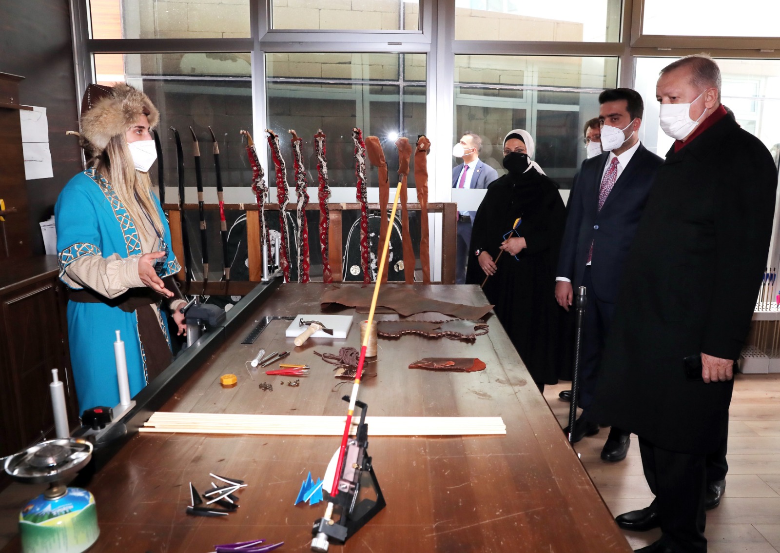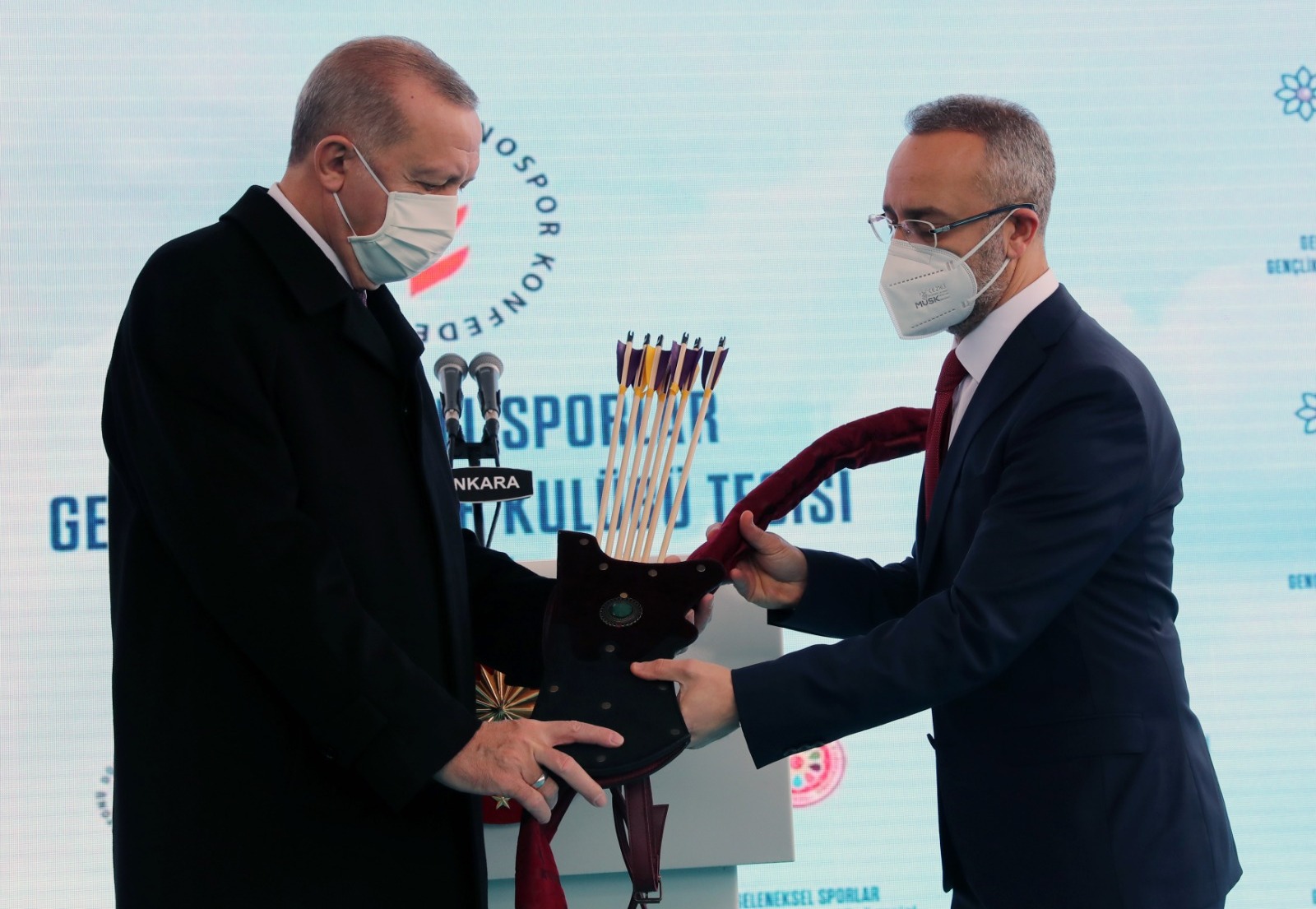 Cumhurbaşkanı Erdoğan’a, konuşmasının ardından Türkiye Geleneksel Spor Dalları Federasyonu Yönetim Kurulu Başkanı Hakan Kazancı tarafından üç dünya şampiyonluğu bulunan model adı "Alparslan" olan yay takdim edildi.