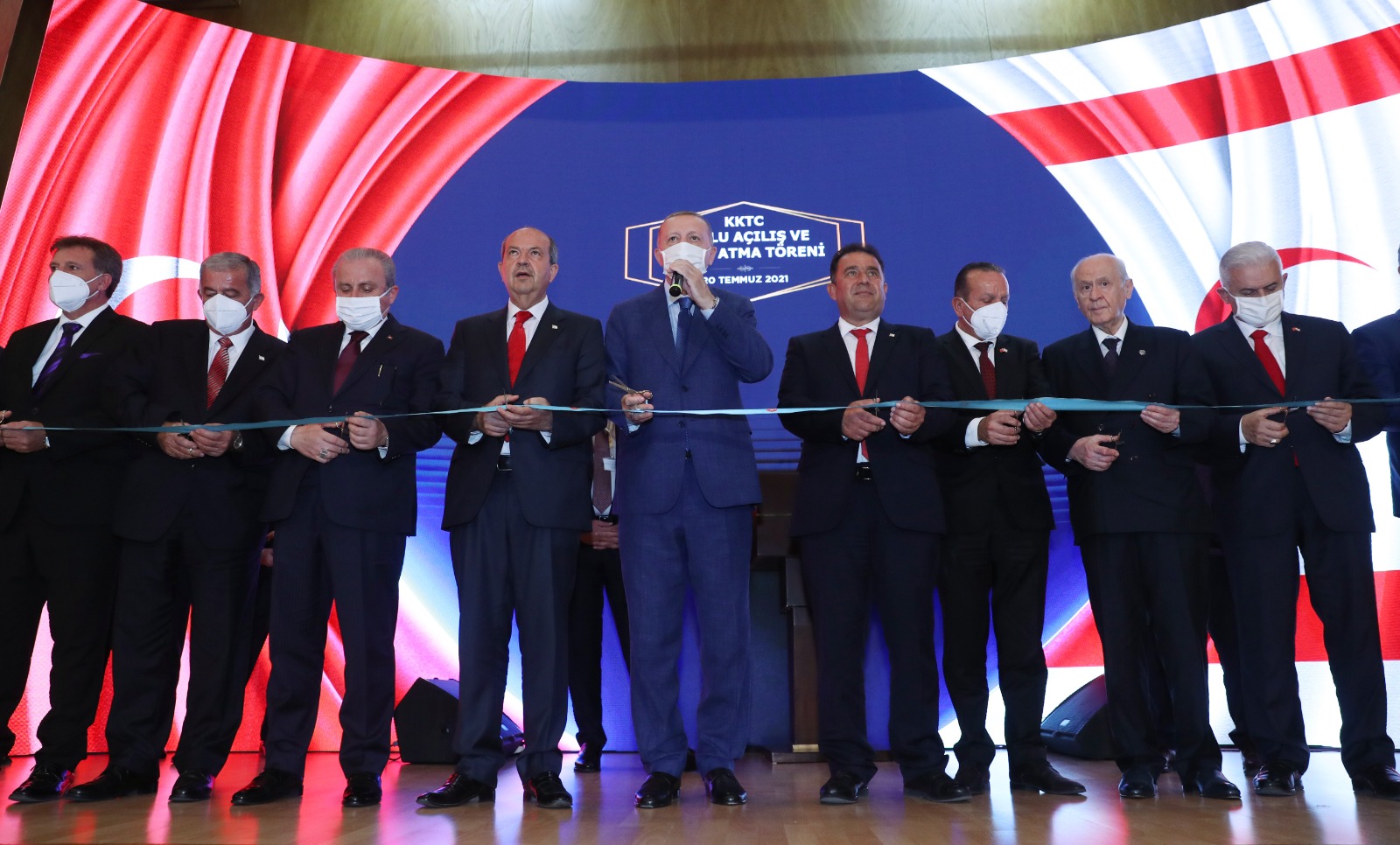 Cumhurbaşkanı Erdoğan ve KKTC Cumhurbaşkanı Tatar, canlı bağlantıların ardından salonda TBMM Başkanı Mustafa Şentop, KKTC Cumhuriyet Meclisi Başkanı Önder Sennaroğlu, Başbakan Ersan Saner, MHP Genel Başkanı Devlet Bahçeli, BBP Genel Başkanı Mustafa Destici, DSP Genel Başkanı Önder Aksakal ve Yeniden Refah Partisi Genel Başkanı Fatih Erbakan ile temsili açılış ve temel atma kurdelesini kesti.