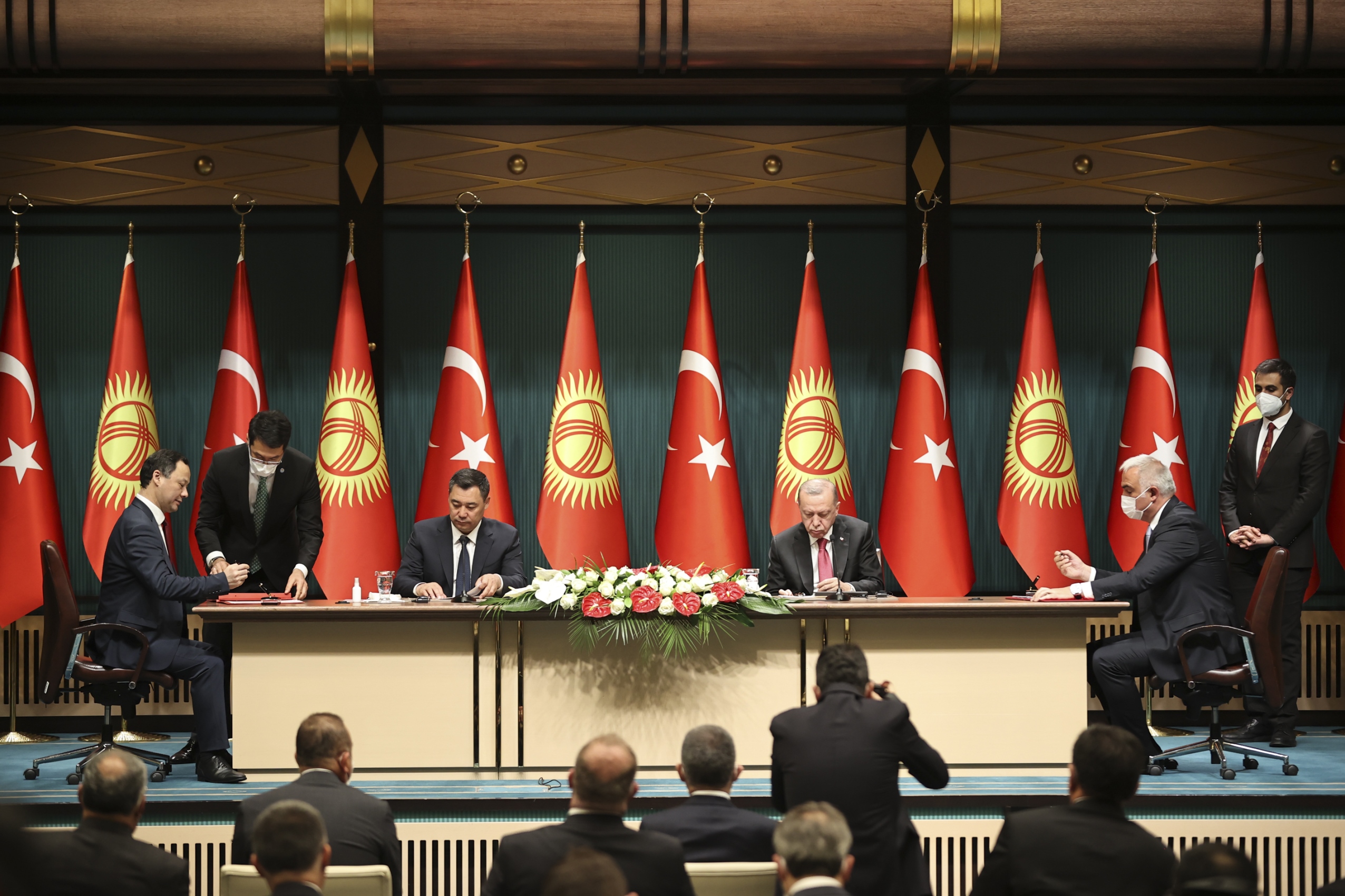 Cumhurbaşkanı Erdoğan ve Kırgızistan Cumhurbaşkanı Sadır Caparov'un, Cumhurbaşkanlığı Külliyesi'nde gerçekleştirdiği baş başa ve heyetler arası görüşmelerin ardından iki ülke arasında anlaşmalar imzalandı.