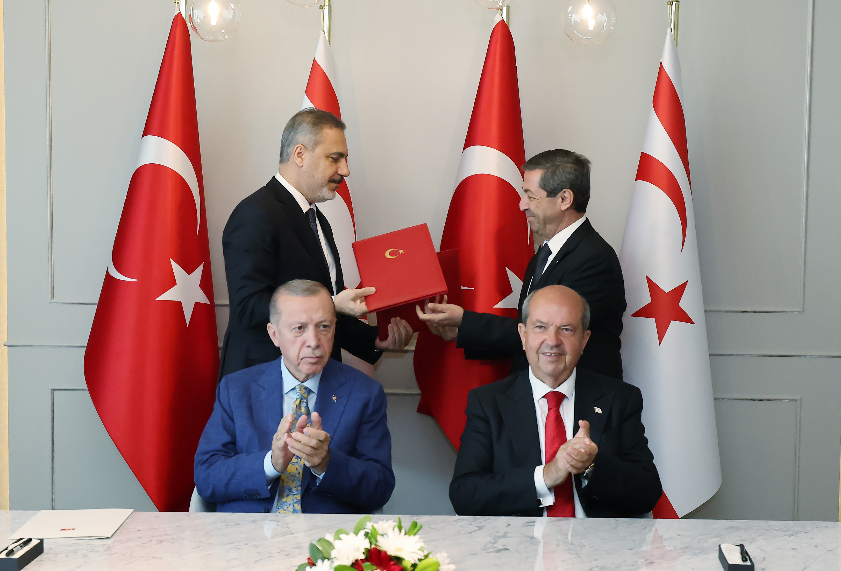 Cumhurbaşkanı Erdoğan ile KKTC Cumhurbaşkanı Tatar'ın, Lefkoşa'daki baş başa görüşmesi sonrasında iki lider, Kuzey Kıbrıs Türk Cumhuriyeti Vatandaşlarına Konsolosluk Hizmeti Sunulması Hakkında Anlaşma ile Kuzey Kıbrıs Türk Cumhuriyeti Düzensiz Göçle Mücadele Merkezi Tesisi Sürecinde Türkiye Cumhuriyeti’nce Verilecek Desteğe İlişkin Mutabakat Zaptı'nı imzaladı.