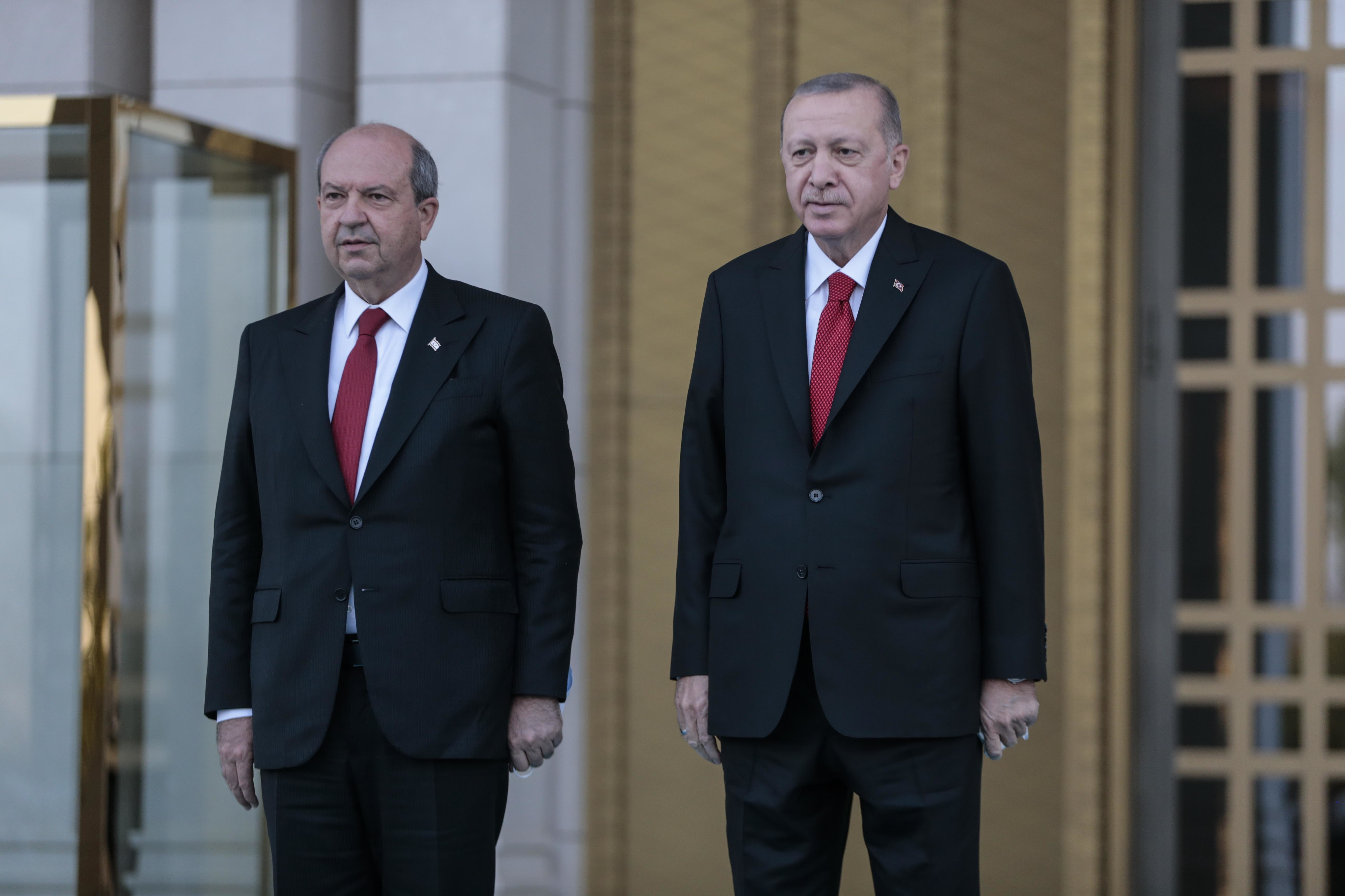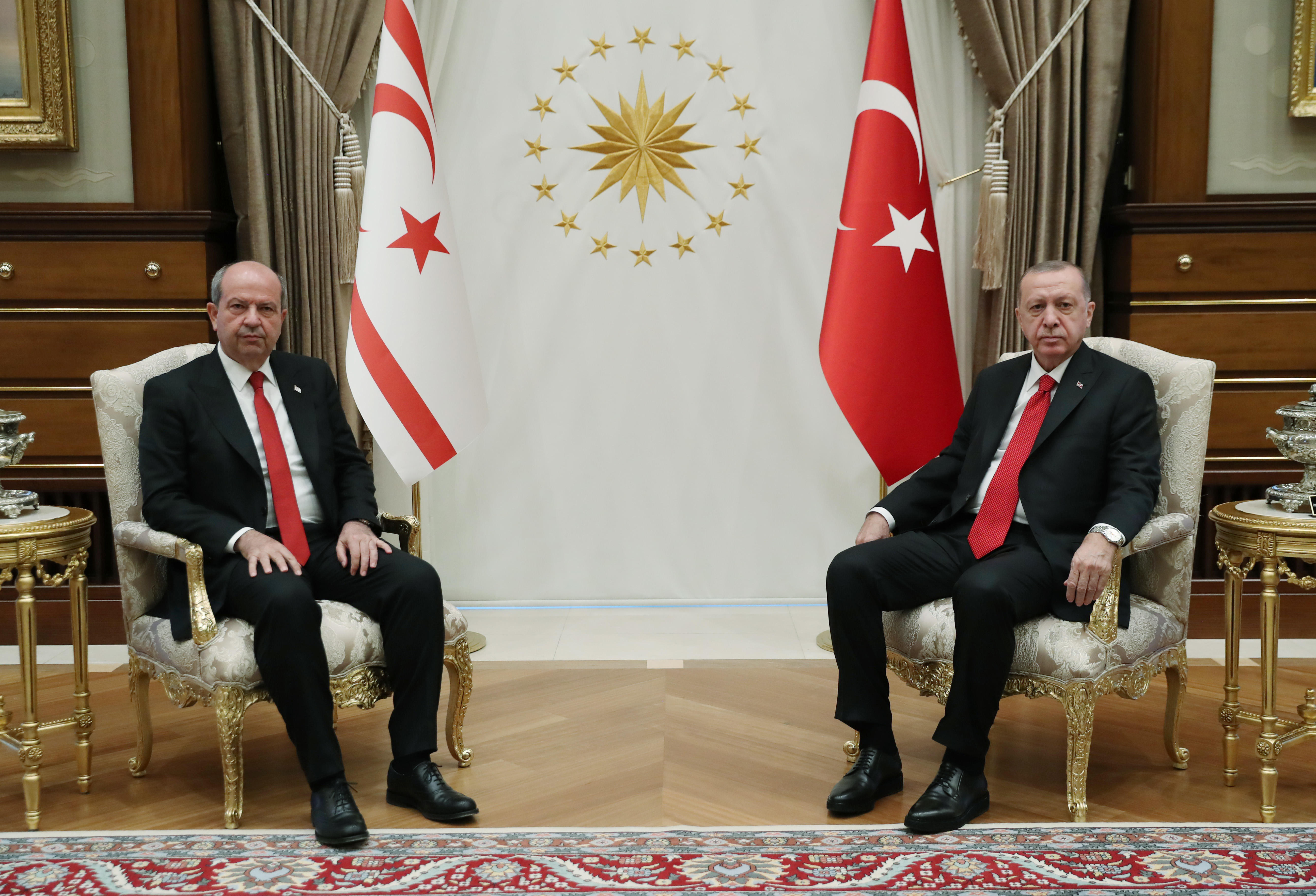Türkiye ve KKTC bayrakları önünde gazetecilere poz veren Cumhurbaşkanı Erdoğan ve Tatar daha sonra baş başa görüşmeye geçti.