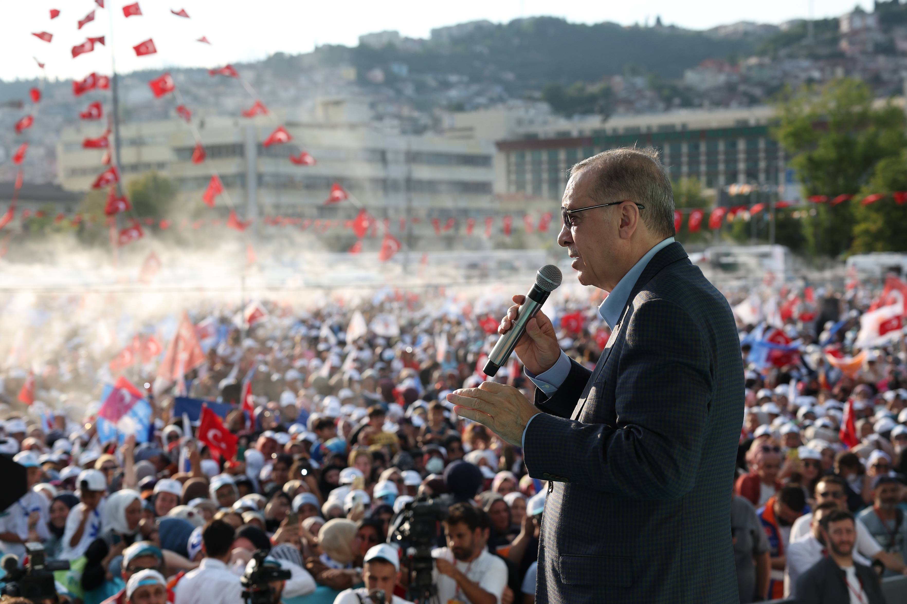 "Buradan 85 milyon vatandaşımın her birine sesleniyorum. Seçim tarihi olan 2023 Haziran'ı gelip çattığında sandık başına giderken lütfen karşınıza çıkan adaylara şu gözle bir bakın. Bu isimlerden hangisi ülkenin başına gelen dönemsel sorunları çözebilir? Bu isimlerden hangisi ülkeyi bölgesel ve küresel mücadelelerden başarıyla çıkartabilir? Bu isimlerden hangisi evlatlarımıza daha iyi bir Türkiye, daha iyi bir gelecek bırakmamızı sağlayabilir? Akıl, vicdan, izan sahibi her bir vatandaşımdan önce bu soruları cevaplayıp, verdiği cevaplara göre tercihini en doğru şekilde yapmasını istiyorum. Şimdi buradan öyle bir ses verin ki 81 vilayetimizin tamamından duyulsun. Şimdi buradan öyle bir ses verin ki dostlarımızın yürekleri ferahlasın, düşmanlarımızın kalpleri daralsın.