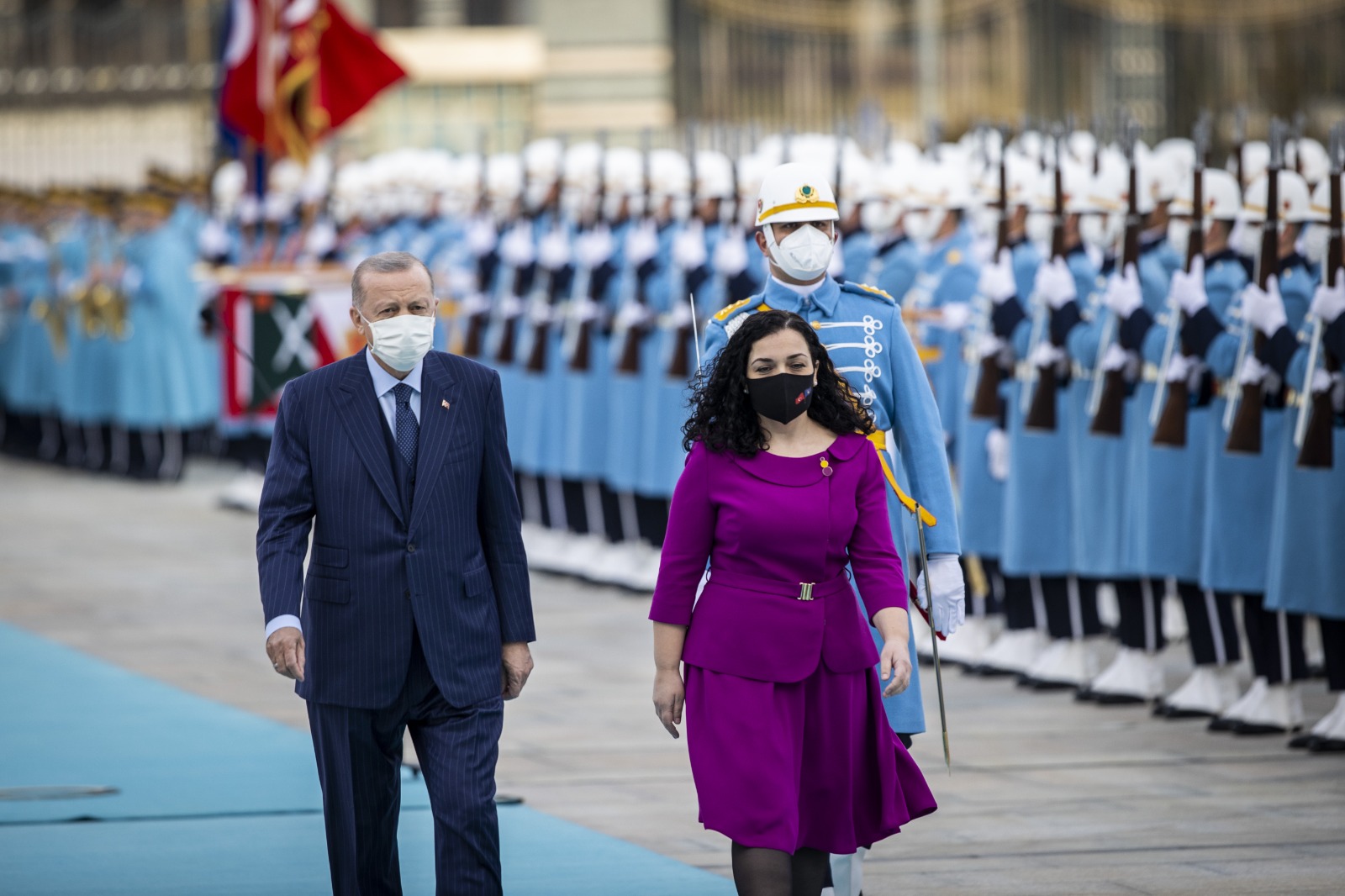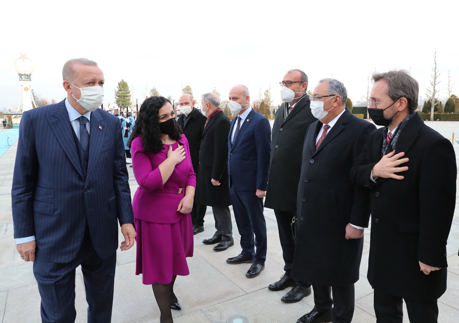 Cumhurbaşkanı Recep Tayyip Erdoğan, Türkiye'ye ziyarette bulunan Kosova Cumhurbaşkanı Vjosa Osmani'yi resmî törenle karşıladı.