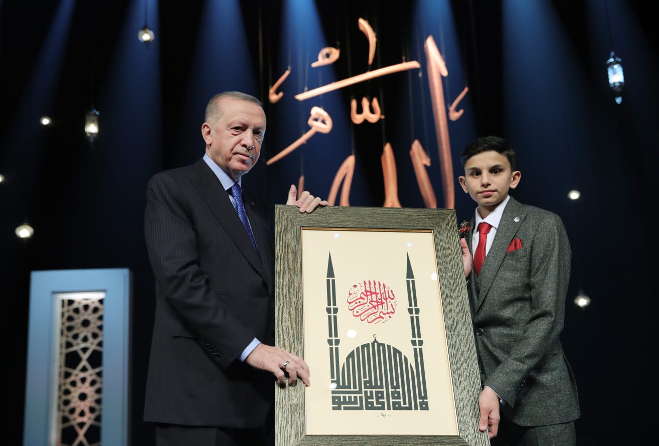 Kur'an-ı Kerim'in edeple, hürmetle, adeta lafzı ve manası katre katre içilerek tilavet edilmesi gerektiğini aktaran Cumhurbaşkanı Erdoğan, "Şüphesiz en güzeli de Kur'an-ı Kerim'in gönülleri okşayan, ruhları tedavi eden, zihinleri harekete geçiren, dinleyen herkesi etkileyen güzel bir sesle okunmasıdır." diye konuştu.