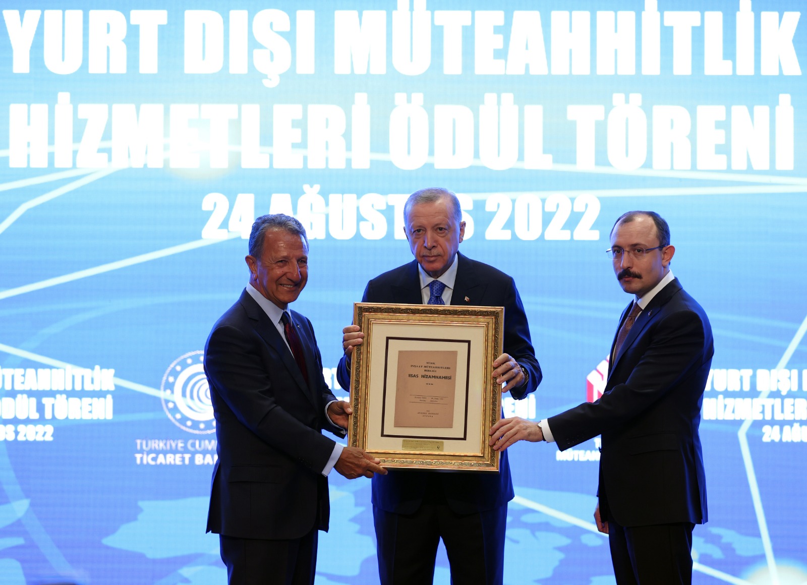 Ticaret Bakanı Mehmet Muş ve Türkiye Müteahhitler Birliği Başkanı Erdal Eren tarafından Cumhurbaşkanı Erdoğan'a, Türkiye Müteahhitler Birliğinin 1955 yılına ait kuruluş nizamnamesi takdim edildi.