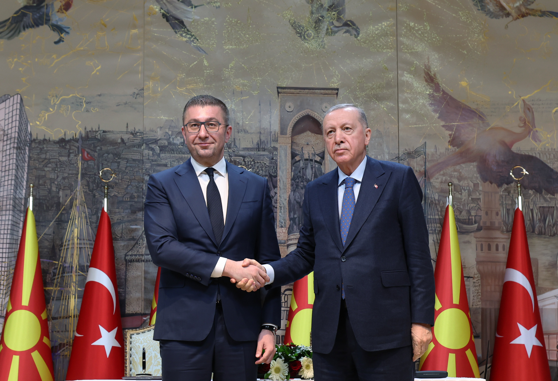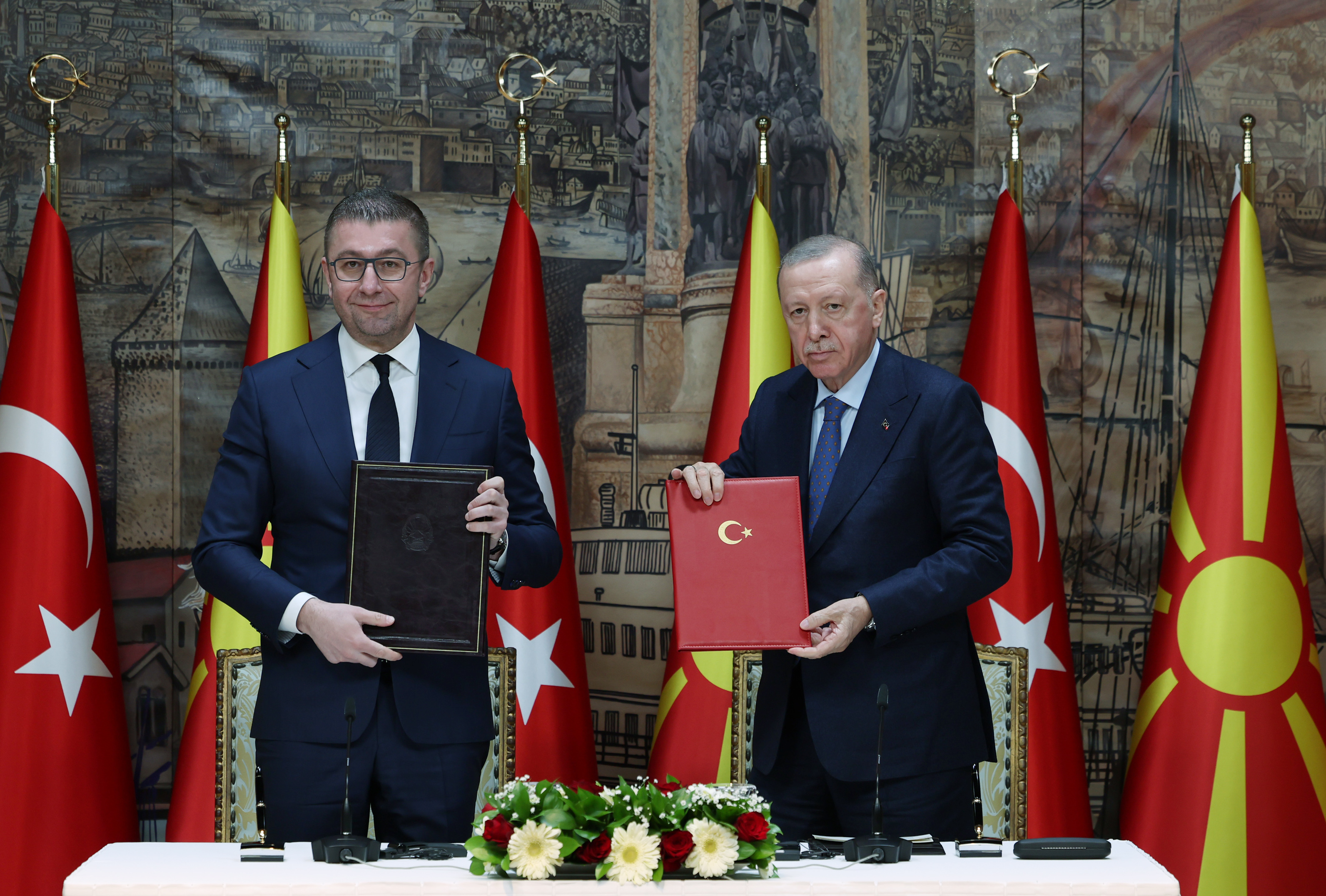 Basın toplantısı öncesi gerçekleştirilen imza töreninde, Cumhurbaşkanı Erdoğan ile Kuzey Makedonya Başbakanı Mickoski, iki ülke arasında Yüksek Düzeyli İş birliği Konseyi kurulmasına ilişkin ortak siyasi bildiriyi imzaladı.