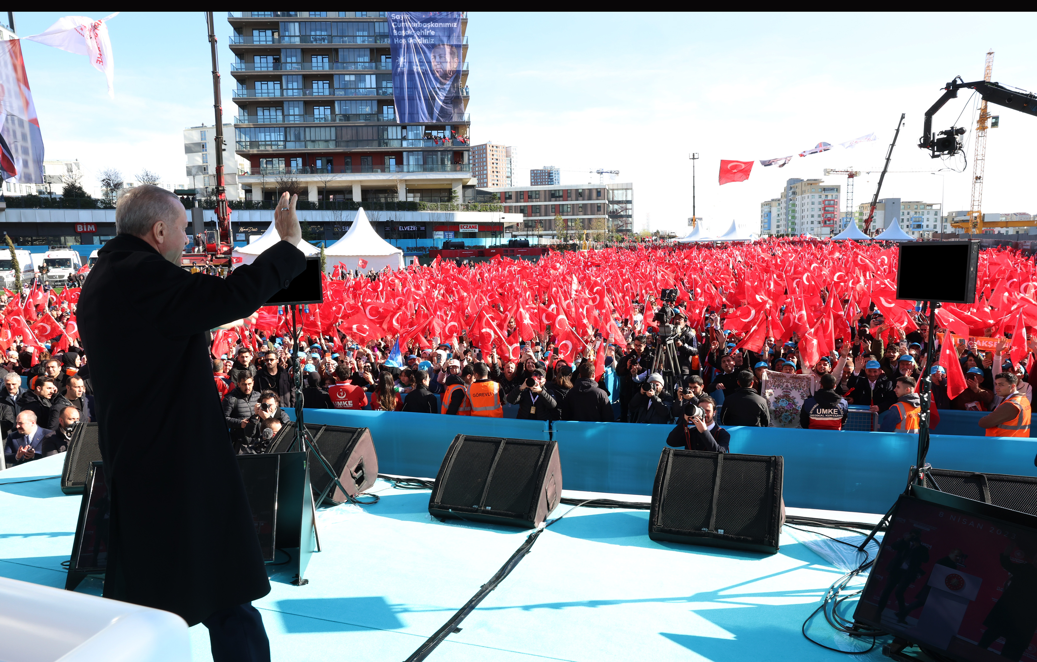 Seçime 35 gün kaldığını anımsatan Cumhurbaşkanı Erdoğan, durmadıklarını, kapı kapı dolaştıklarını belirtti. Cumhurbaşkanı Erdoğan, "Sandıkları patlatmaya var mıyız? Cumhur İttifakı olarak, gümbür gümbür iktidara yürümeye var mıyız?" sorusunu yönelterek "Evet." yanıtını aldığı vatandaşlarla , "Tek millet, tek bayrak, tek vatan, tek devlet. Bir olacağız, iri olacağız, diri olacağız, kardeş olacağız. Hep birlikte Türkiye olacağız." sözlerini tekrarladı.