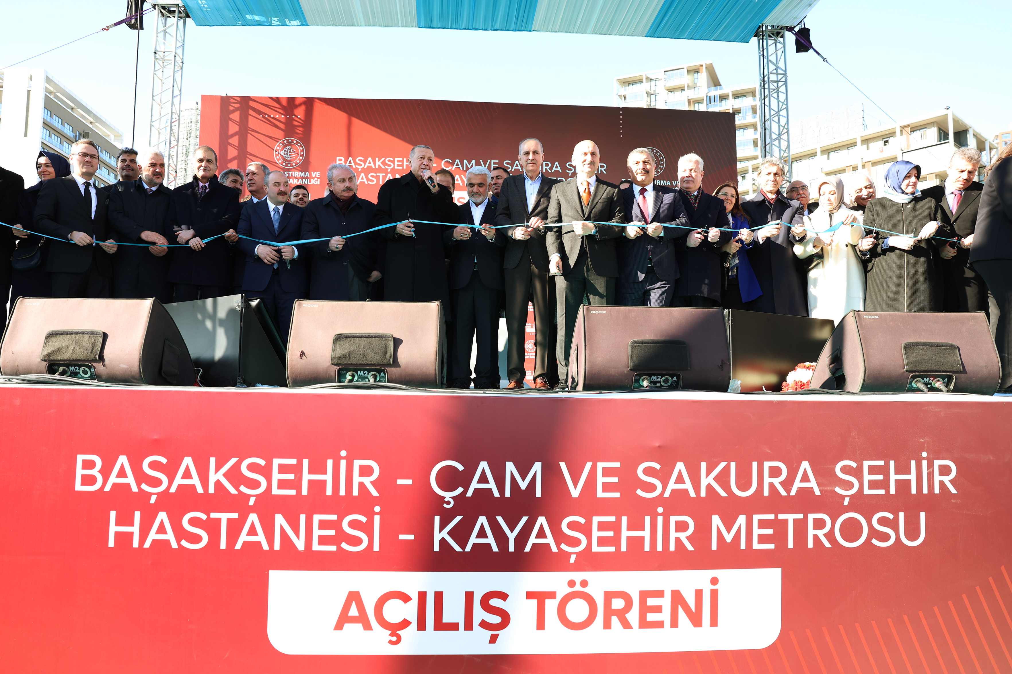 "İstanbul'umuza sadece bir ulaşım altyapısı değil aynı zamanda sembol mekânlar da kazandırmak istedik. Çam ve Sakura Şehir Hastanesi istasyonunda, Çam ve Sakura'yla birlikte tüm şehir hastanelerimizi tanıtan özel atrium inşa ettik. Kayaşehir istasyonumuzda ışıklarıyla, ahşap görünümü veren kaplamasıyla yer altında bekleyen yolculara sıcak bir atmosfer sunduk. Estetik özellikleri yanında metro hattımızla bölgenin önemli bir ihtiyacını da gideriyoruz. Kent merkezi ile Çam ve Sakura Şehir Hastanesi arasında artık ulaşım daha hızlı, ekonomik ve güvenli olacaktır. Biliyorsunuz Çam ve Sakura Şehir Hastanesi açılacağı zaman oranın yolunu da asıl sorumlusu yapmadığı için yani Büyükşehir yapmadığı için biz inşa etmiştik. Bu metro hattımızı diğer toplu taşıma modlarıyla entegre ederek, İstanbul Havalimanı dahil birçok yere kolayca ulaşılabilmesini sağladık. Artık beklemek, trafikte vakit kaybetmek zorunda kalmayacaksınız. Başakşehir, size bu yakışır da onun için."