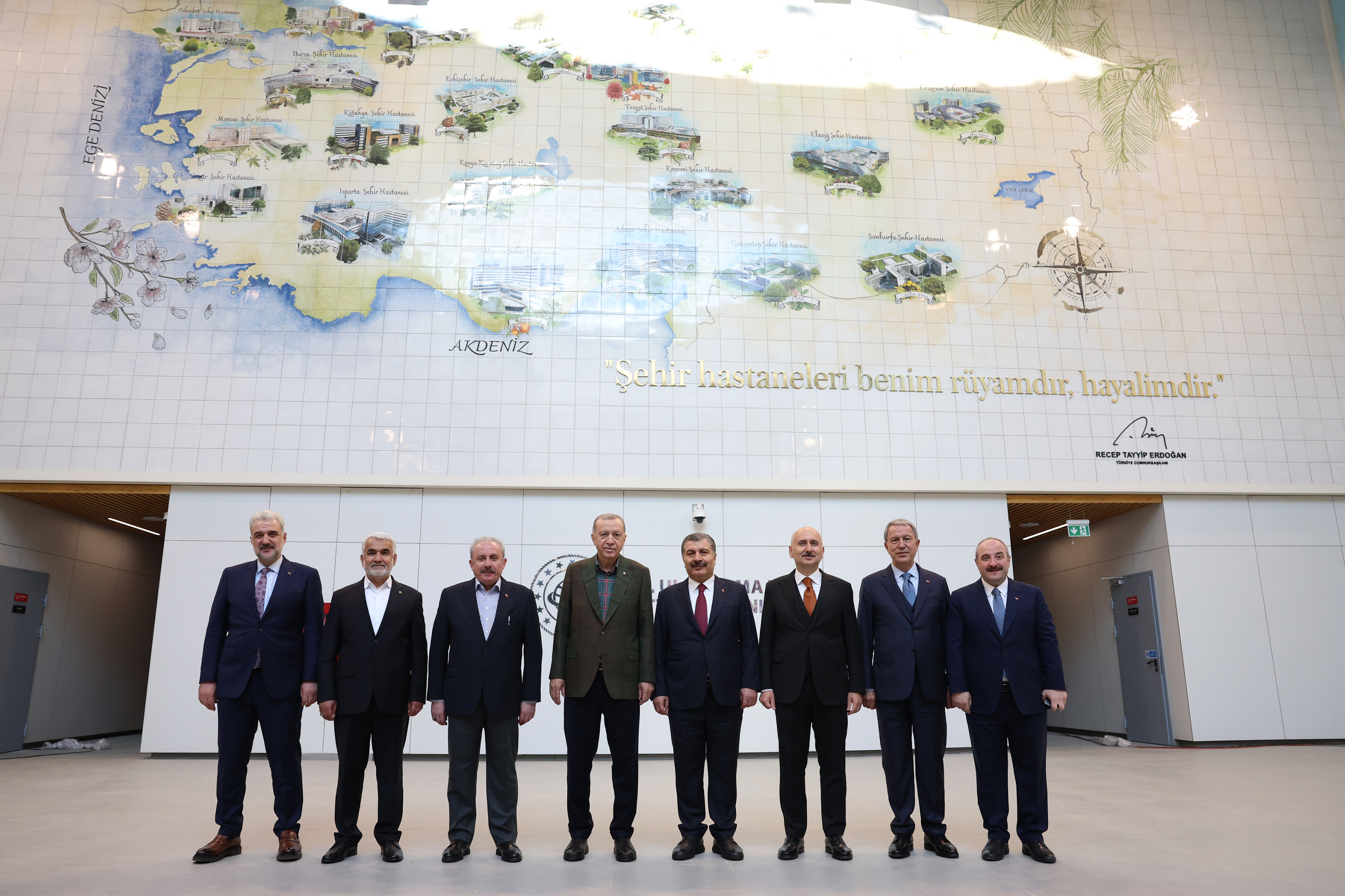 Metro istasyonunda Bakan Karaismailoğlu'ndan bilgi alan Cumhurbaşkanı Erdoğan, ardından üzerinde ülke genelinde yapılan şehir hastanelerinin görselleri ile "Şehir hastaneleri benim rüyamdır, hayalimdir." sözünün yazılı olduğu duvar önünde ilk olarak tek, ardından TBMM Başkanı Şentop, Bakanlar Karaismailoğlu, Varank, Akar ve Koca, HÜDA PAR Genel Başkanı Yapıcıoğlu ve AK Parti İl Başkanı Kabaktepe ile hatıra fotoğrafı çektirdi.