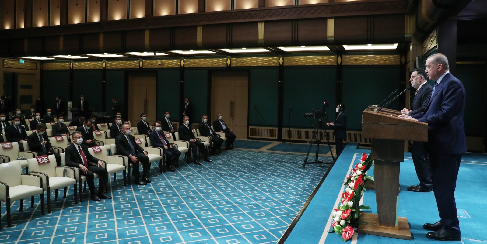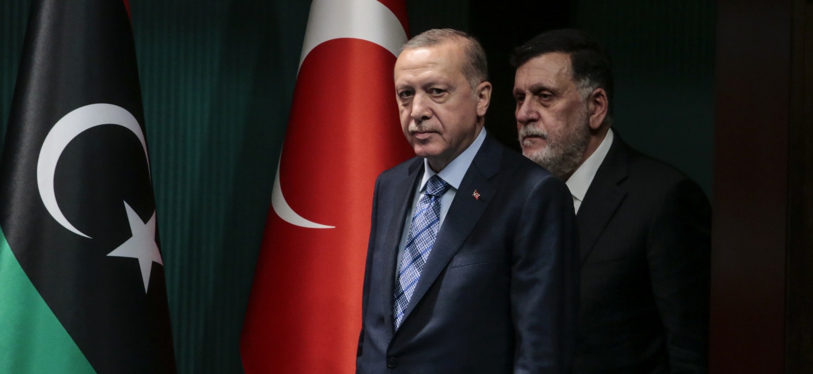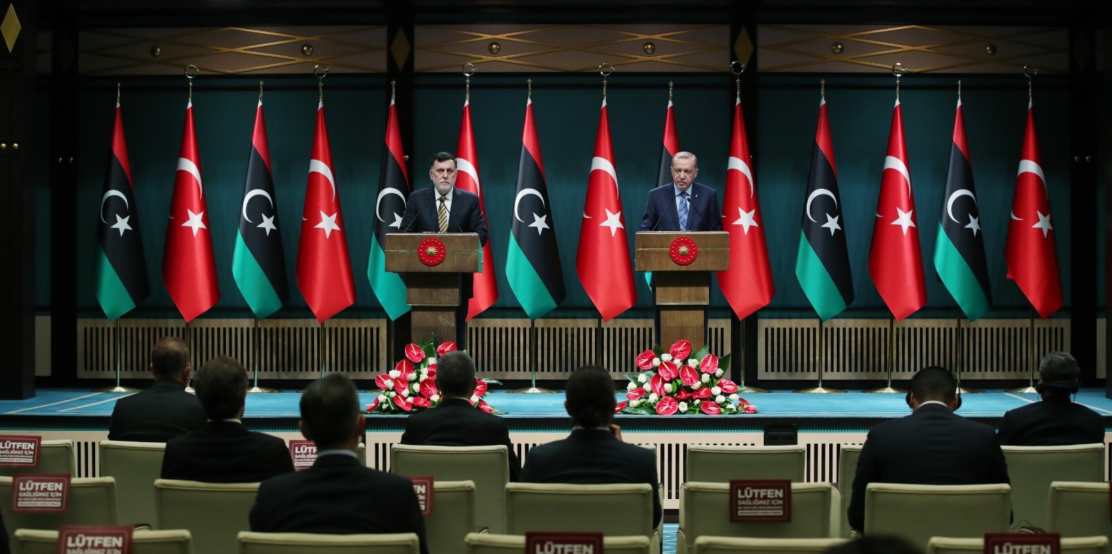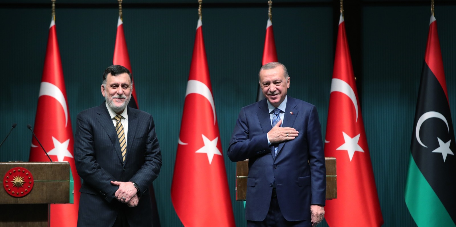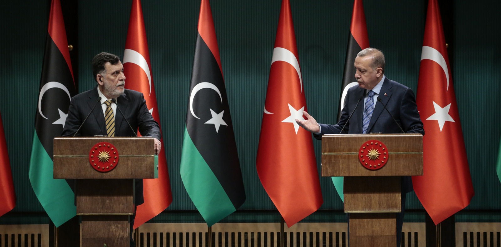 Cumhurbaşkanı Recep Tayyip Erdoğan ve Libya Başbakanı Fayiz es-Serrac Cumhurbaşkanlığı Külliyesi'ndeki görüşmenin ardından ortak basın toplantısı düzenledi.