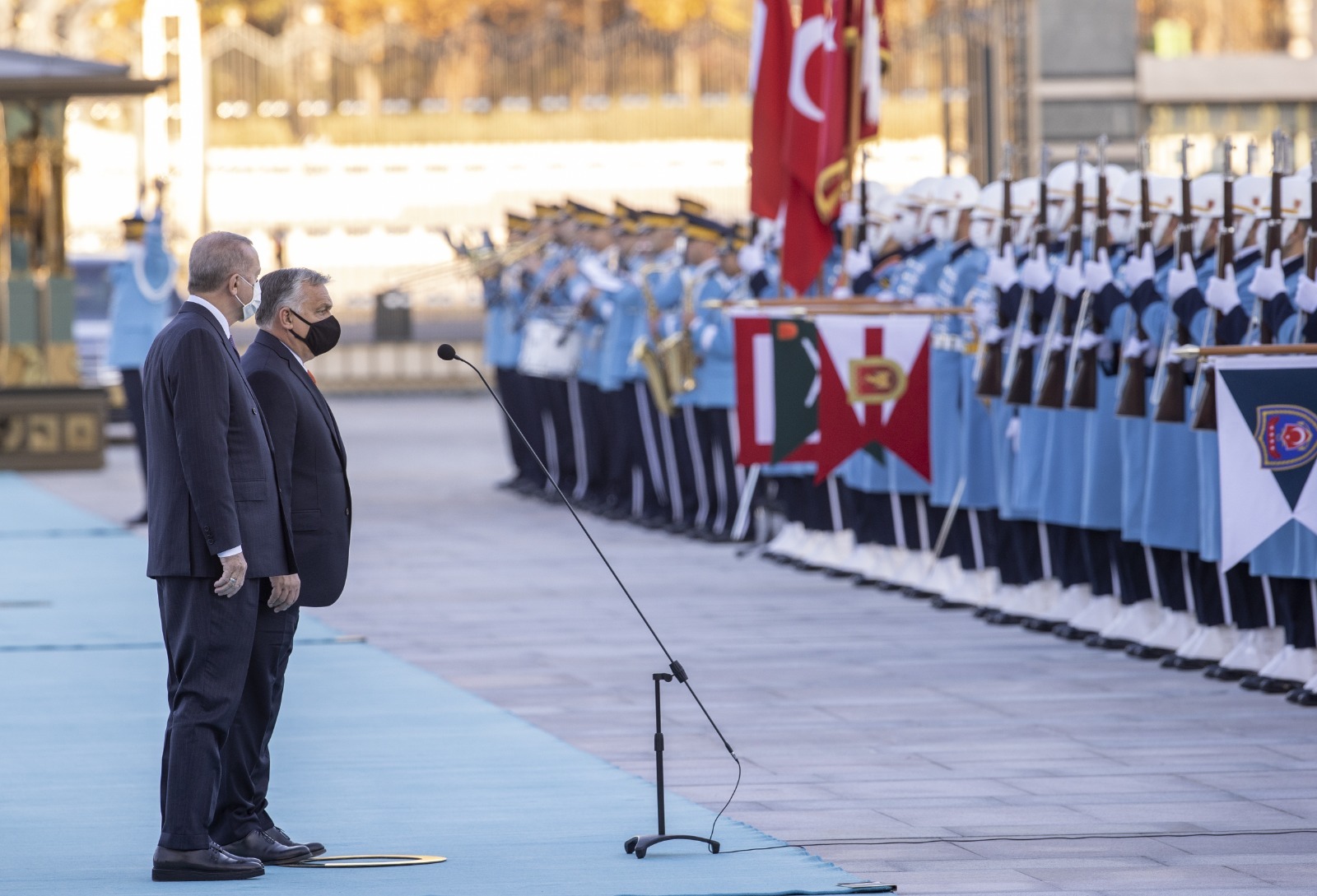 Cumhurbaşkanı Erdoğan ve Macaristan Başbakanı Orban'ın tören alanındaki yerlerini almalarının ardından, 21 pare top atışı eşliğinde iki ülkenin millî marşları çalındı. Macaristan Başbakanı Orban, Muhafız Alayı Tören Kıtası'nı selamladı. Törende, tarihte kurulan 16 Türk devletini temsil eden bayraklar ve askerler de yer aldı.