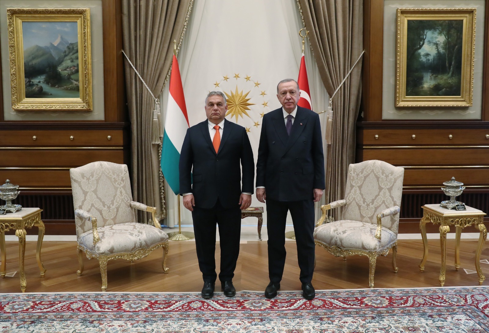 İki ülke heyetlerinin takdimi sonrasında Cumhurbaşkanı Erdoğan ve Macaristan Başbakanı Orban, merdivenlerde Türkiye ve Macaristan bayrakları önünde gazetecilere poz verdi.
