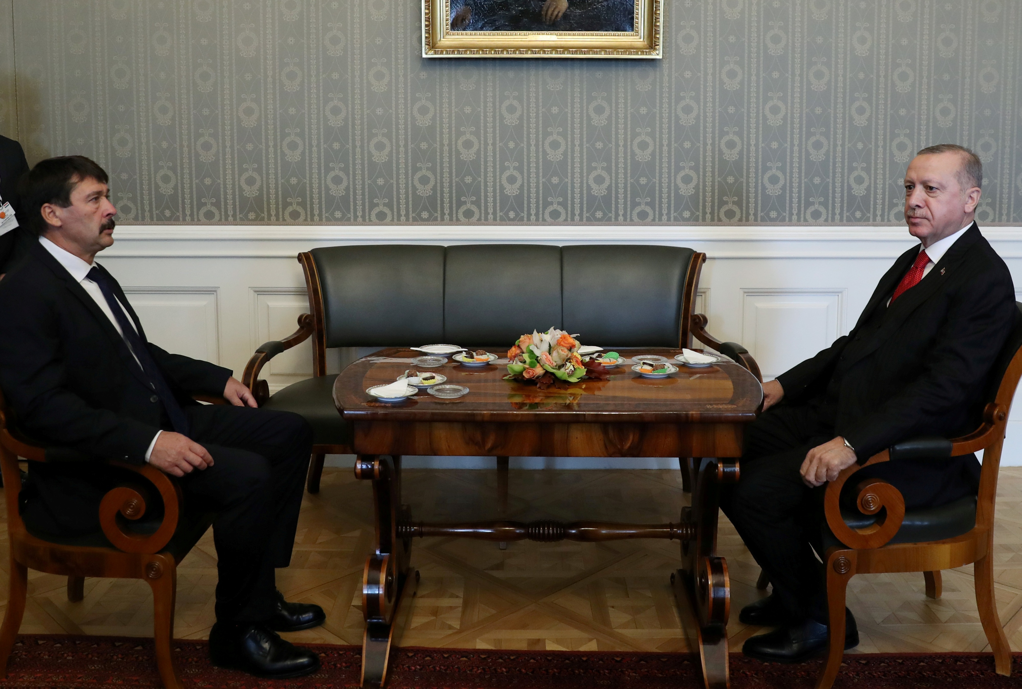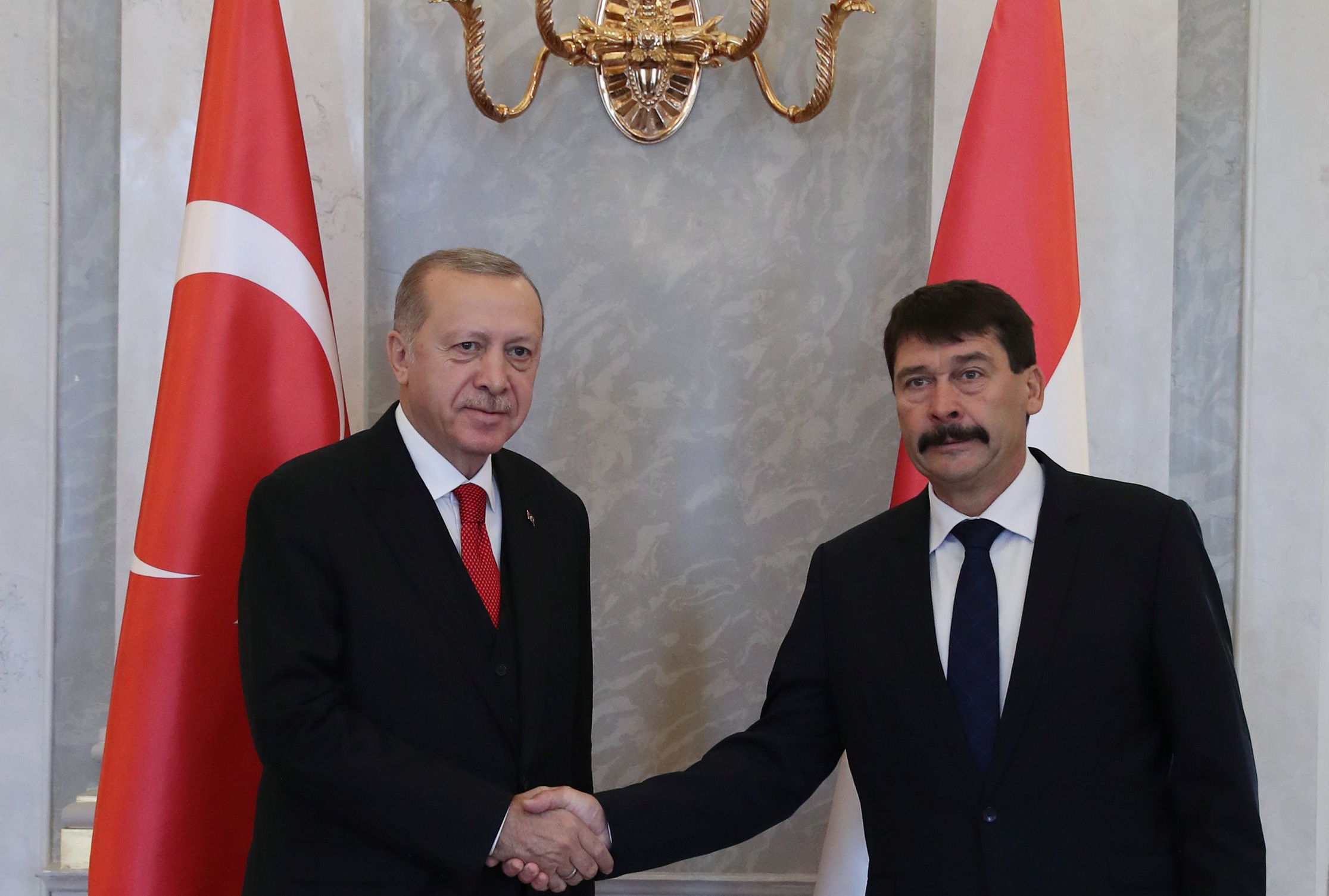 Ülkedeki temasları kapsamında Cumhurbaşkanı Erdoğan ilk olarak Macaristan Cumhurbaşkanı Janos Ader ile Sandor Sarayında baş başa bir görüşme gerçekleştirdi. Cumhurbaşkanı Erdoğan, Sandor Sarayına gelişinde Macaristan Cumhurbaşkanı Ader tarafından karşılandı. Görüşme öncesinde Cumhurbaşkanı Erdoğan ve Macaristan Cumhurbaşkanı Ader Türkiye ve Macaristan bayrakları önünde tokalaşarak gazetecilere görüntü verdi.