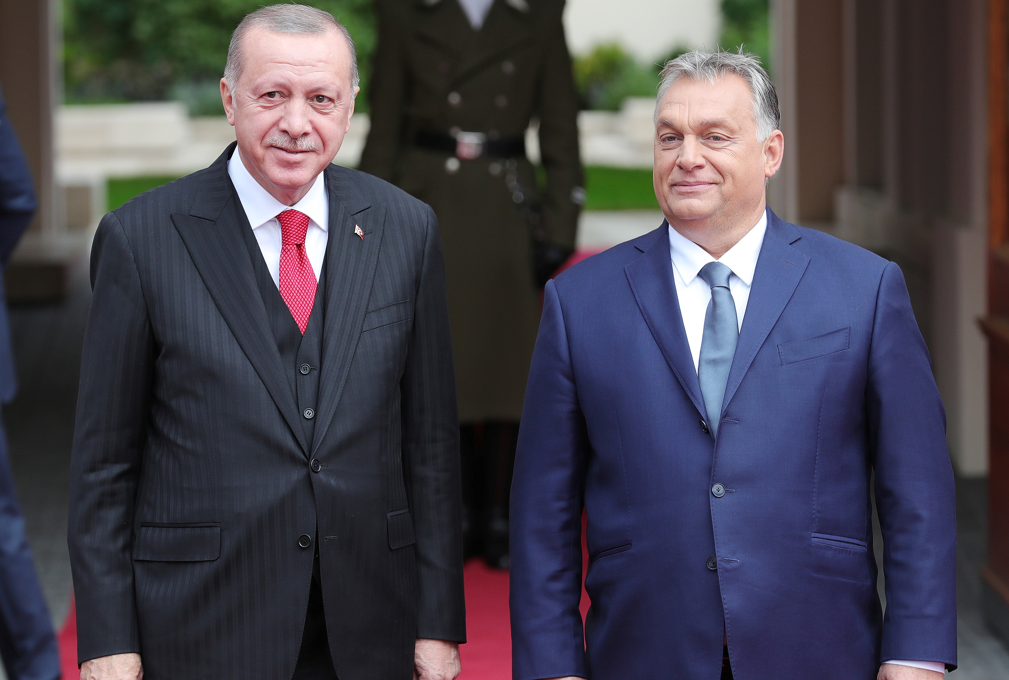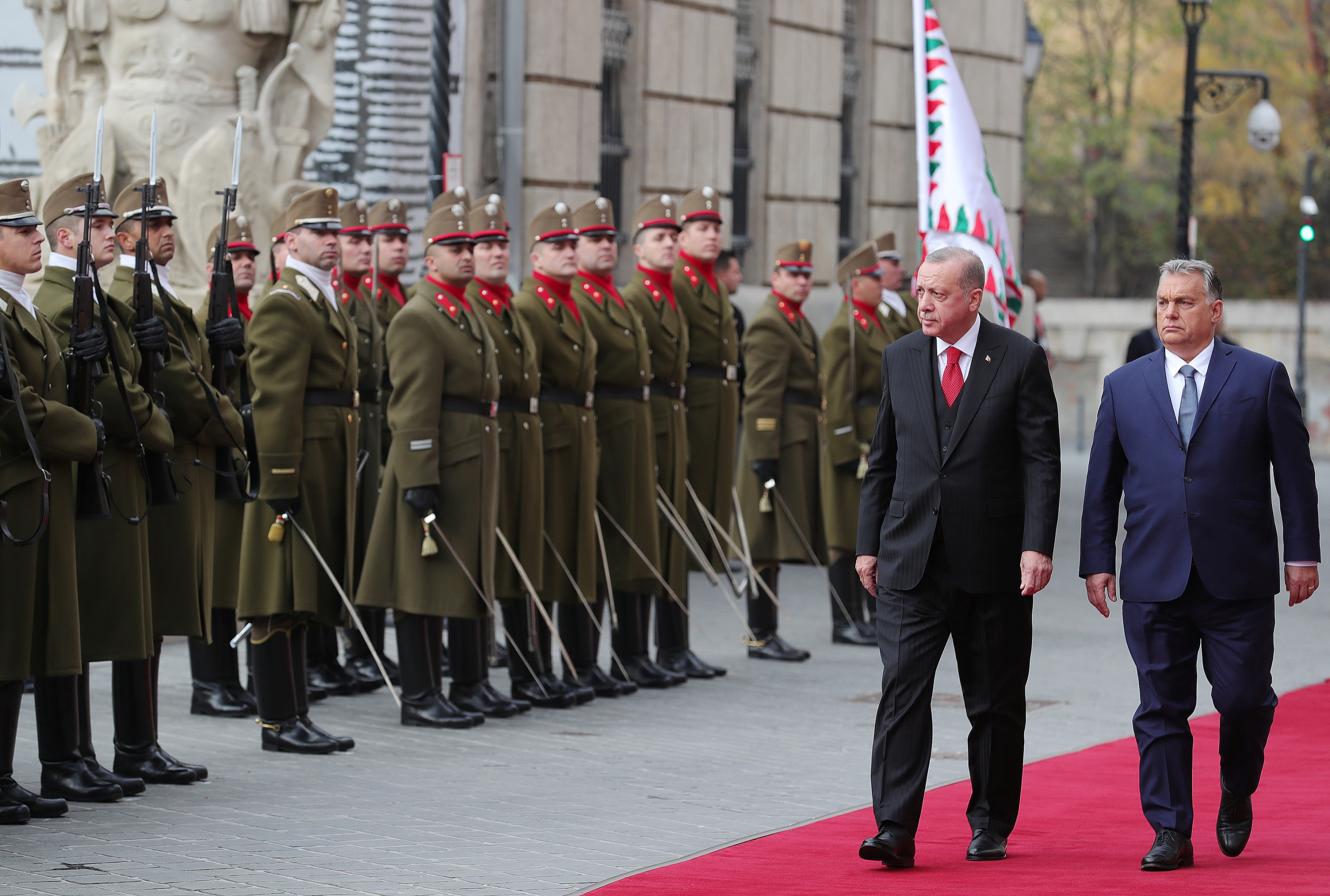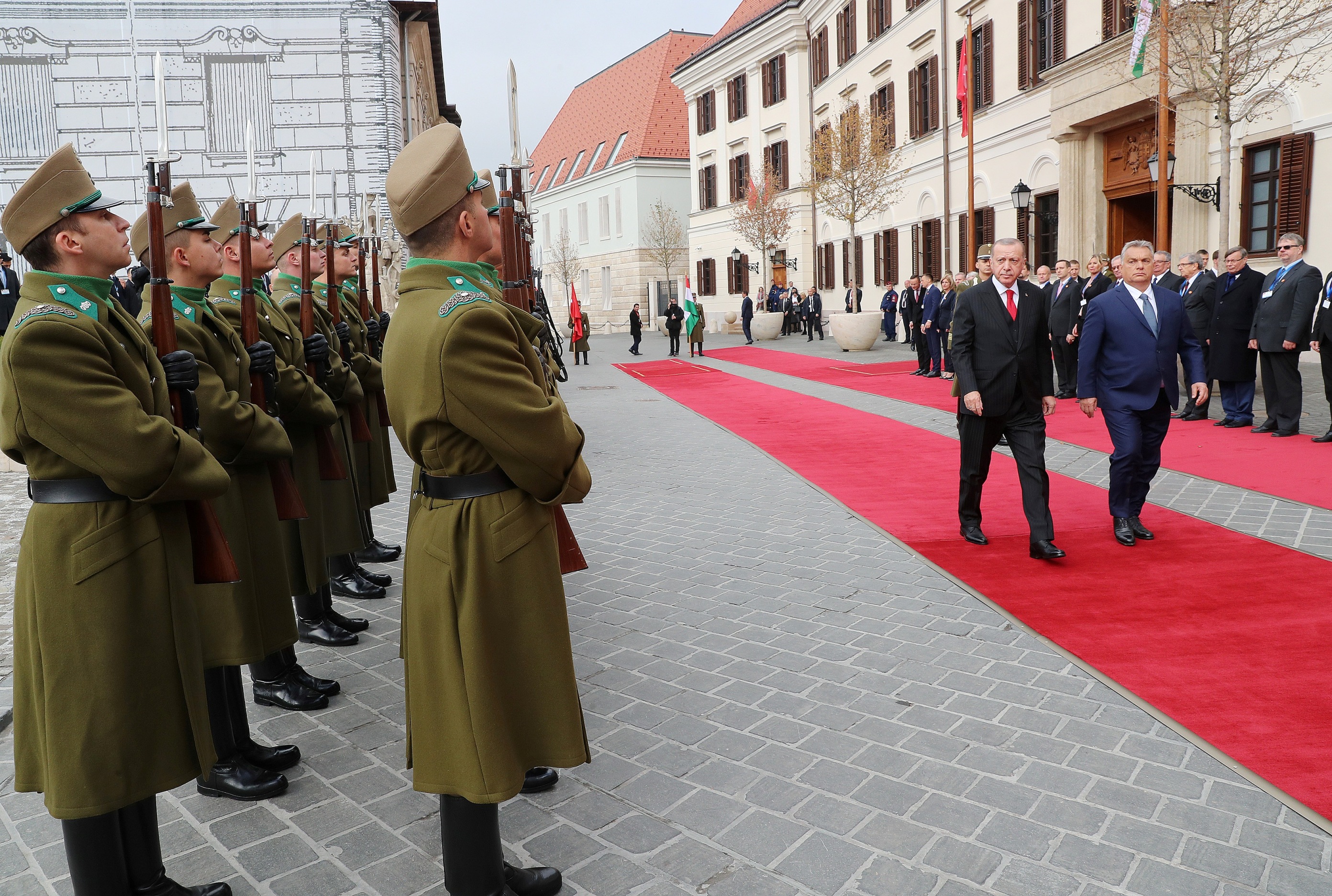 Macaristan Başbakanlık Ofisindeki resmî törende, iki ülkenin millî marşlarının çalınmasının ardından Cumhurbaşkanı Erdoğan, tören kıtasını selamladı.