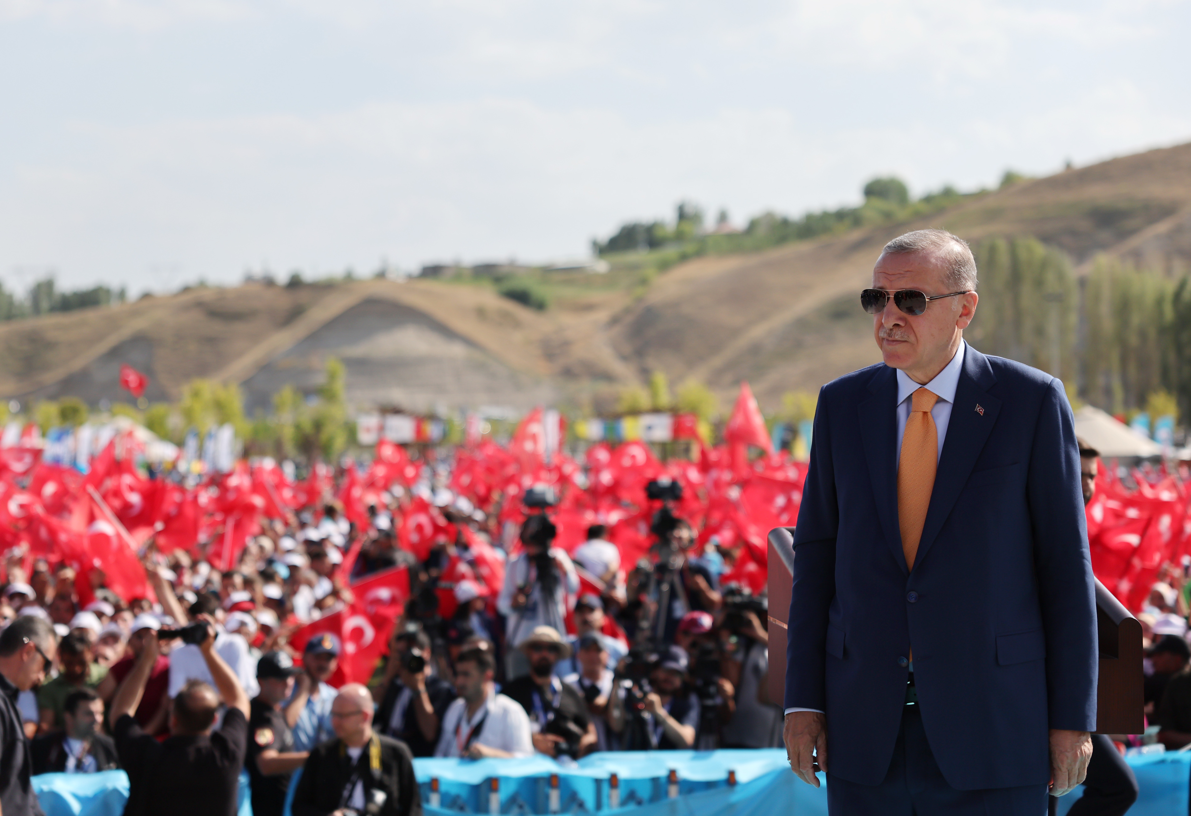 Şehit Tümgeneral Aydoğan Aydın'ın yazdığı şiirin "Soğuk namlular elimizde, yürüyorken dağlara/Şehitlerden selam geldi, savaşan tüm sağlara." dizelerini okuyan Cumhurbaşkanı Erdoğan, Türkiye'deki her bir insanın refahını, hayat kalitesini ve standartlarını yükseltmek için asırlara bedel eserler ve hizmetler ürettiklerini vurguladı.