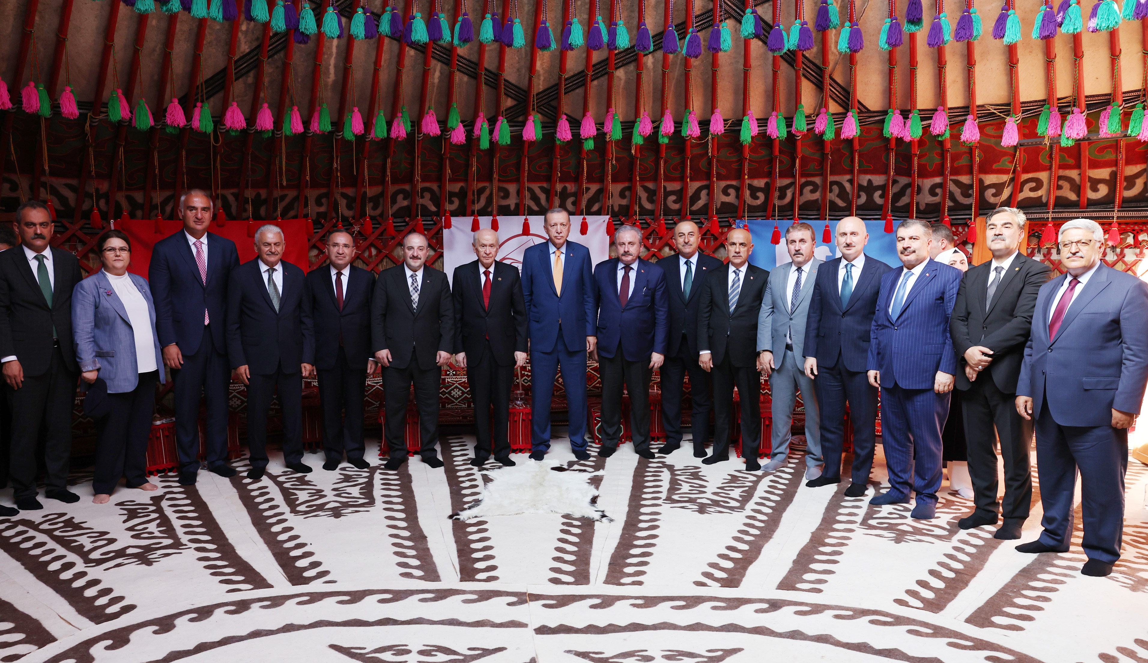 Cumhurbaşkanı Erdoğan'a, Türkiye Büyük Millet Meclisi Başkanı Mustafa Şentop, MHP Genel Başkanı Devlet Bahçeli, Aile ve Sosyal Hizmetler Bakanı Derya Yanık, Dışişleri Bakanı Mevlüt Çavuşoğlu, İçişleri Bakanı Süleyman Soylu, Adalet Bakanı Bekir Bozdağ, Hazine ve Maliye Bakanı Nureddin Nebati, Kültür ve Turizm Bakanı Mehmet Nuri Ersoy, Milli Savunma Bakanı Hulusi Akar, Milli Eğitim Bakanı Mahmut Özer, Sağlık Bakanı Fahrettin Koca, Sanayi ve Teknoloji Bakanı Mustafa Varank, Ulaştırma ve Altyapı Bakanı Adil Karaismailoğlu, Tarım ve Orman Bakanı Vahit Kirişci, Ticaret Bakanı Mehmet Muş ve AK Parti Genel Başkanvekili Binali Yıldırım ile BBP Genel Başkanı Mustafa Destici de eşlik etti.
