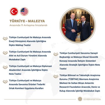 Cumhurbaşkanı Erdoğan ve Enver İbrahim, baş başa ve heyetler arası görüşmelerin ardından iki ülke arasındaki anlaşmaların imza törenine geçti. Cumhurbaşkanı Recep Tayyip Erdoğan ile Malezya Başbakanı Enver İbrahim huzurunda iki ülke arasında 11 anlaşma imzalandı.