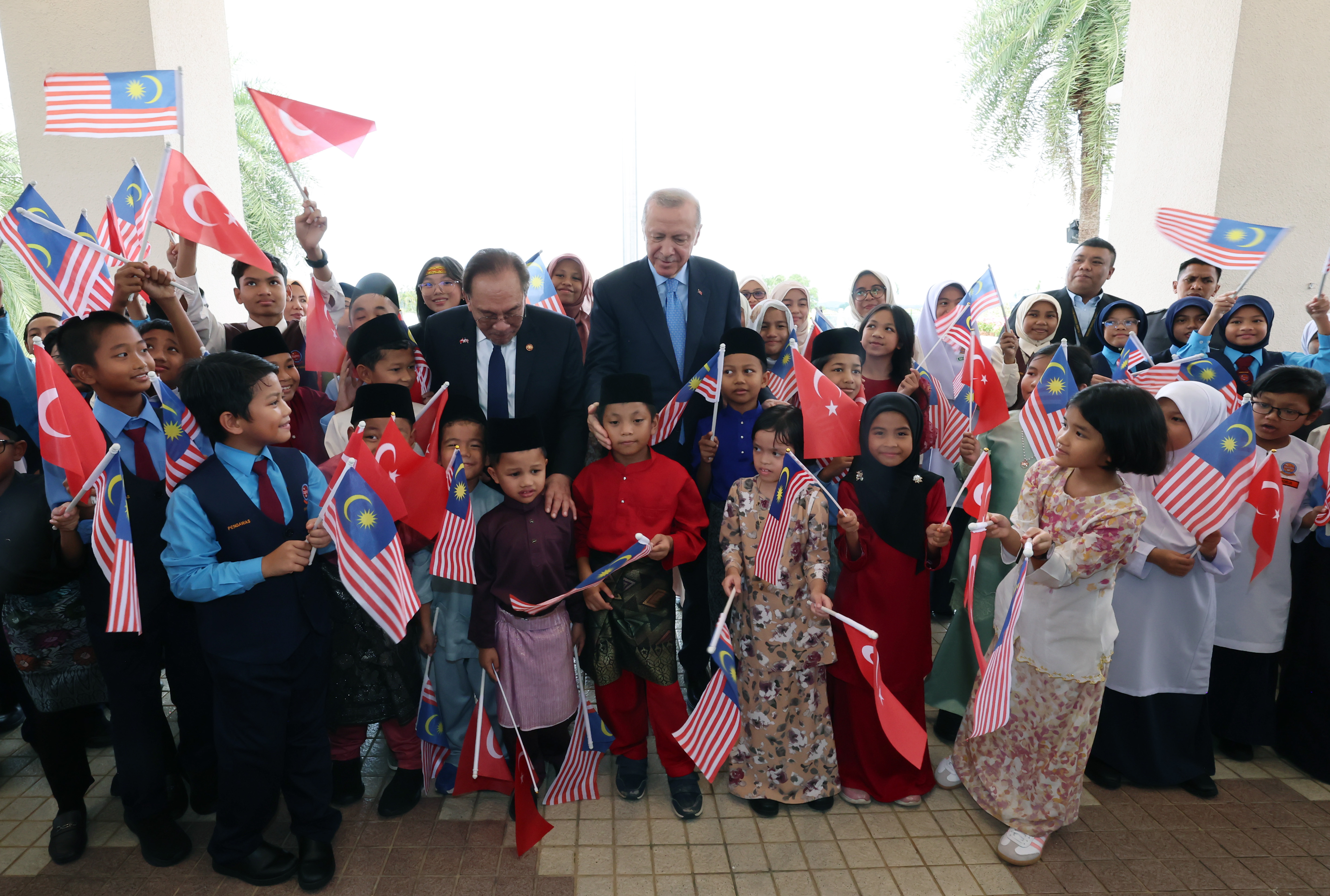 Cumhurbaşkanı Erdoğan, Togg teslim törenine katılan, ellerinde Malezya ve Türkiye bayrakları bulunan çocuklarla ilgilendi, onlarla fotoğraf çektirdi.