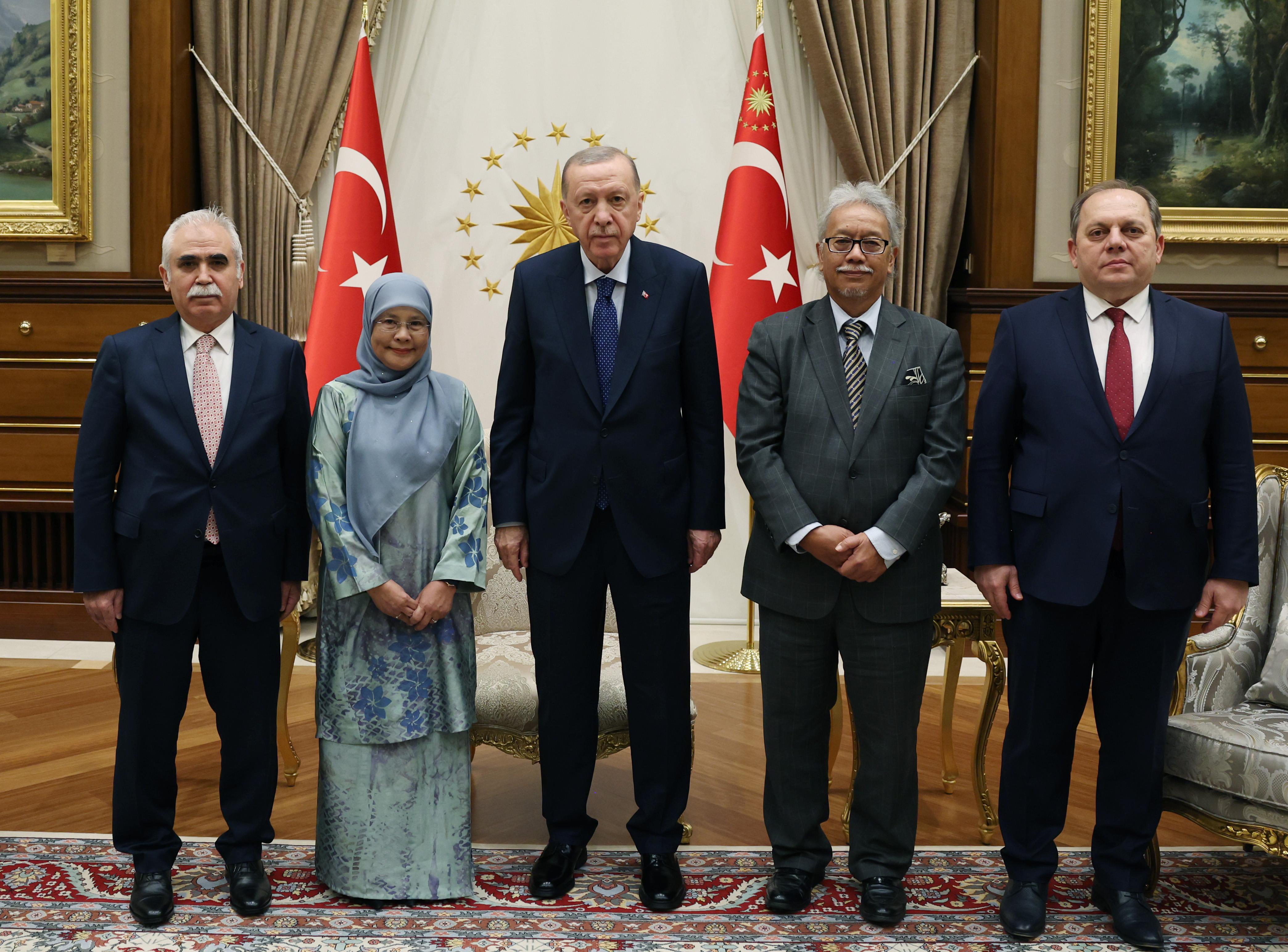Cumhurbaşkanı Recep Tayyip Erdoğan, Malezya Federal Mahkemesi Başkanı Tun Tengku Maimun Binti Tuan Mat ile Malezya Temyiz Mahkemesi Başkanı Tan Sri Datuk Amar Abang Iskandar Bin Abang Hashim'i Cumhurbaşkanlığı Külliyesi'nde kabul etti.
