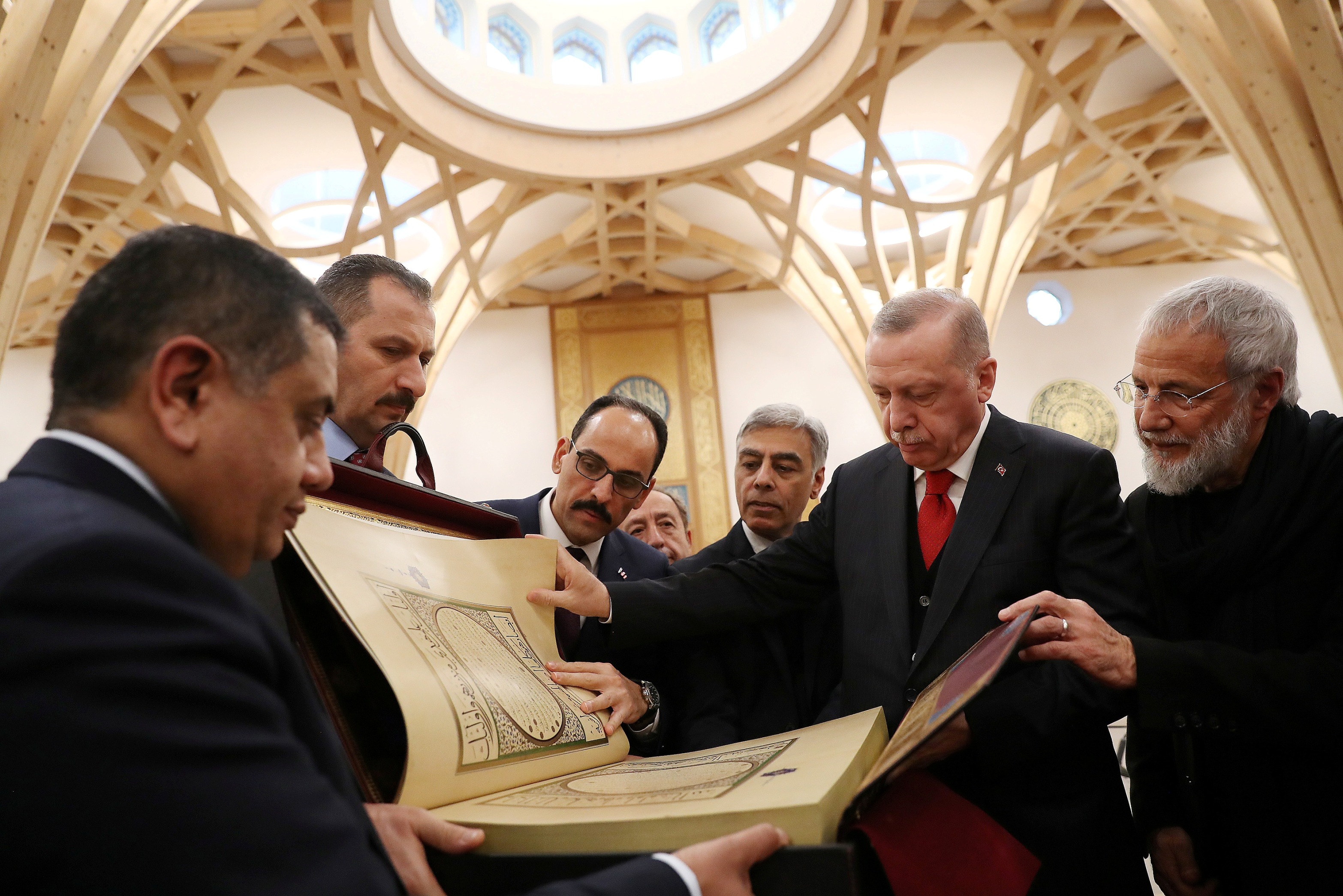 "Caminin şehrimize kazandırılmasında başta Diyanet İşleri Başkanlığı ile Türkiye Diyanet Vakfı olmak üzere, farklı kurumlarımızın çok büyük payı var. Diyanet Vakfımızla birlikte projeye öncülük eden Sayın Abdul Hakim Murat ile Sayın Yusuf İslam kardeşimi, Cami Mütevelli Heyeti'nin kıymetli üyelerini ayrıca tebrik ediyorum. Tabii Zeynep kızımızı da bu arada ihmal edemem. Öyle mi Yusuf kardeşim? Çok gayretli, çok koştu, beni de koşturdu, Sağ olsun, var olsun. İşçisinden mühendisine, mimarından hattatına, Onun için üstat Hüseyin Kutlu hattatımıza özellikle teşekkür etmeden geçemeyeceğiz ve Hüseyin Kutlu üstadımızın tüm eserleri şu anda kendisini anmamıza zaten vesile oluyor. Allah uzun ömürler versin daha nice eserleriyle inşallah birlikte olalım. Tabii bu arada hattatların yanında müzehhibinden marangozuna kadar emek sahibi herkesi gönülden kutluyorum. Gerçekten burada ciddi manada marangozlarımızın eserlerini görüyoruz. Sordum, burada çivi yok. Gördüğünüz gibi bütün ahşap işler birbirine geçme, bu şekilde yapıldı. Tarih de buna şahitlik edecek. O bakımdan bu yönüyle de eser çok önemli."