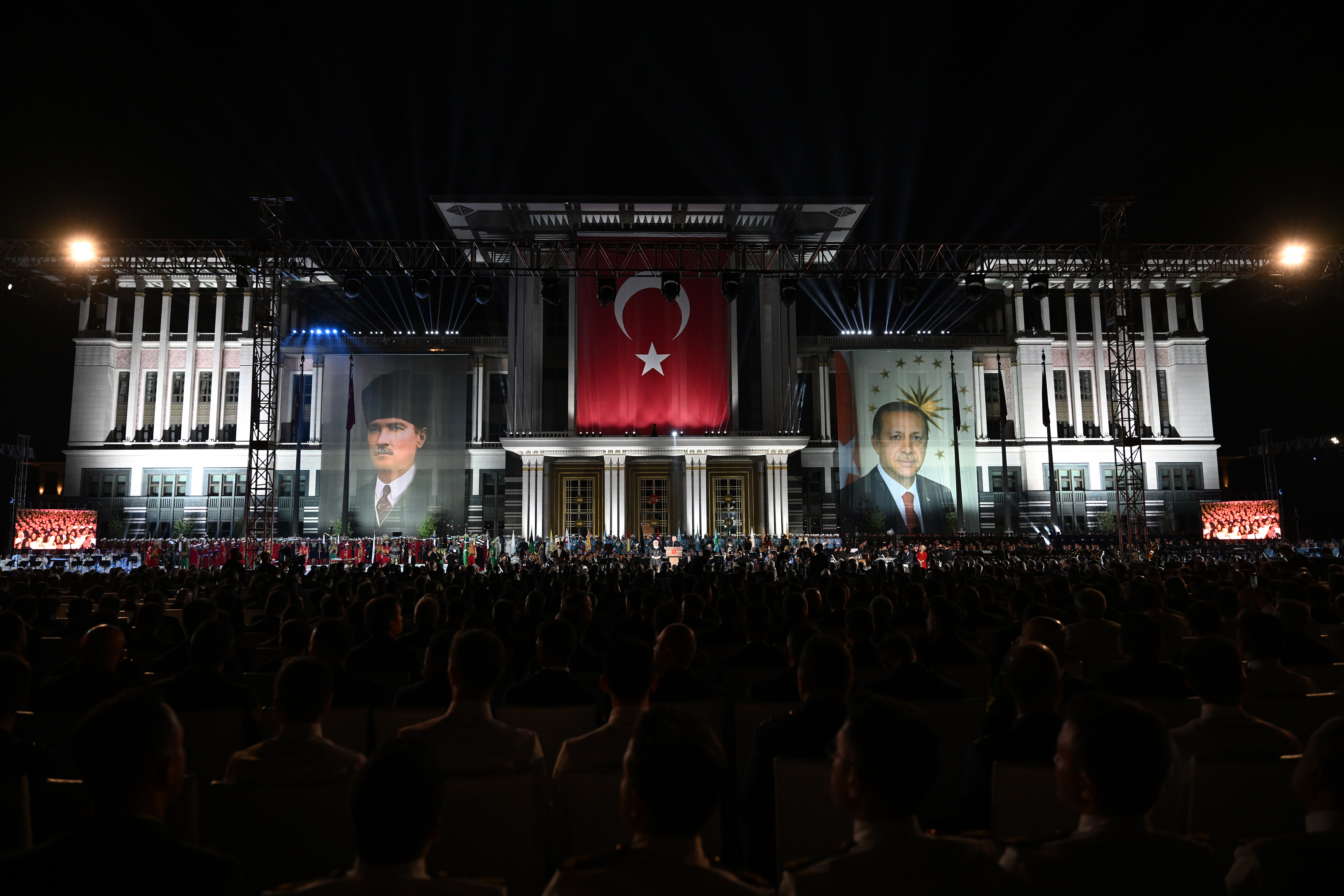 Libya, Kosova, Katar, Bosna Hersek, Somali ve Kuzey Kıbrıs Türk Cumhuriyeti'nde görev yapan askeri birliklerin 30 Ağustos Zafer Bayramı kutlama mesajlarının da yayınlandığı programda, Cumhurbaşkanı Erdoğan'ın davetlilere hitabının ardından şarkıcı Ferhat Göçer, MSB Armoni Mızıkası eşliğinde şarkılar seslendirdi.