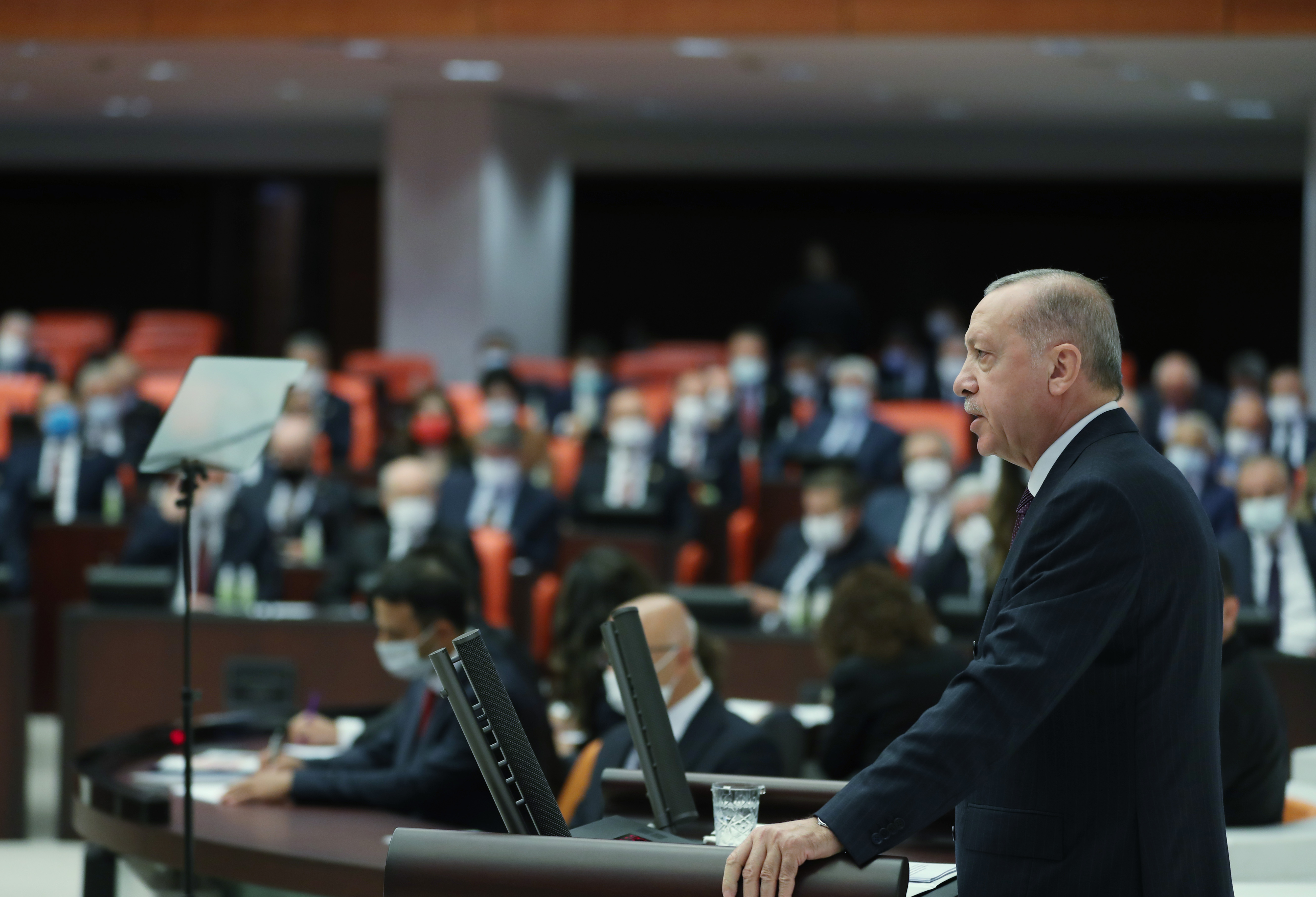 Türkiye'nin, işte bu zorlu dönemde güçlü kalmayı başaran, hatta gücünü artıran az sayıdaki ülkeden biri olduğunu ifade eden Cumhurbaşkanı Erdoğan, "Böylesine kritik bir dönemde, iktidarı ve muhalefetiyle bazı hakikatleri açık yüreklilikle ortaya koymak, geleceğe ilişkin yol haritamızı da buna göre belirlemek mecburiyetindeyiz. Her şeyden önce bu salgının Türkiye’de çıkmadığı ve ülkemizin tüm dünyayı sarsan bir krizin etkilerine maruz kaldığı gerçeğinin kabul edilmesi gerekiyor." şeklinde konuştu.