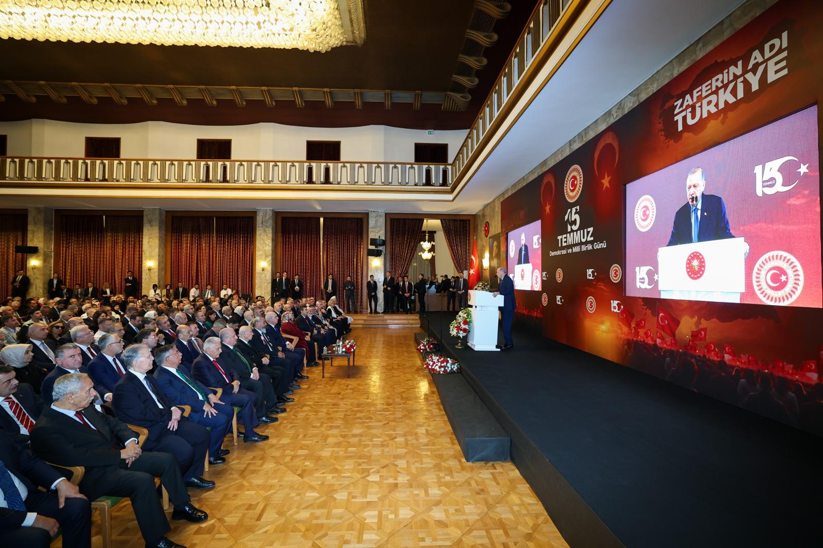 Cumhurbaşkanı Recep Tayyip Erdoğan, TBMM Tören Salonu'nda "Zaferin Adı Türkiye" temasıyla düzenlenen 15 Temmuz Demokrasi ve Millî Birlik Günü Anma Töreni'ne katıldı.