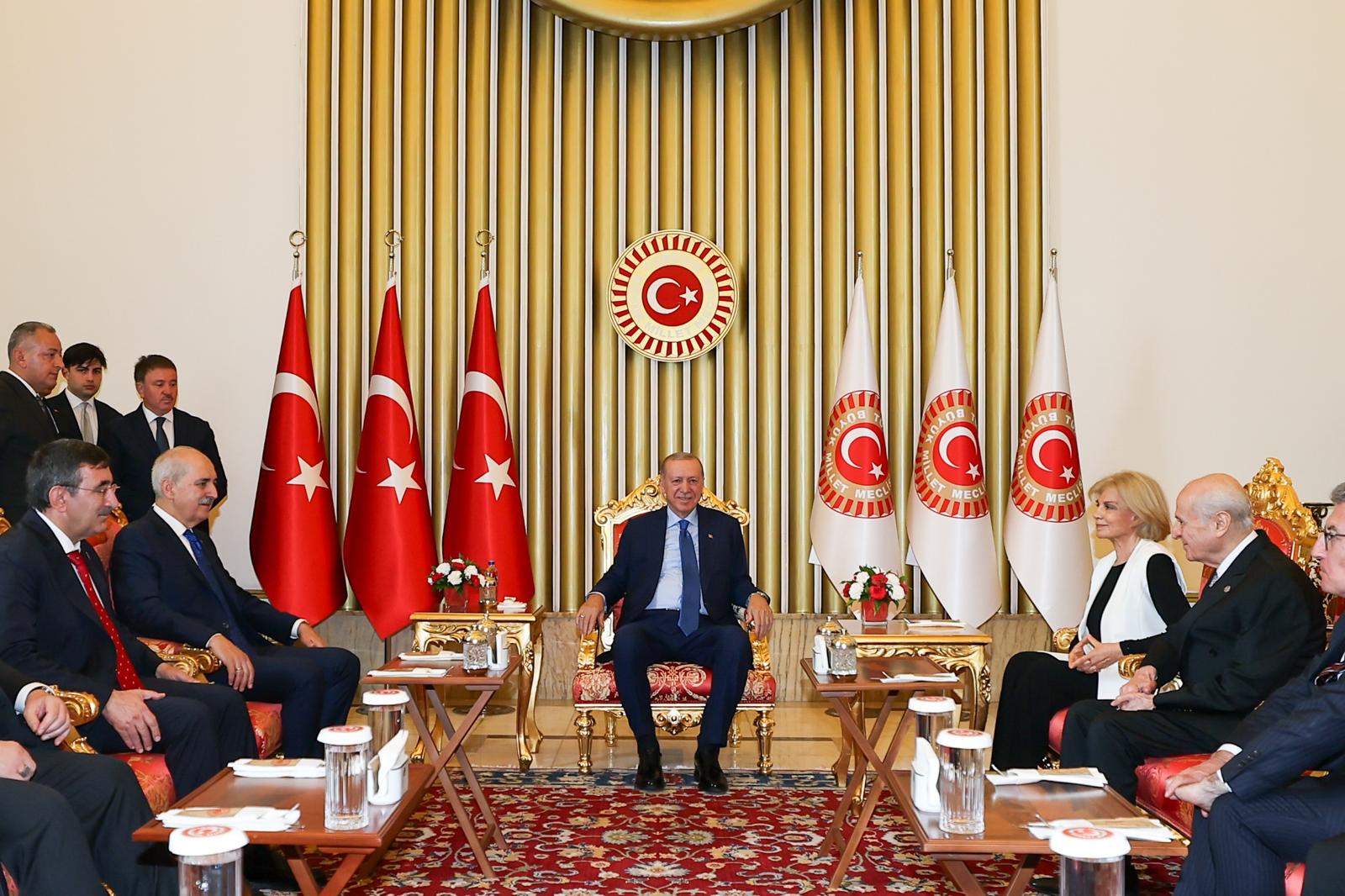 Törenin ardından Cumhurbaşkanı Erdoğan, TBMM Başkanı Numan Kurtulmuş, Cumhurbaşkanı Yardımcısı Cevdet Yılmaz, MHP Genel Başkanı Devlet Bahçeli, AK Parti Grup Başkanı Abdullah Güler, Meclis Başkanvekili Celal Adan, Cumhurbaşkanlığı Kabinesi üyeleri, BBP Genel Başkanı Mustafa Destici ve eski Başbakan Tansu Çiller ile bir süre sohbet etti.