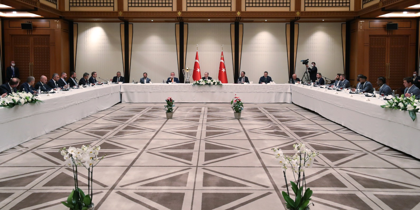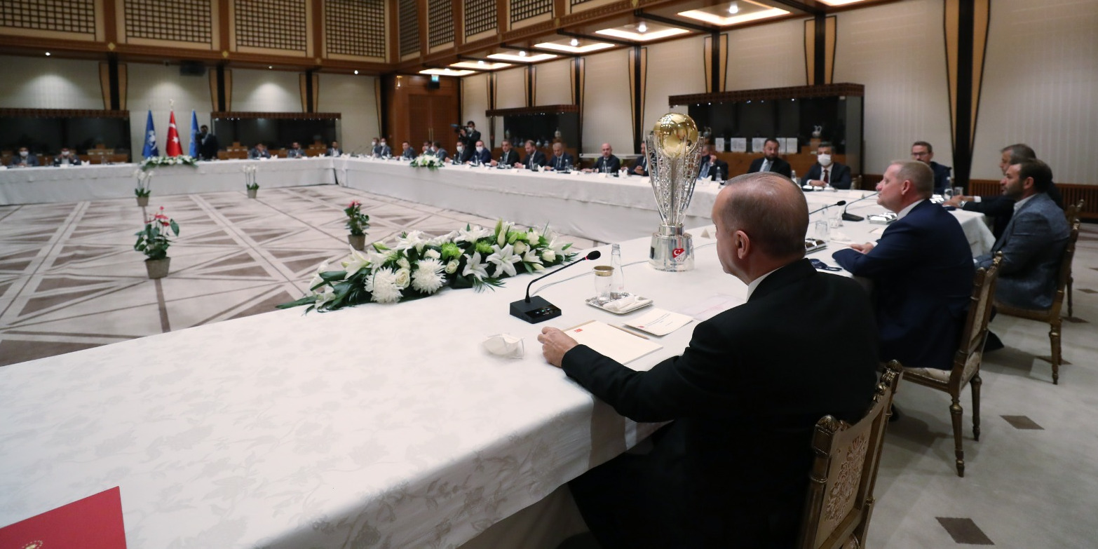 Cumhurbaşkanı Recep Tayyip Erdoğan, Süper Lig'de 2019-2020 sezonu şampiyonu Medipol Başakşehir'in Başkanı Göksel Gümüşdağ ile teknik heyet ve futbolcuları kabul etti.