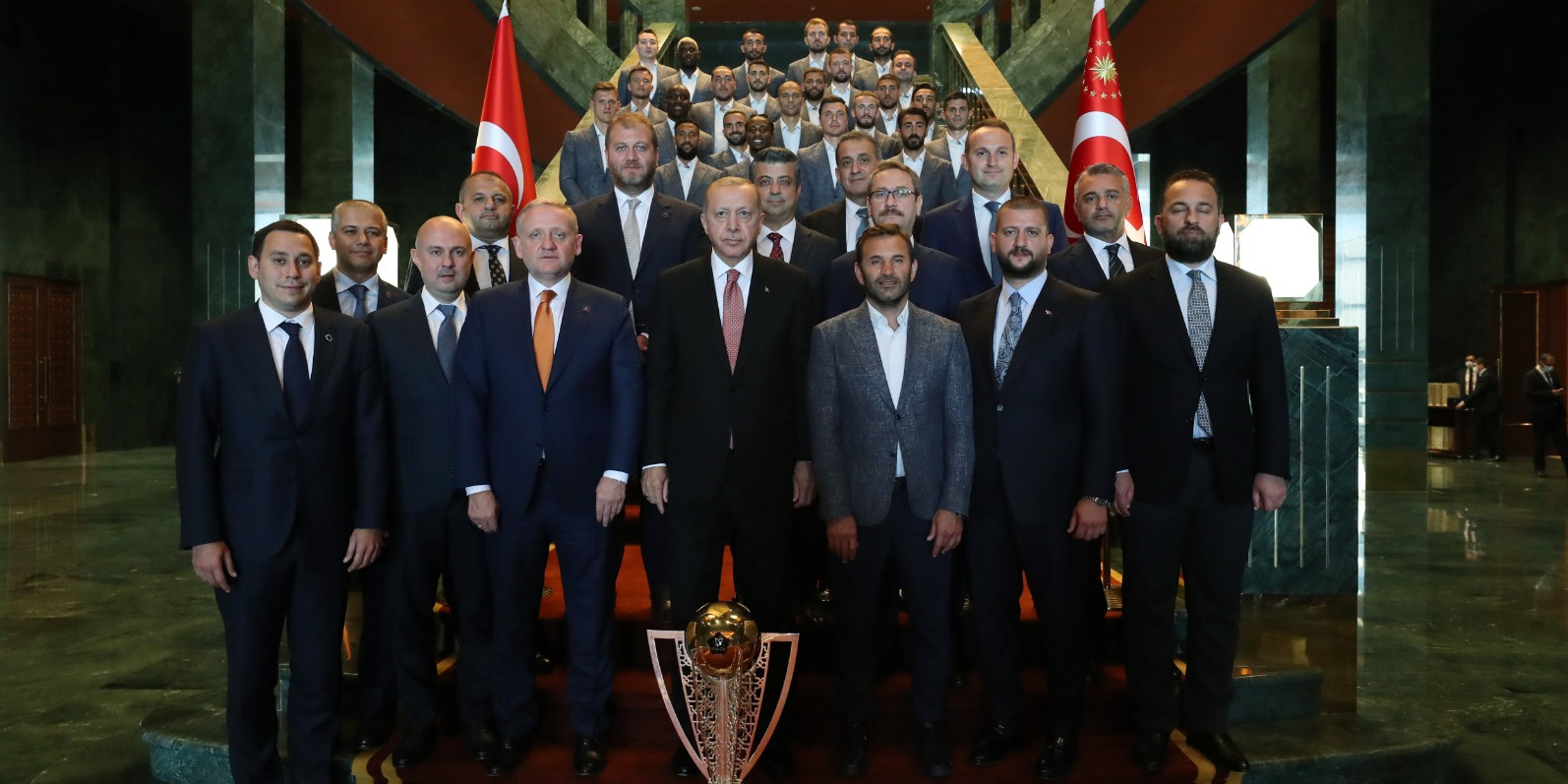 Erdoğan, kulüp yöneticileri, teknik heyet ve futbolcular, şampiyonluk kupası ile hatıra fotoğrafı çektirdi.