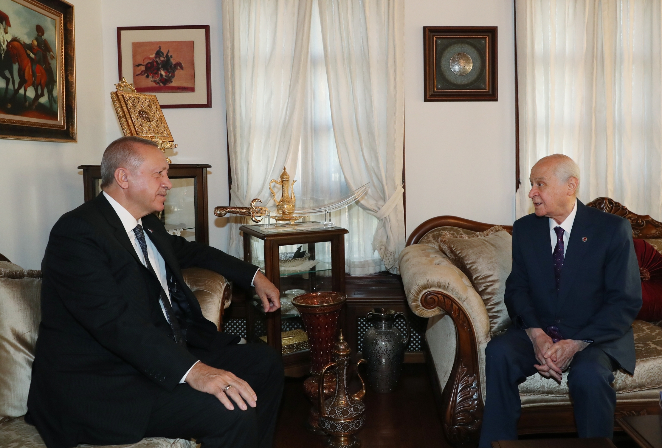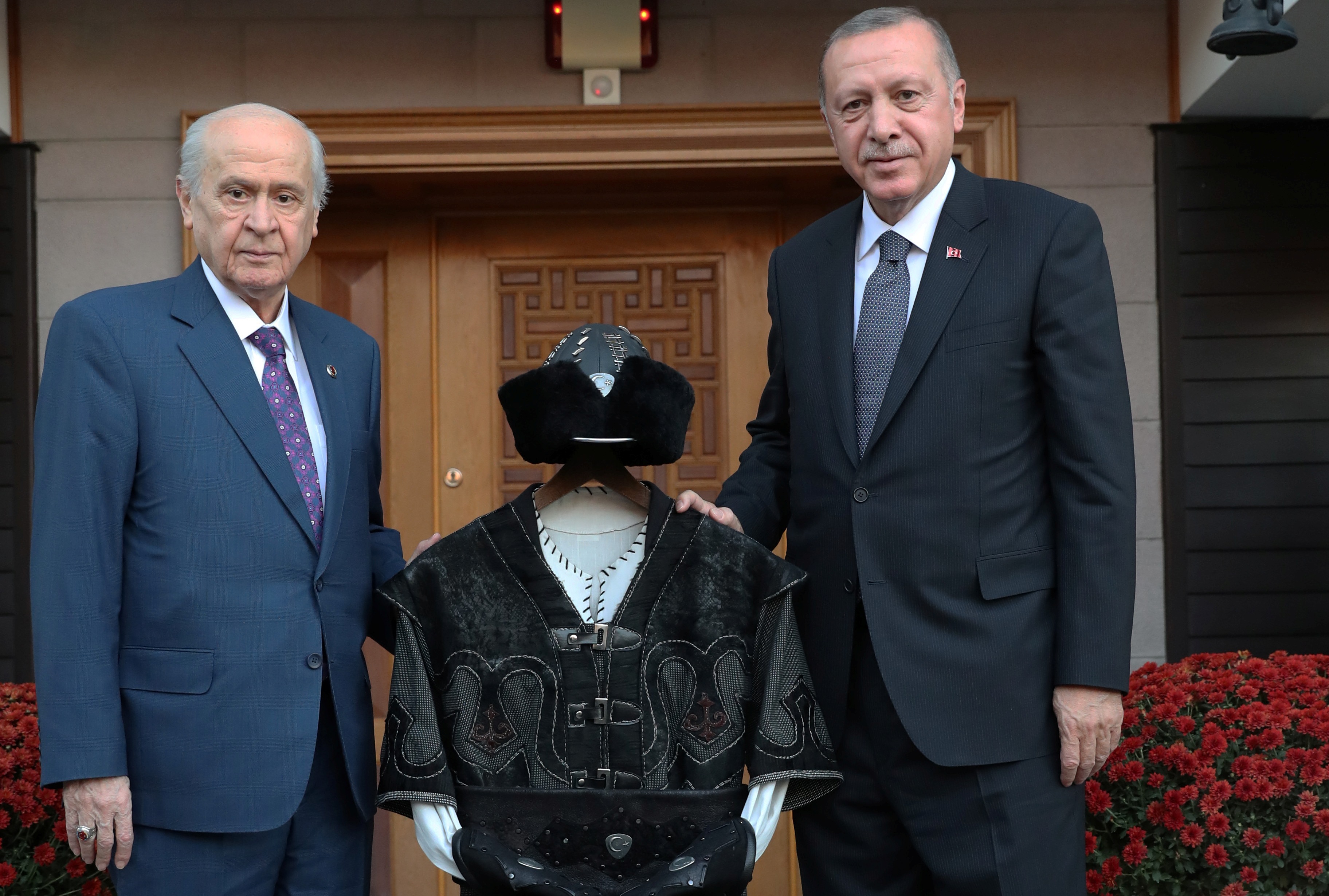 Görüşmenin sonunda Bahçeli tarafından Cumhurbaşkanı Recep Tayyip Erdoğan'a, "Hakan kaftanı" takdim edildi.