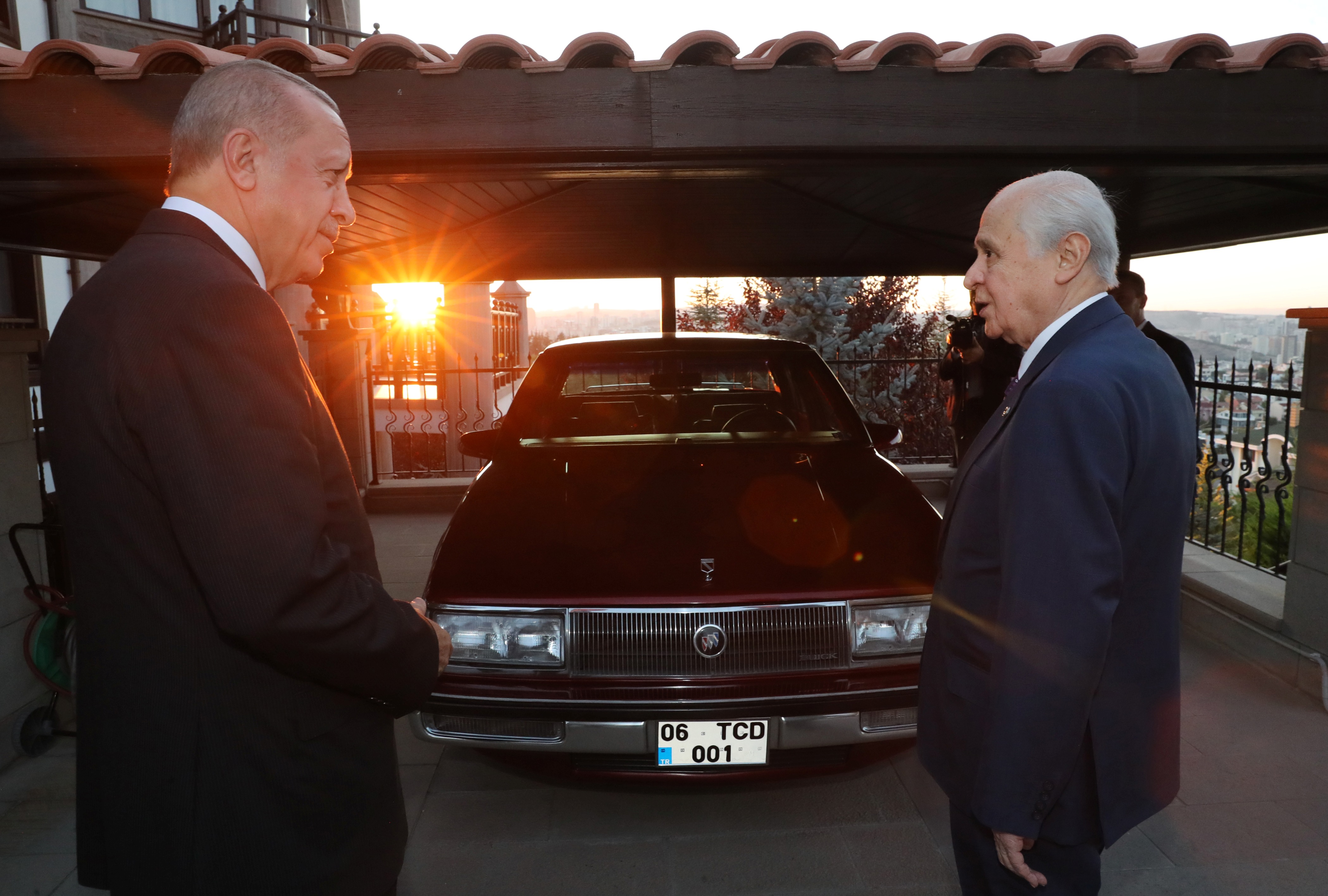 Bahçeli, Cumhurbaşkanı Erdoğan'a, kendisini ziyareti sırasında bahçesindeki klasik otomobilini gösterdi.